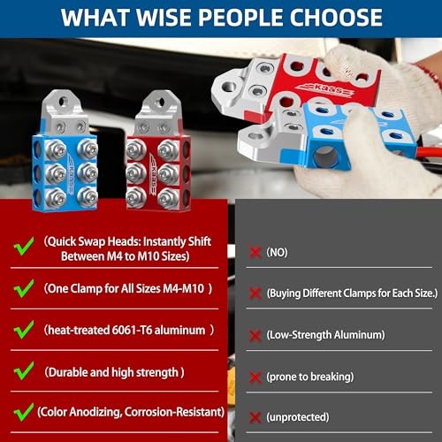 Menu 1. We require immediate payment. 2. We currently accept payment via eBay managed payments only. 3. Once payment is cleared, we will dispatch your shipment within 1-3 business days. Please refer to the "Shipping" tab for more information regarding shipping speed to your destination. Modular Heavy-Duty Battery Terminal, 8AWG to 4/0 AWG, Automotive Battery Terminals, Compatible with Bolt Down & Threaded Batteries, M8 (5/16”-18) Product description Innovative Split Design Battery Terminal: This terminal comes with an interchangeable head of a fixed size (M8), specifically designed for M8 lead-acid battery posts. Other head sizes (M4, M5, M6, M10, 1/4-20, 5/16-18, 3/8-16) are offered as optional accessories and can be purchased separately, facilitating easy customization for For Battery Type: Optimally designed for Lead Acid Batteries including AGM, GEL, WET, MF, and CA/CA types. Our battery terminal connectors are versatile, perfectly fitting various battery post types such as Side Post, Bolt Down, and Screw Down. Anodic Oxidation Removed to Form Conductive Zone: battery terminal block are crafted from heat-treated 6061-T6 aluminum alloy and precision-engineered through CNC machining, offering high accuracy and durability. These clamps feature unique color anodization for outstanding corrosion resistance. Additionally, for improved electrical performance, the area w the battery post and power cable connect has the anodic layer removed to establish a conductive zone, ensuring seamless conductivity. car battery terminal connector Compatibility: Our 6-hole, 12-Way battery clamps terminal are crafted to snugly accommodate 00 (2/0) AWG welding cables and are equally efficient with other gauges including 1/0 AWG, 2 AWG, 4 AWG, 6 AWG, and 8 AWG. A total capacity of up to 12 cables ensures adaptability for various car and car audio battery terminal needs. military battery terminals heavy duty Broad Applications: Our car battery terminal extender is designed to cater to a wide variety of vehicles, from common ones like cars, pickups, and motorcycles to larger units like caravans, RVs, buses, and trucks. Safeguarding Innovation: Patent Application Underway for Product Uniqueness and Customer Protection, Highlighting Our Dedication to Quality and Preventing Imitations. PLEASE MESSAGE US IF YOU HAVE ANY OTHER QUESTIONS, AND MANY THANKS FOR READING ALL OF THIS. Copyright ©#. All Rights Reserved.