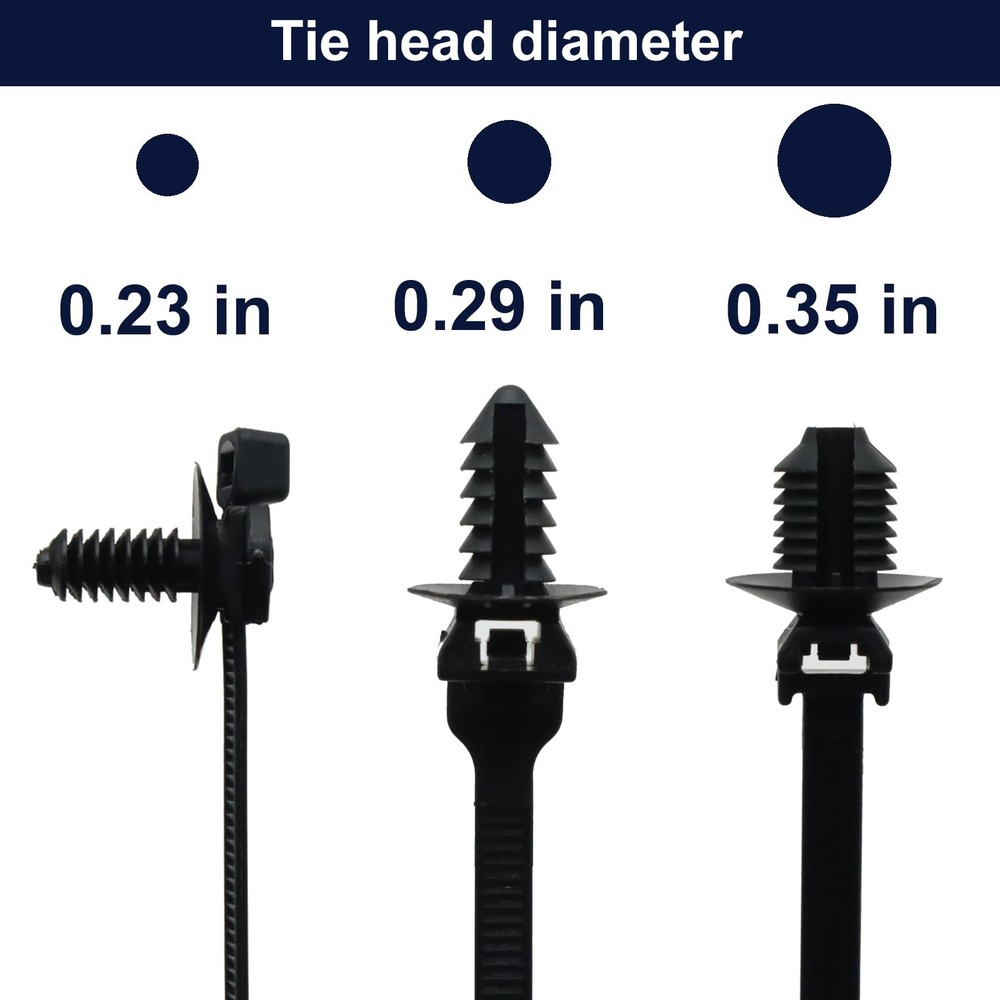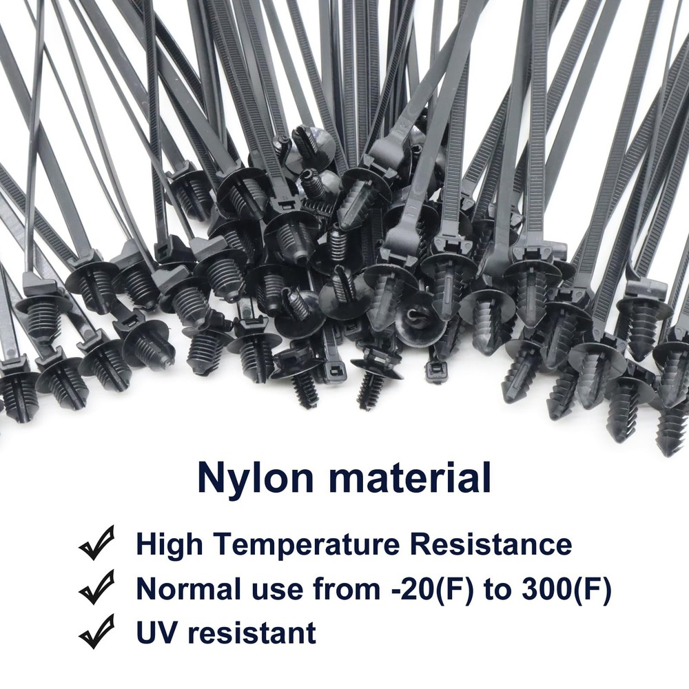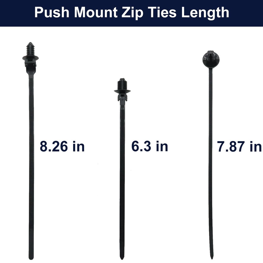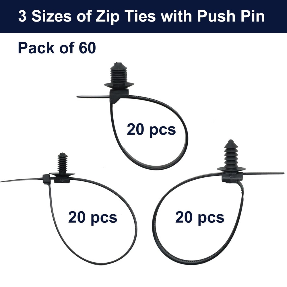 Universal engine bay wire harness restraint ties for Automotive Sets come in a variety of sizes and hold-down shapes to match existing bases or drilled holes great for securing electrical harnesses, cables, hoses and lines inside or outside of the vehicle Automotive Zip Ties: If you are repairing vehicle wiring or replacing some wiring in the engine compartment, this assorted push mount sizes wire harness zip ties will save you a lot of time. Package Includes:This set contains 60 pcs (3 types) push pin zip ties, various sizes push mount cable ties secure the wire harness to the original holes in the frame/engine compartment Components. UV and Flammable Retardant: Black cable tie mount with Push Pin Fir Tree Zip is made of high quality nylon material, which can stay tough in the temperature range of -40℉ to 266℉. Universal Purpose: This set of wire tie retainer christmas tree zip ties is suitable for securing wires, cables, and small hoses in the engine compartment; it can also be affixed to designated anchors to hold wires or other components in place. Applications:These automotive wire loom zip tie mounts are automotive maintenance essentials, commonly used to replace wire harness fastening cable zip ties on cars, trailers, boats, trucks.