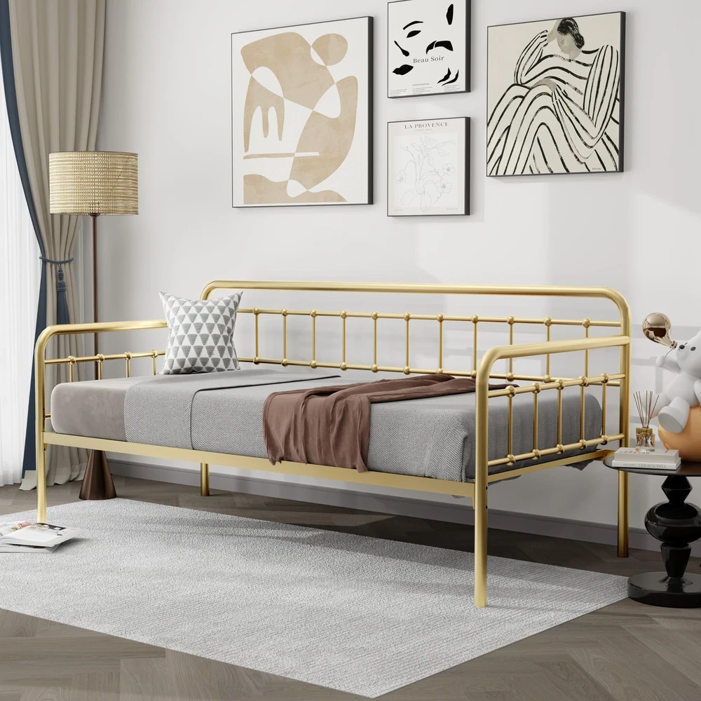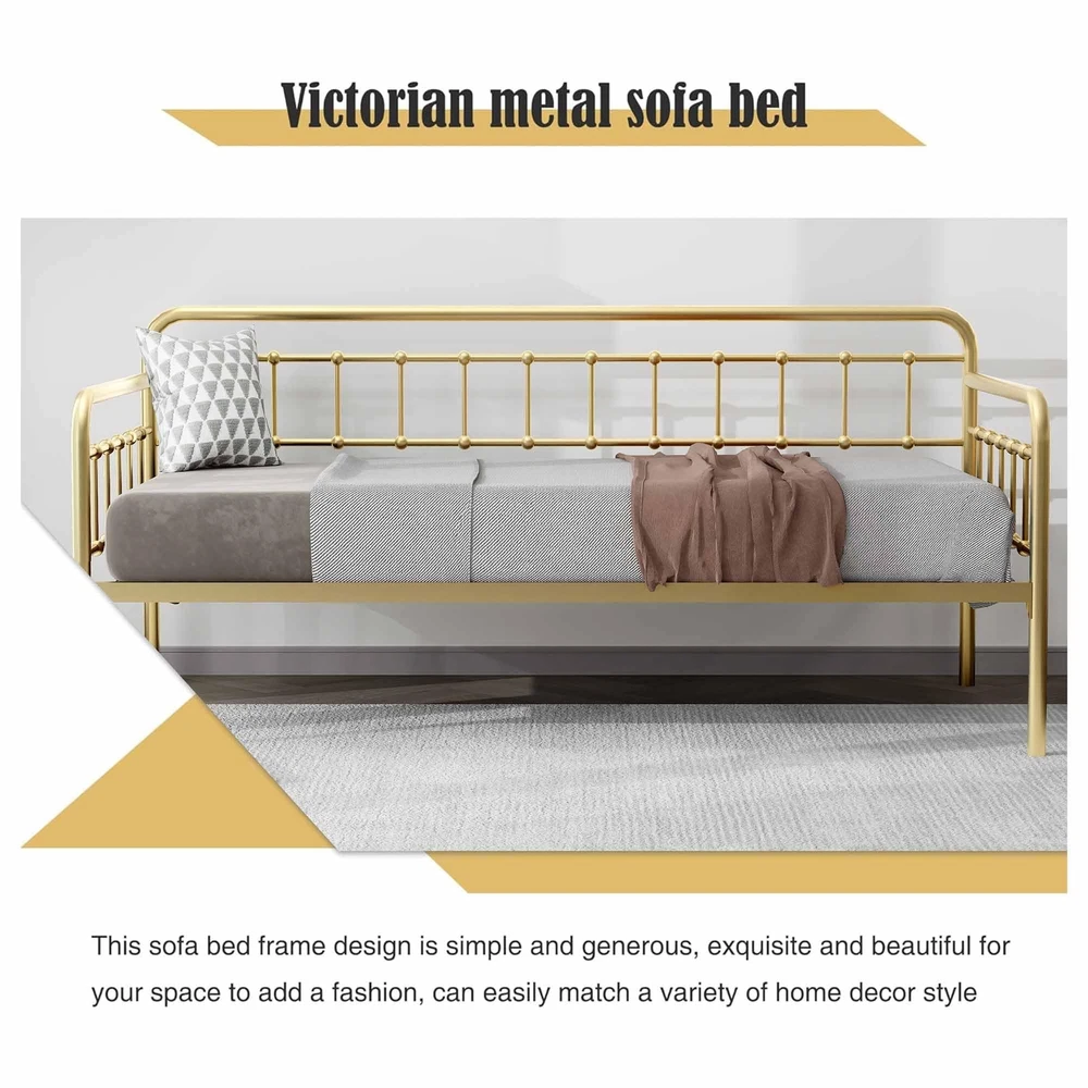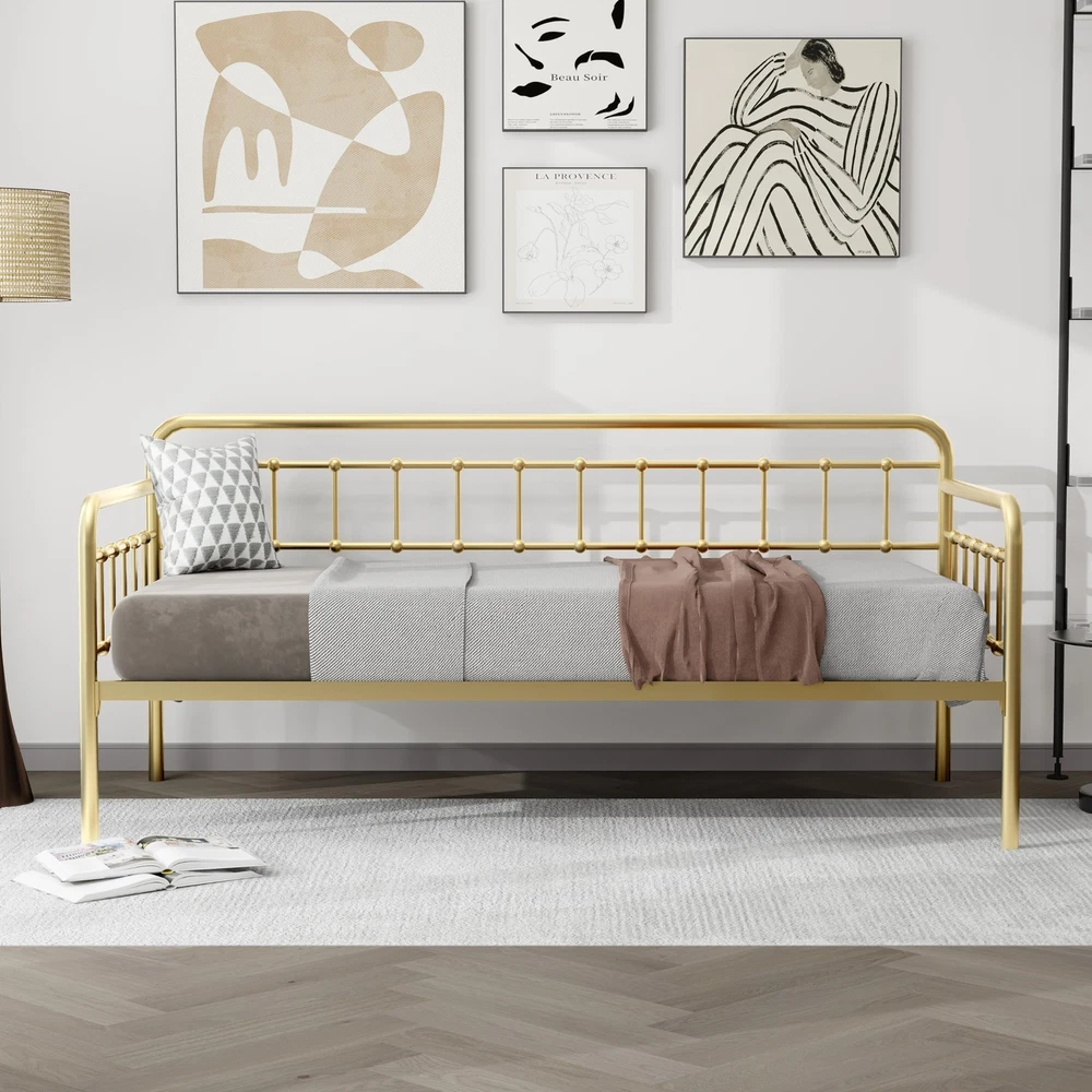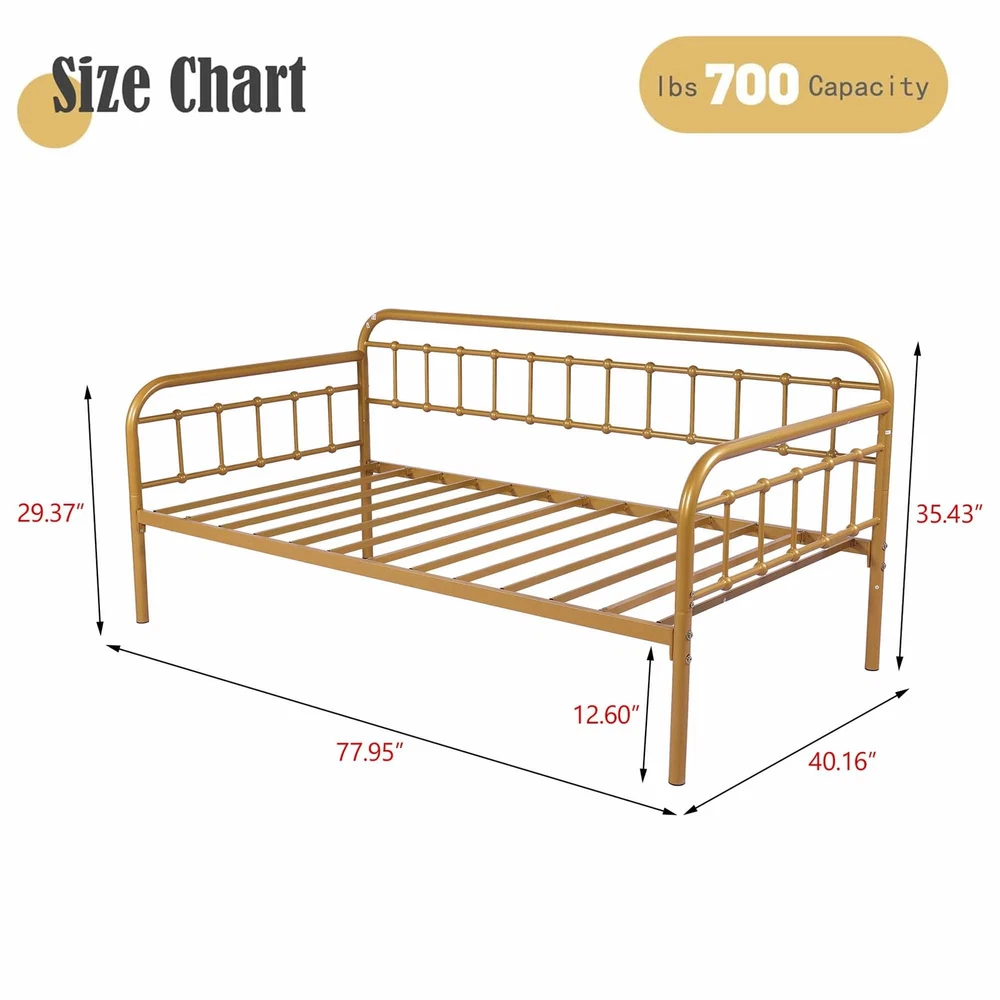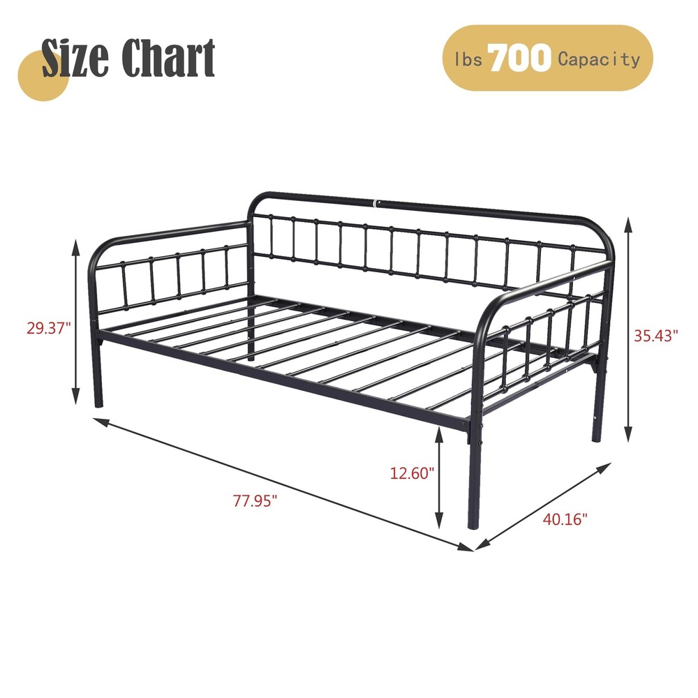 Footboard Height: 29 in Item Length: 77 in Mattress Included: No Care Instructions: Avoid Harsh Chemicals, Easy Care Finish: Metallic Number of Wheels: 0 Department: Adults Item Height: 35 in Number of Drawers: 0 Original/Reproduction: Original Maximum Weight Capacity: 500 lb Frame Material: Metal Type: Daybed Compatible Mattress Size: Twin Required Tools: Tools Include Mattress Features: Not Include Assembly Required: Yes Features: Assembly Instructions, Hardware & Tools Included, No Box Spring Needed, Storage Space, Steel Slat Support, Easy Assembly Mattress Type: No Brand: Zoophyter Pattern: Solid Product Line: Bed Frame Additional Parts Required: No Style: Industrial Upholstery Fabric: None Headboard Height: 35 in Model: Home Bed Item Width: 40 in Shape: Rectangular Mattress Firmness: Mattress is not include Item Weight: Less Than 50 lb MPN: Does Not Apply