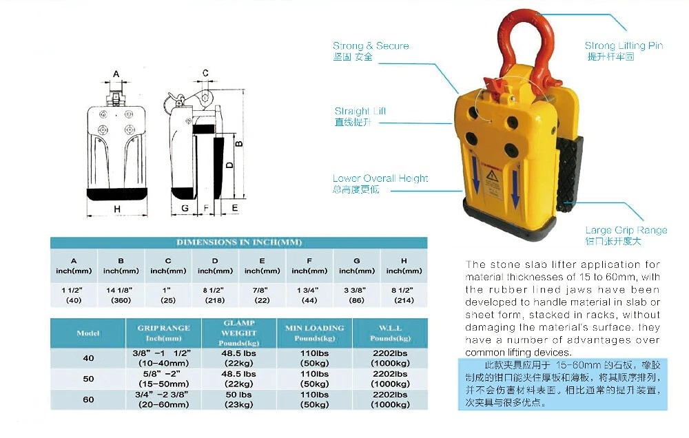 1000kg Stone Slab Lifter with White/Black Rubber Lined Grip Range 15mm-60mm Granite Marble Stone Slate Clip Lifting Tools Please note that the white rubber pad inevitably has some black stains in the factory production process, but it does not affect the use. If you mind black stains, please do not place an order. Thank you for understanding. This handheld stone slab lifter is designed to transport granite, marble, engineered stone slabs. These lifters have a compact design allowing them to operate in areas where little headroom or space between slabs is an issue. rubber on the clamps ensures the stone will not be damaged. These clamps can carry up to 2,200 lbs... The handheld stone slab lifter application for material thicknesses of 15 to 60 mm, with the rubber line jaws developed to handle material in slab or sheet from stacked in racks, without damaging the material's surface.