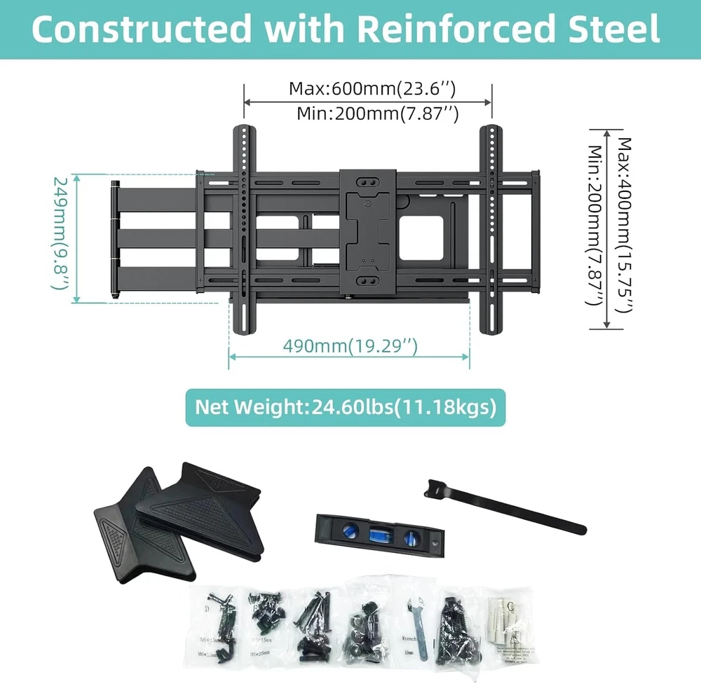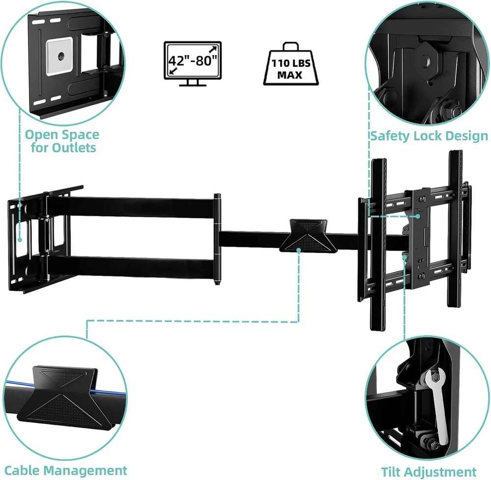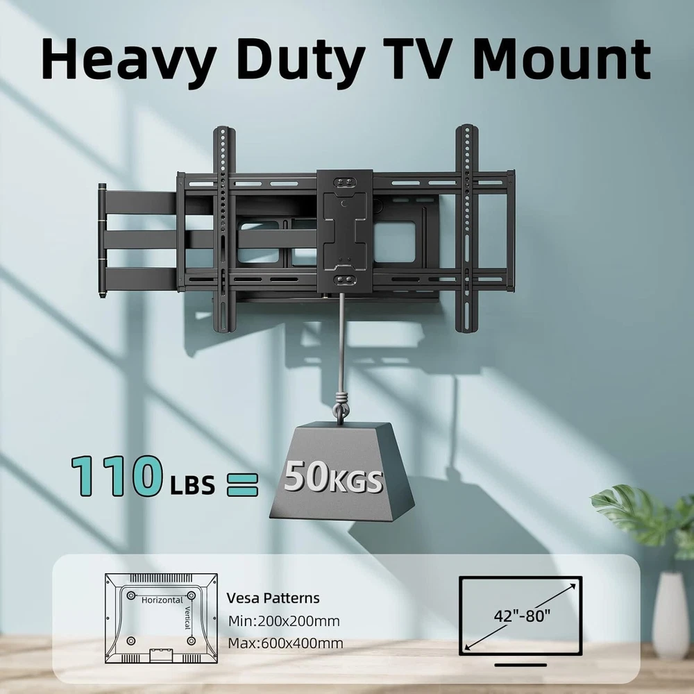 Heavy-Duty TV Mount for 42-80 Inch Displays, 43-Inch Full Motion Extension Arm ‹ › ‹ › ‹ › ‹ › ‹ › ‹ › ‹ › ‹ › ‹ › ‹ › ‹ › Heavy-Duty TV Mount for 42-80 Inch Displays Upgrade your viewing experience with this premium full motion TV mount designed for maximum flexibility and safety. Features: 43-Inch Extra Long Arm: Pull your TV out from the wall up to 43 inches to meet diverse viewing needs, and retracts to just 2.75 inches for space-saving convenience. Infinite Viewing Angles: Swivel left or right 180° and tilt 10° up or down to eliminate glare and optimize your experience, accommodating various seating arrangements. Wide Compatibility: Fits any flat or curved TV from 42 to 80 inches, compatible with major brands like Samsung, LG, Sony, and more. VESA patterns from 200x200mm to 600x400mm. Easy Installation: Includes pre-divided hardware and clear instructions for hassle-free wall mounting on wood studs, brick, or concrete walls. Level adjustment post-installation ensures a perfect fit. Safe and Stable: Heavy gauge steel construction with a robust 110lb load capacity offers peace of mind, reducing the risk of accidents due to earthquakes or playful mischief. Benefits: Maximize viewing pleasure by customizing the position of your TV. Wide-ranging compatibility means you can use this mount with almost any television. Safe construction guarantees long-term support for your device. The ideal solution for optimizing your space with a sleek and sophisticated design. Why Choose Our Heavy-Duty TV Mount? Are you ready to elevate your home entertainment setup? Our Heavy-Duty TV Mount combines exceptional strength, versatility, and ease of installation to create the ultimate viewing experience. No more awkward neck craning or limited angles; enjoy a seamless mix of style and functionality that enhances every room. Don't leave your TV's potential untapped—transform your space today with this must-have mounting solution! Shipping Free & Fast Shipping - We offer free shipping to most of the USA with a normal delivery time of 3-7 days. However, due to the current situation, additional delivery time (up to 3 weeks) may be required for some items. Alternative Carriers - We may use alternative carriers (e.g. USPS, FedEx, UPS, etc.) to ensure your package arrives safely and on time. Due to the use of multiple carriers, we are unable to provide a tracking number automatically. Handling Time - Orders are processed and shipped within 1-2 business days of receiving cleared payment. Shipping Restrictions - Shipping to Alaska, Hawaii, Puerto Rico, Guam, and other US territories may incur shipping charges or delivery restrictions. Please contact us before ordering, or your order can be refunded/cancelled. State Restrictions - There may be restrictions based on your state of purchase. For example, certain items may not be shipped to California due to state regulations. Contact for Tracking Updates - If you require tracking updates or have any concerns about the delivery of your order, please feel free to contact us, and we will be happy to assist you. Return 30-Day Hassle-Free Returns - We want you to be completely satisfied with your purchase. If you are not, you can return the item within 30 days of receiving it for a full refund or exchange. Easy Return Process - To start a return, simply contact us and we will provide you with a prepaid return shipping label and detailed instructions. Restocking Fee - There are no restocking fees for returns. However, the buyer is responsible for return shipping costs if the return is not due to a seller's error. Refund Processing Time - Refunds will be processed within 5 business days of receiving the returned item in its original condition. Payment We accept all major credit cards, PayPal, and Apple Pay for your convenience. Your payment information is secure and encrypted to ensure a safe and seamless transaction. Please complete your payment within 3 days of purchase to avoid any delays in shipping. Feedback Your feedback is extremely important to us. We strive to provide the best products and customer service possible. If you are satisfied with your purchase, please take a moment to leave us a positive review. If you have any concerns or issues with your order, please contact us before leaving negative feedback. We are committed to resolving any problems and ensuring your satisfaction. Contact Us If you have any questions or concerns, please feel free to reach out to our customer support team. You can contact us through the eBay messaging system. We are available Monday to Friday, 9:00 am to 5:00 pm EST, and we will do our best to respond to your inquiry within 24 hours. Buy it now and enjoy a pleasant shopping experience! UPC: Not Set Maximum Weight Fitment: 110 lb Unit Quantity: 23.9 Year Manufactured: Not Set VESA Hole Pattern: Not Set Features: Articulating arms Brand: Unbranded Type: Full Motion Maximum Screen Size Fitment: 80 in MPN: Not Set Unit Type: lb Color: Black Country/Region of Manufacture: Not Set Manufacturer Warranty: Not Set