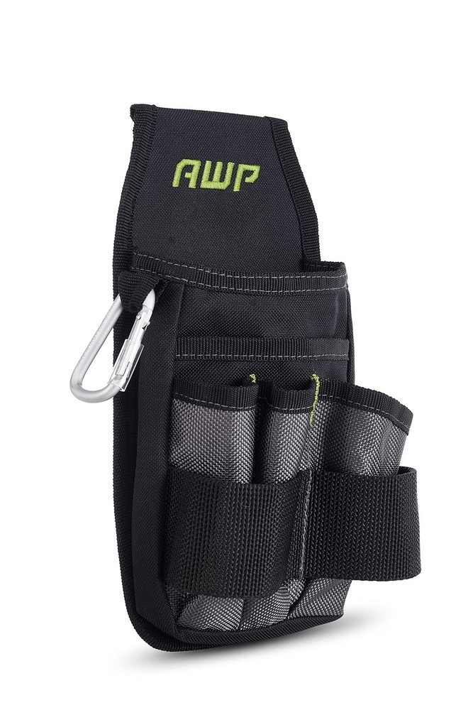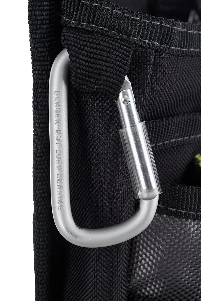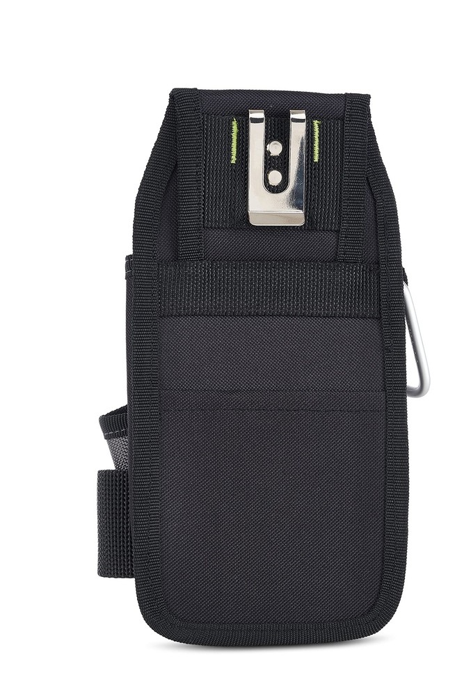 Tool Pouch with belt clip features 7 pockets and loops to ensure your tools are organized and close at hand Constructed from water-resistant reinforced polyester that is built to handle any conditions on the jobsite Includes carabiner snap hook for attaching small tools or keys. Also features interior elastic organization pockets, making it ideal as an electrician tool pouch, as well as for other worksite projects Attach the tool pouch to your tool belt with tunnel loop or metal clip The tool pouch features a black and green design