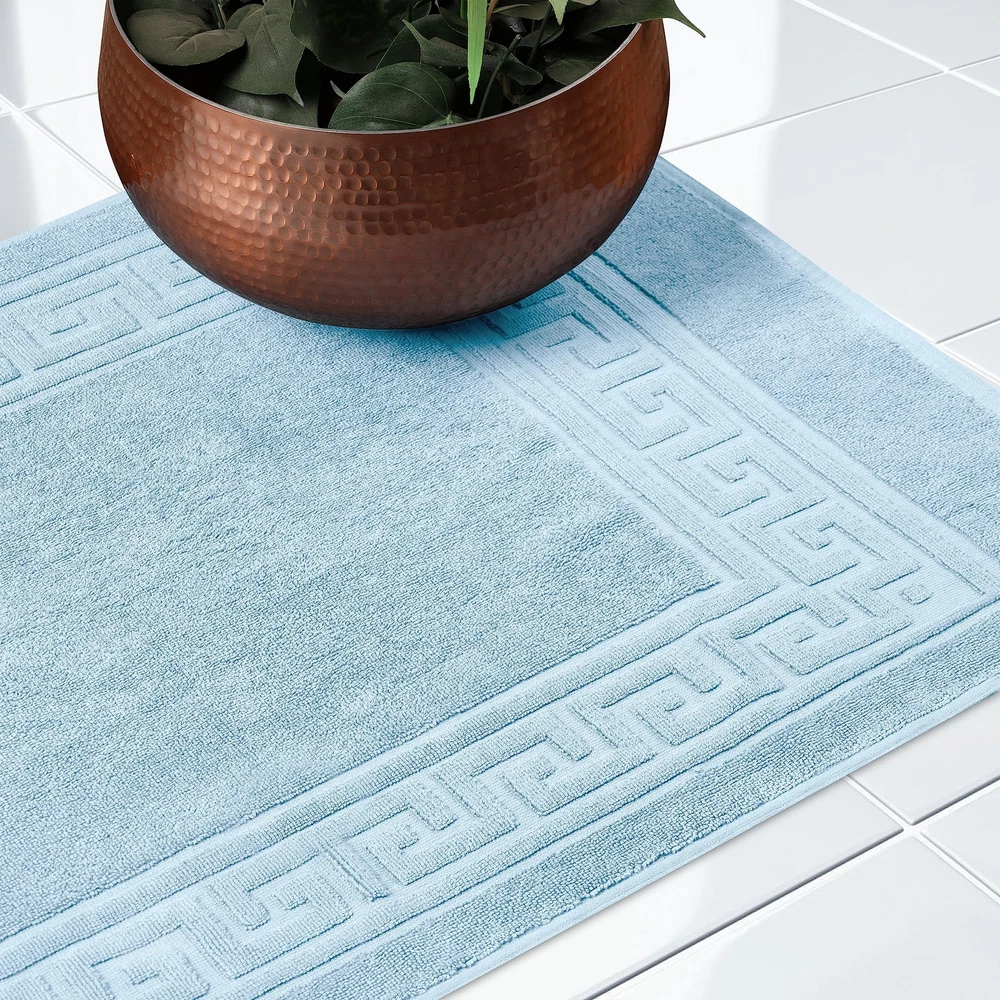MAXIMUM ABSORBENCY: Made from 100% Cotton, this bathroom rug set offers absorbency compared to thinner bath mats; enjoy cloud-like comfort when you step out of your shower or bath; Choose from 15 gorgeous colors TWO-PIECE SET: Enjoy the convenience of this two-piece bath rug set, measuring 22" x 35" each, to outfit both your main and guest bathroom; transform your bathroom to a mini spa with this stylish duo; perfect for shared, large, or multiple bathrooms ELEGANT DESIGN: The traditional Greek key design will add an elegant touch to your bathroom decor and coordinate beautifully with your existing decor; Enjoy hotel luxury in the comfort of your home with these soft spa and hotel quality bath mats CARE INSTRUCTIONS: Easy to care for, simply toss these bath mats in the washing machine and tumble dry on low or air dry whenever needed; Always follow care label instructions for best results EXCELLENT GIFT: Our designs match a variety of styles and make great gifts; perfect for friends and family; we're committed to make products safer for you and safer for the world; this product is OEKO-TEX certified for safety and sustainability