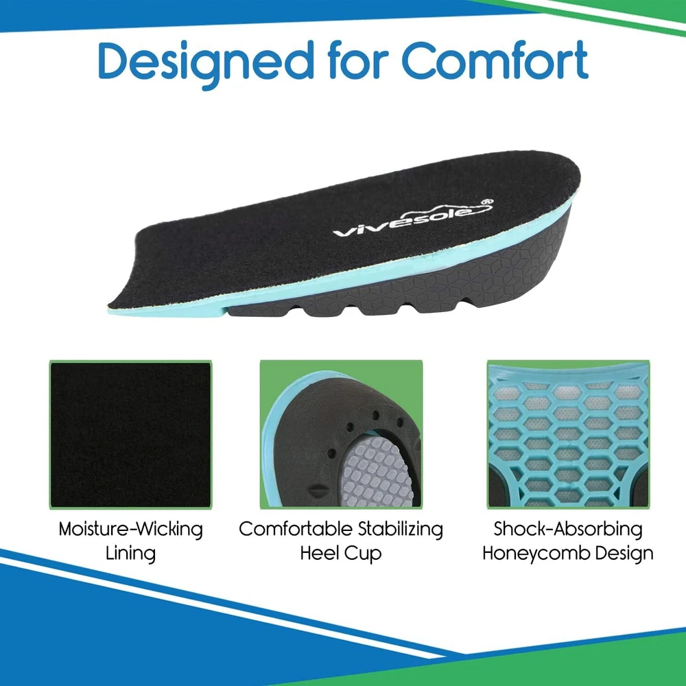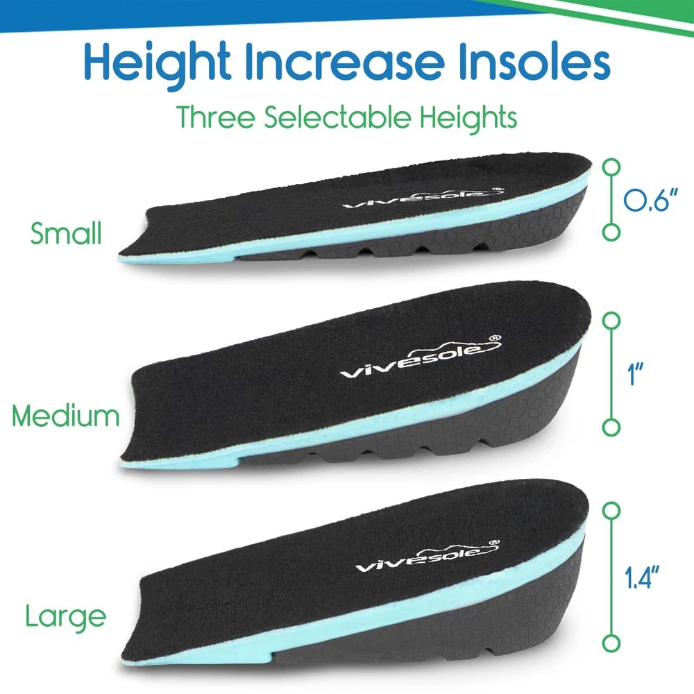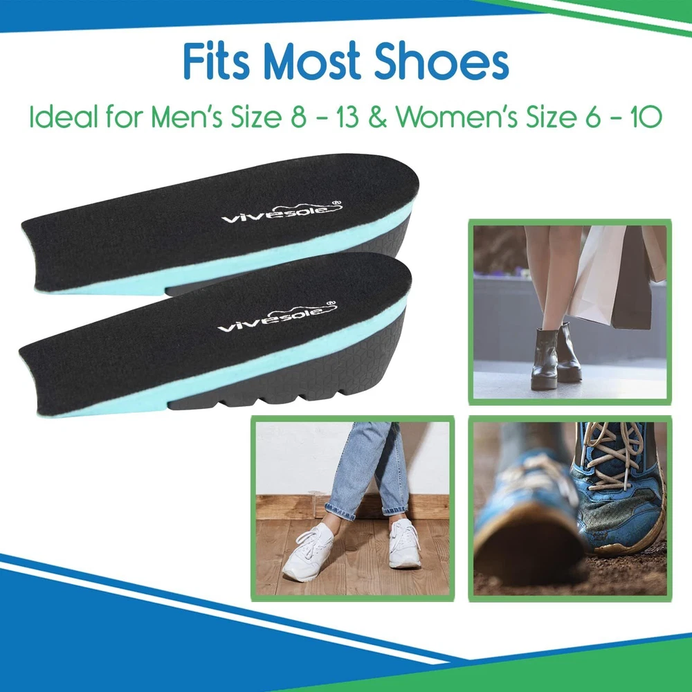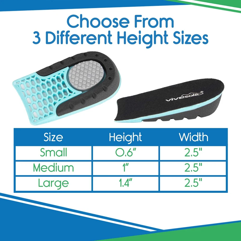 GET TALLER INSTANTLY: The Heel Lift Inserts instantly increase your height and improve posture, making you appear taller and more confident. Perfect for resolving leg length discrepancies and cushioning painful heel spurs and plantar fasciitis. COMFORT & SUPPORT: The unique honeycomb design of the gel inserts absorbs impact and reduces pressure points, providing superior cushioning and support for all-day comfort. The U-shaped heel cup stabilizes the foot for optimal support. ONE SIZE FITS MOST: The heel lift inserts fit US men's sizes 8-13 and women's sizes 6-10 and are available in three height options—0.6 inches, 1 inch, and 1.4 inches—perfect for dress, casual, and athletic shoes. STAY COOL & FRESH: The soft, moisture-wicking lining of the inserts keeps your feet cool, dry, and odor-free, ensuring maximum comfort and hygiene. 60-DAY : We are confident in the quality and effectiveness of our heel lift inserts. If you're not satisfied with your purchase, we offer a 60-day money-back .