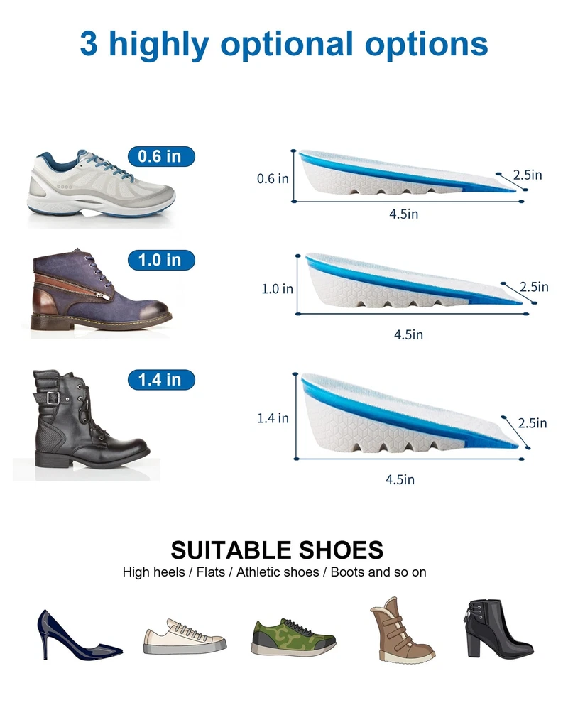 【Invisible Shoe Lifts】shoe inserts for height increase is invisible increase the height,The height of the pad is 0.6 inches, 1.0 inches and 1.5 inches,Heel lifts for shoes is perfect for a meeting, speech,have a date, wedding, shopping, or any event where there is a camera lurking about 【Heel Pain Relief】The heel lift inserts cushions are great for uneven legs, Heel spurs, Heel Pain, Sports Injuries, Achilles tendonitis and other clinical conditions.Heel insert pads can maximum shock absorption,provides added heel protection 【Premium Materials】The heel grips for womens shoes are made of soft and durable silica gel and sweat absorbent fabric,The upgraded design solves the problem of easy separation between components,It's really soft, yellow in the middle has a good prop effect that doesn't collapse, soft, very comfortable 【FIT Most Shoes】The heel grips for womens shoes is soft washable and breathable heel pads,These heel cushion inserts are easy to apply.It's suitable for various shoes such as high-heels, running shoes, dress shoes, boots, sneakers, work shoes, leather shoes, etc. 【Customer-Oriented】 If you encounter any issues with our heel lift ,please us by “My Order - the Seller”,we will provide an effective and reliable reply within 24 hours.Please help don't return your used products to warehouse,we don't want our next customer to buy the products you have used,Thanks a lot.