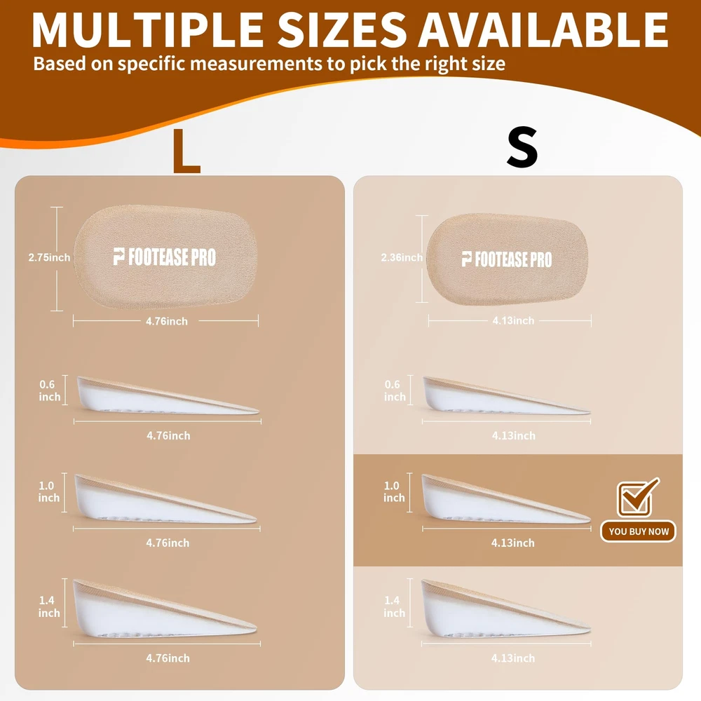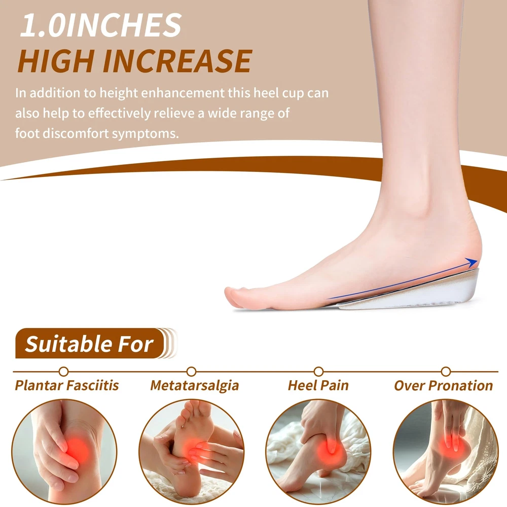 【Adjustable Height for Every Occasion】Get the boost you need with our adjustable gel heel lifts, offering three height options to suit any situation. Whether you're dressing up for a formal event or running errands, enjoy instant height and added confidence with ease 【Premium Gel Cushion for All-Day Comfort】Crafted from high-quality gel and soft fabric, our heel inserts provide excellent cushioning and pressure relief. Stay comfortable whether you're on your feet all day at work or enjoying a night out—these insoles keep your feet feeling fresh and supported. 【Shock Absorption for Pain Relief】Designed to alleviate heel pain, Achilles tendonitis, plantar fasciitis, and other foot discomforts, our gel inserts absorb shock with every step. Say goodbye to foot pain and hello to more comfortable, pain-free walking, running, or standing. 【Non-Slip Design for Stability】Featuring a slip-resistant base, our heel lifts stay securely in place within your shoes, no matter how active you are. Enjoy stability and confidence, knowing your inserts won’t shift or move around while you're on the go. 【100% Satisfaction Guaranteed】We're confident you'll love the comfort and support our gel heel lifts provide. If you're not fully satisfied, we offer a 100% satisfaction —just reach out to us, and we'll ensure you're taken care of with either a or .