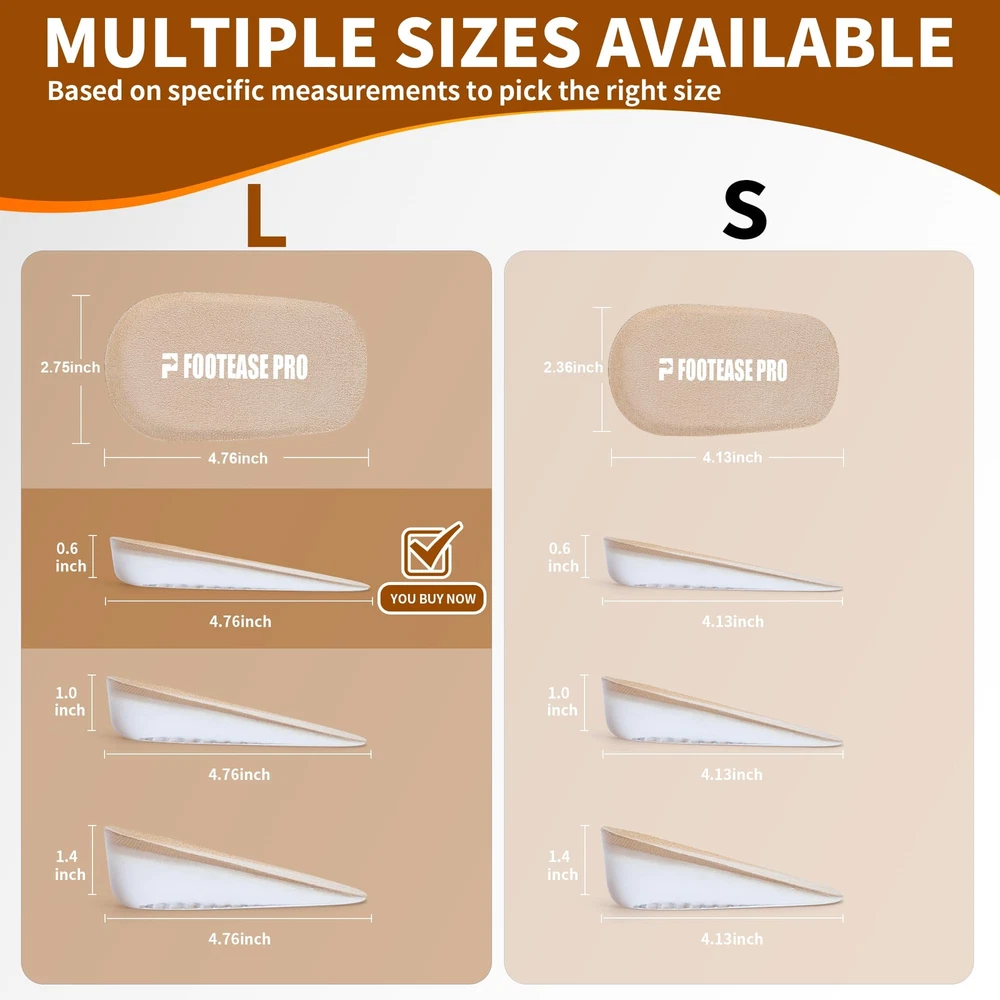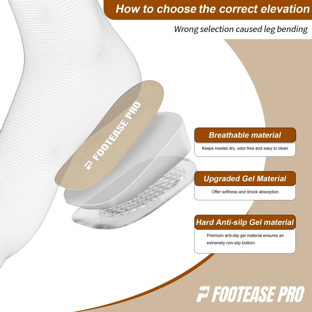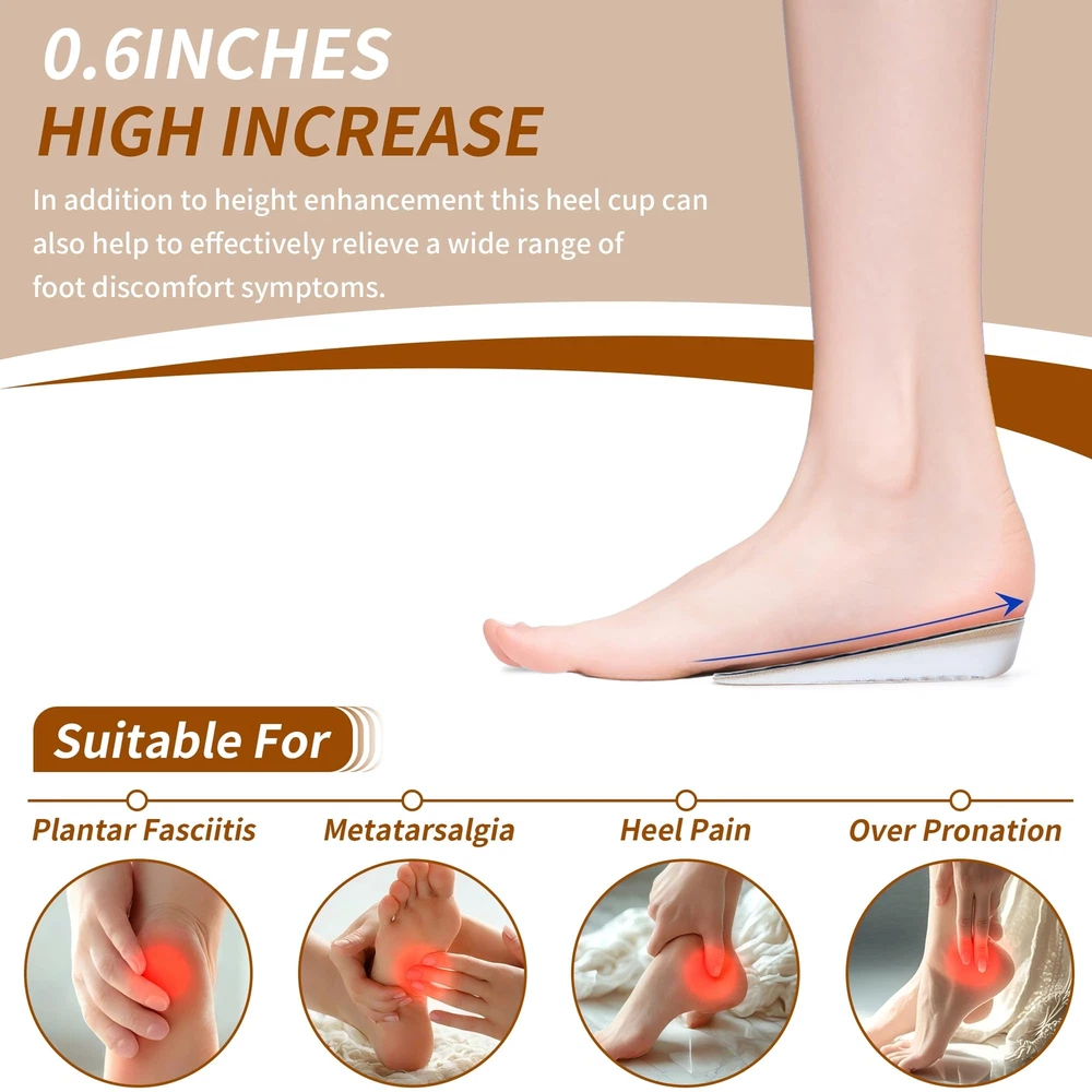 【Adjustable Height for Every Occasion】Get the boost you need with our adjustable gel heel lifts, offering three height options to suit any situation. Whether you're dressing up for a formal event or running errands, enjoy instant height and added confidence with ease 【Premium Gel Cushion for All-Day Comfort】Crafted from high-quality gel and soft fabric, our heel inserts provide excellent cushioning and pressure relief. Stay comfortable whether you're on your feet all day at work or enjoying a night out—these insoles keep your feet feeling fresh and supported. 【Shock Absorption for Pain Relief】Designed to alleviate heel pain, Achilles tendonitis, plantar fasciitis, and other foot discomforts, our gel inserts absorb shock with every step. Say goodbye to foot pain and hello to more comfortable, pain-free walking, running, or standing. 【Non-Slip Design for Stability】Featuring a slip-resistant base, our heel lifts stay securely in place within your shoes, no matter how active you are. Enjoy stability and confidence, knowing your inserts won’t shift or move around while you're on the go. 【100% Satisfaction Guaranteed】We're confident you'll love the comfort and support our gel heel lifts provide. If you're not fully satisfied, we offer a 100% satisfaction —just reach out to us, and we'll ensure you're taken care of with either a or .