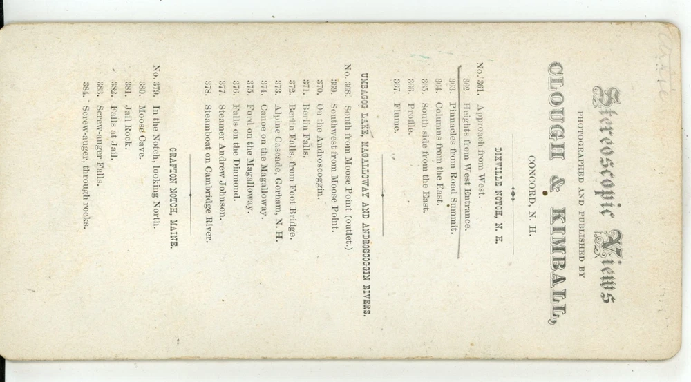 Heights from West Dixville NH New Hampshire Clough & Kimball Stereoview c1870 Heights from West Dixville NH New Hampshire Clough & Kimball Stereoview c1870 Antique Real Photo Stereoview Condition - Please refer to photos to assess, curved mounts may appear with a rainbow affect on top and bottom of photos Please See our other views. We do combine shipping. For our International bidders: We offer Free overseas shipping with the purchase of 5 or more views Keyword Search: Stereo View Stereoscope Stereograph Stereoscopio Listing and template services provided by inkFrog