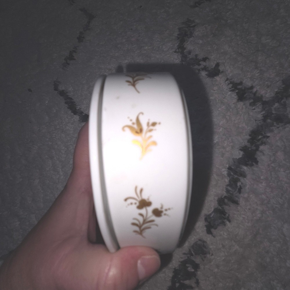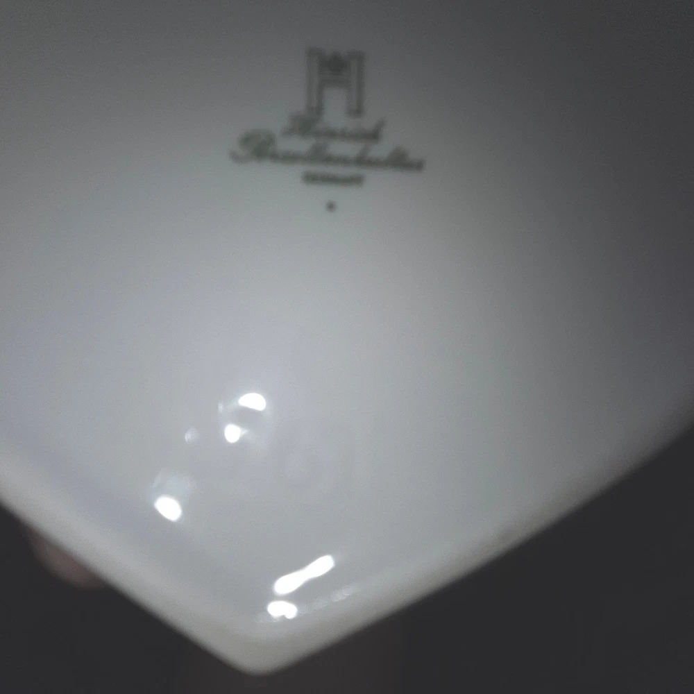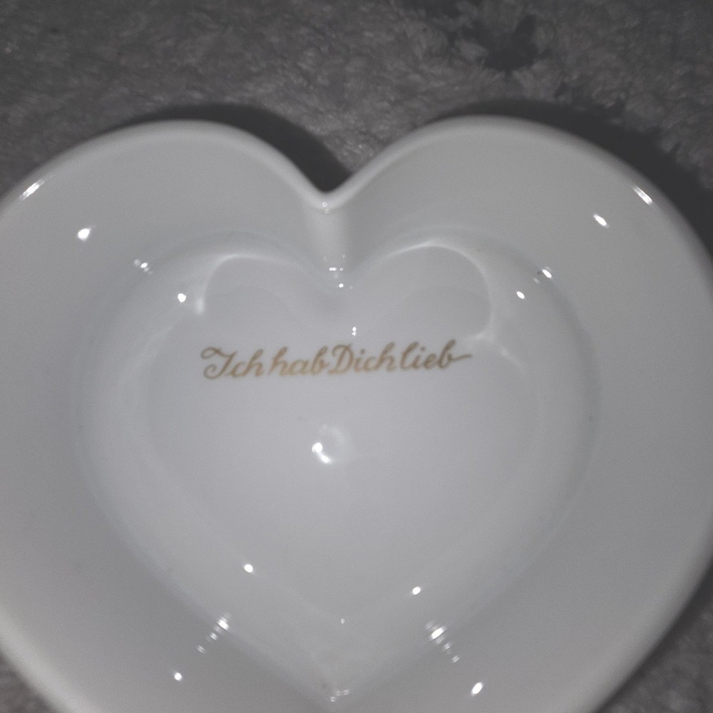 A touch of romance arrives in this heart-shaped trinket box, perfect for safeguarding your most cherished keepsakes. The lid features a delicate design of stylized birds and floral accents in shimmering gold, adding a touch of elegance to any space. Inside, a sweet inscription in German, "Ich hab Dich lieb" (I love you), adds a personal and heartfelt touch. This charming box is ideal for holding jewelry, small mementos, or as a decorative piece on a vanity or bedside table. It would also make a thoughtful gift for a loved one on Valentine's Day or an anniversary. Keywords: Heinrich, Porcelain, Trinket Box, Heart Shaped, Birds, Gold Accent, Germany, Vintage, Keepsake Box, Jewelry Box, Decorative Box, Romantic Gift, Valentine's Day, Anniversary Gift