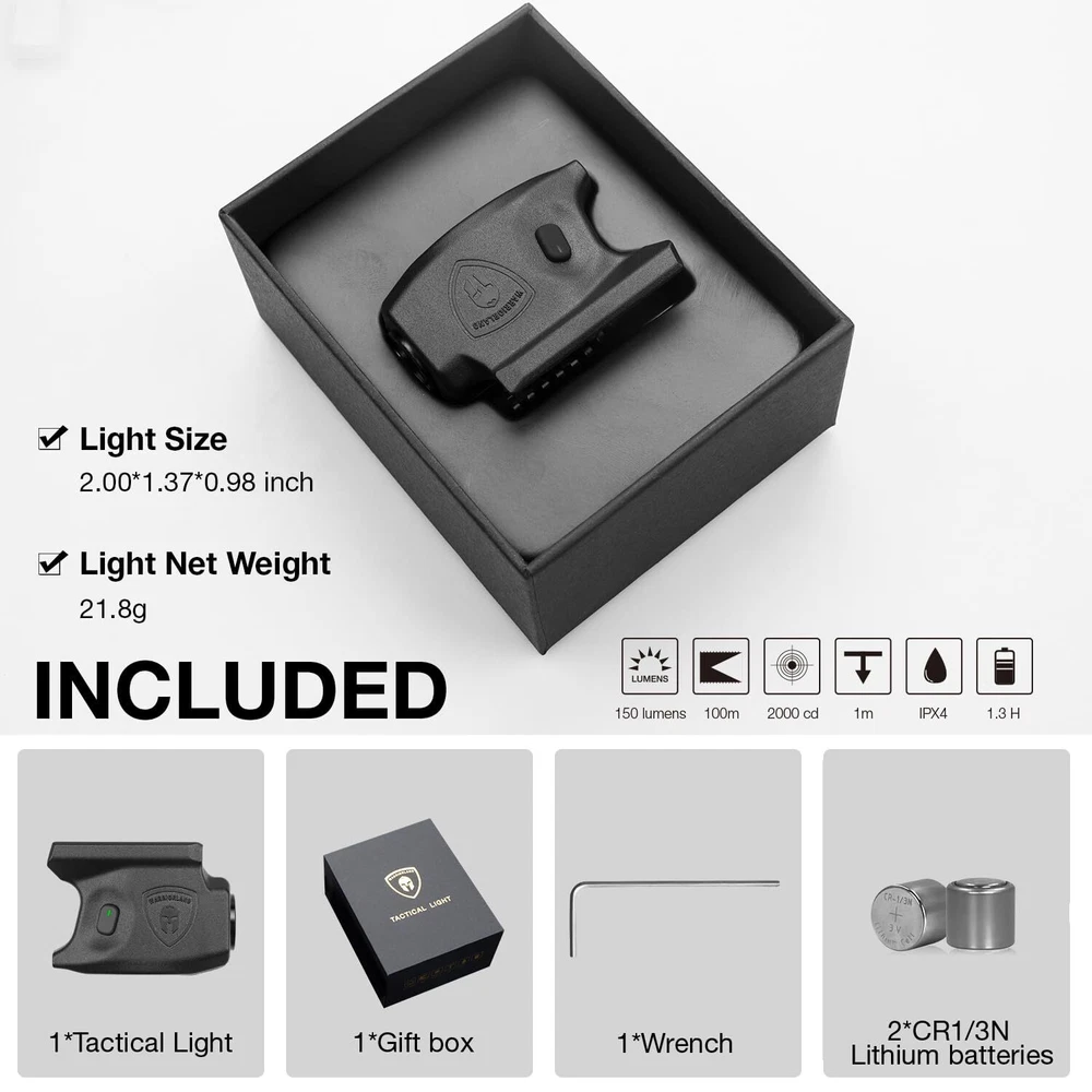 Hellcat Mini Light Tailored Made for Springfield Armory Hellcat , 150 Lumens Hellcat Handgun Light, LED Tactical Flashlight SL-1 MINI SIZE - Mini Size, and Hellcat tactical light's appearance are custom made to fit the contour of Springfield Armory Hellcat Micro Compact BATTERY INDICATOR - Battery indicate when you press any button - Green light indicates battery power upon 70%, Yellow light indicates battery power between 30%-70%, Red light indicates battery power below 30% IPX4 & 1M IMPACT- Protect Hellcat light from splashing water, no matter the direction - Passed 1 meters drop test 4 DIFFERENT LIGHT MODES - Tactical Light Mode / Constant Light Mode / Strobe Mode / Moonlight Mode US DRIVER CHIP - By using US LED driver chips, light can turn on with lower power consumption - Improving the efficiency of rectification HUMANIZED OPERATION DESIGN - The right / left operation button position are designed to fit both men and women's finger operate COMPATIBILITY - Tailored for Springfield Armory Hellcat 3’’ Micro Compact , also with Hellcat RDP and Hellcat - Equipped with a Right Hand IWB kydex holster (Hellcat and Hellcat RDP barrel would come out from holster about 0.7 Inch) WHAT YOU GET - 1*Tactical Light / 1*User Manual / 1*Wrench / 1*Cleaning Cloth / 2*CR1/3N Lithium Batteries OUTPUT - SL-1 tactical light for Springfield Hellcat maximum output of 150 lumen - beam distance of 100 meters