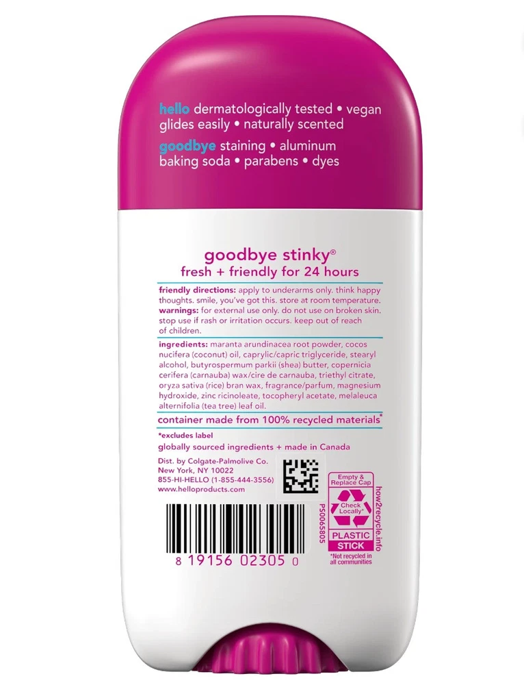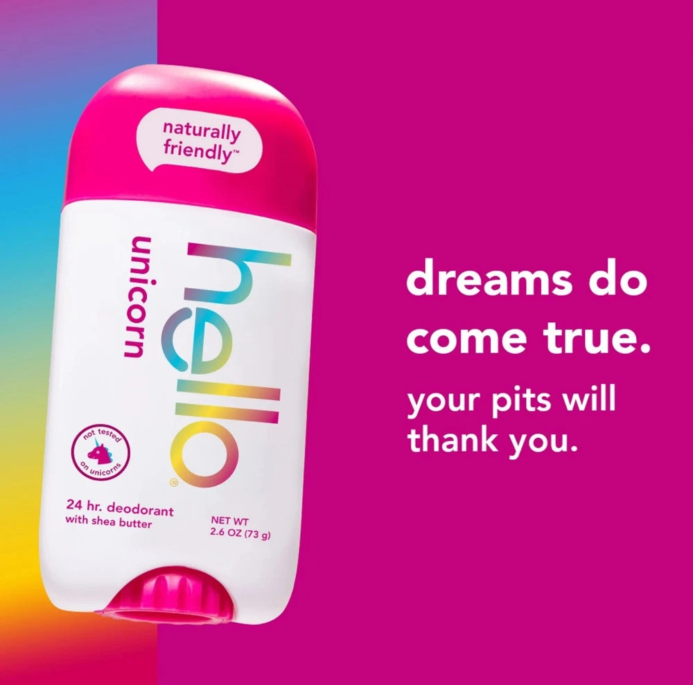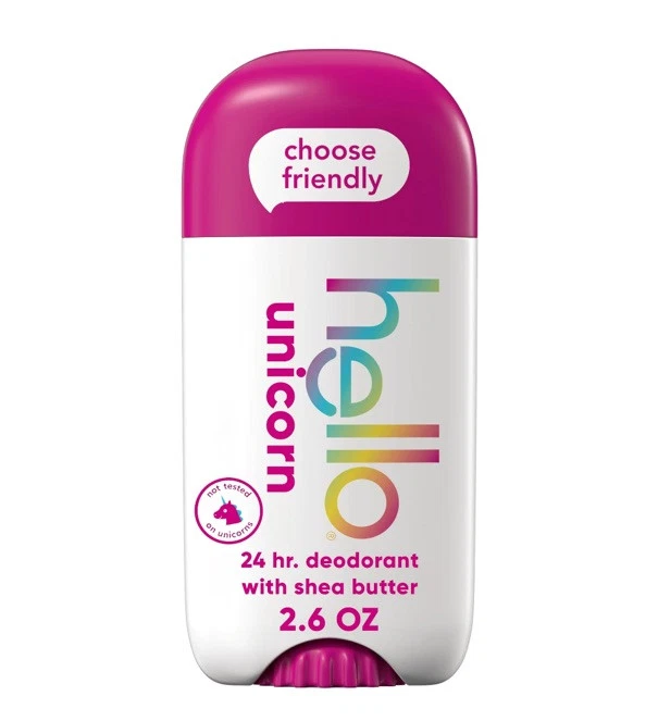 Hello 24Hr Deodorant Shea Butter Unicorn Watermelon Scent - Aluminum Free, 2.6oz. Say hello to hello Unicorn Aluminum Free Deodorant. Get swept away by this fruity fragrance that magically combines the scent of watermelon, apple, and melon all in one deo. Our 24-hour deodorant with shea butter is dermatologically tested and naturally scented to keep you feeling fresh all day. Say goodbye to aluminum, baking soda, parabens, and dyes. Plus, it glides on easily for a smooth application and won’t stain your clothes. Choose friendly with a deodorant that's Leaping Bunny Certified, not tested on animals, and vegan for happy underarms. Anything less would be the pits. WHAT I’M GETTING: Includes one 2.6 oz deodorant stick of hello Unicorn Aluminum Free Deodorant for Men and Women ALUMINUM FREE PROTECTION: Free of aluminum, dyes, baking soda, and parabens NATURALLY SCENTED: Delight in the magically fruity fragrance of watermelon, apple, and melon 24-HOUR DEODORANT WITH SHEA BUTTER: Keeps you fresh + friendly for 24 hours, so you can take on the day with confidence KNOW YOUR DEODORANT: Leaping Bunny Certified, vegan, and dermatologically tested Fresh scent
