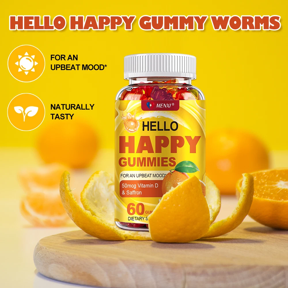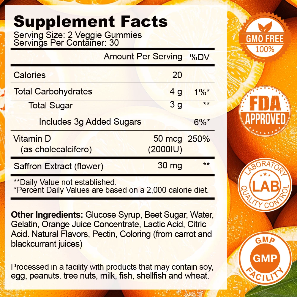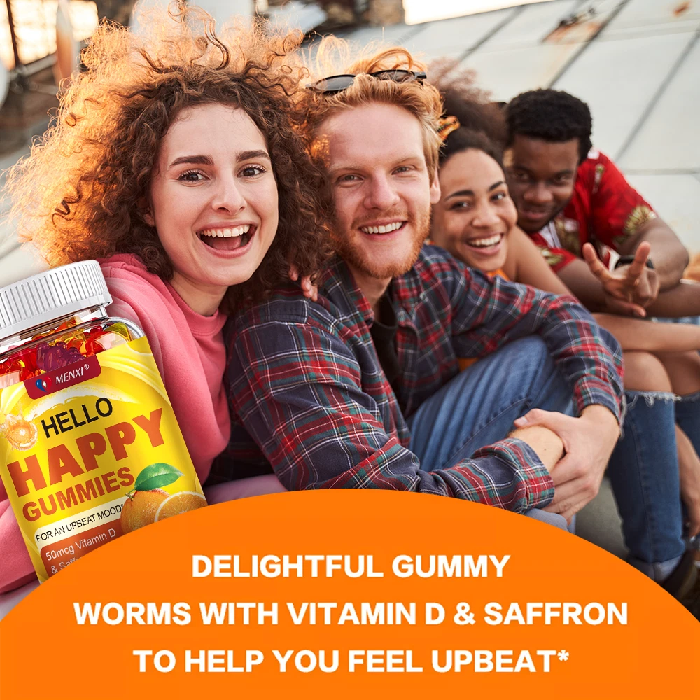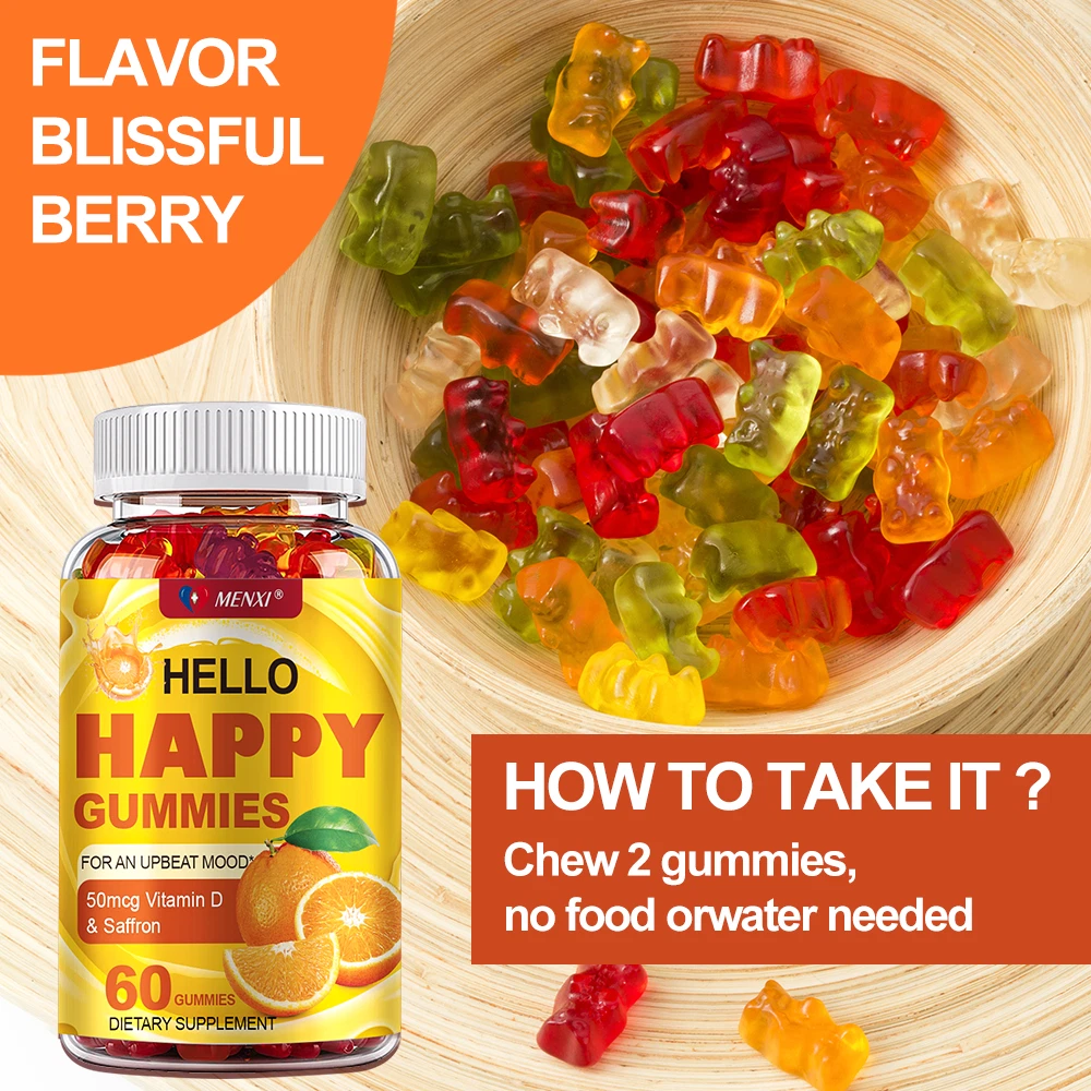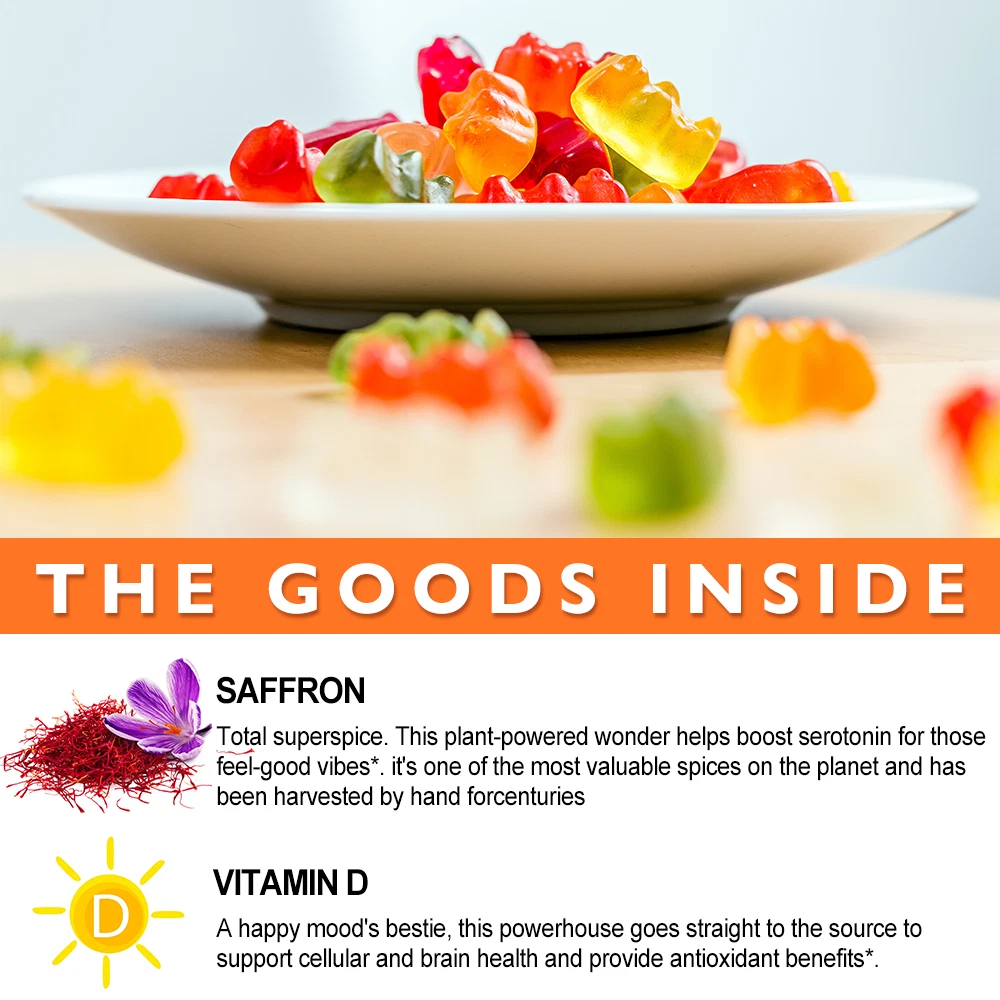 About Effects: Optimistic Mood, Reduce Fatigue Ingredients: Vitamin D & Saffron Directions: Take 1 gummy twice a day after meals. Shipping: Ships within 48 hours on working days. Shelf life: 2 years Description: Nutritional supplement: The main ingredients of our gummies contain saffron and vitamin D. Saffron has powerful mood-balancing properties that can keep you emotionally stable and optimistic. Saffron can help increase serotonin, making you feel good. While vitamin D directly supports cell and brain health and provides antioxidant benefits, the combination of vitamin D and saffron can better balance mood and support physical health through nutritional supplementation. NATURALLY DELICIOUS: Featuring naturally flavored Tropical Zing (a lively blend of pineapple, peach and orange), these gummies have no artificial colors or flavors and are gluten-free. Note: These statements have not been evaluated by the Food and Drug Administration. This product is not intended to diagnose, treat, cure or prevent any disease.