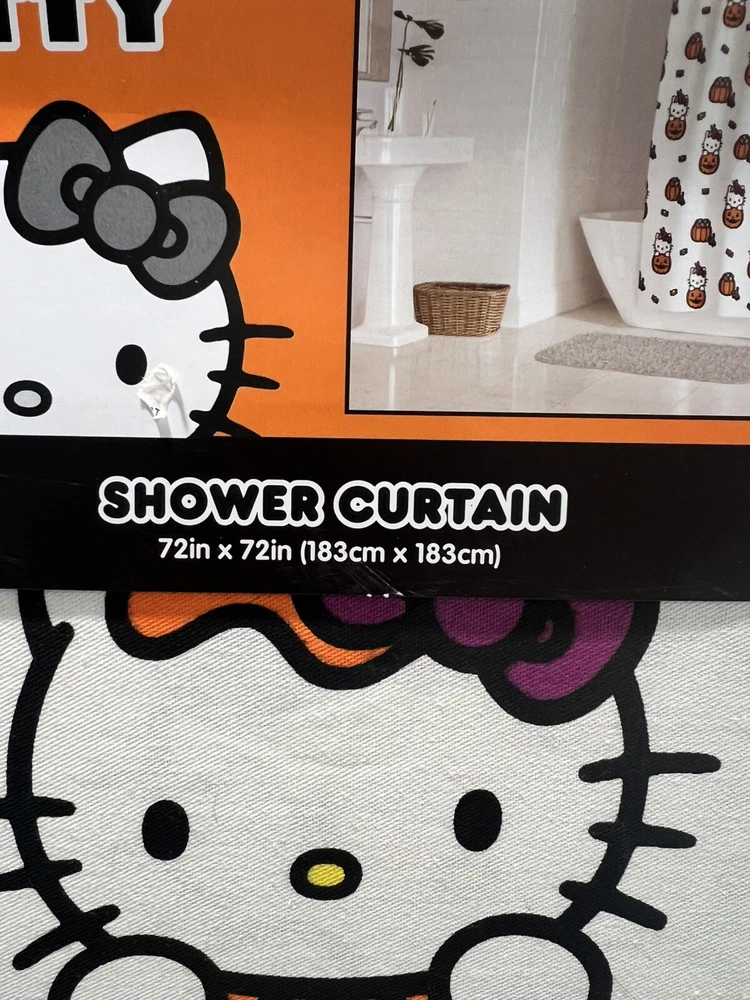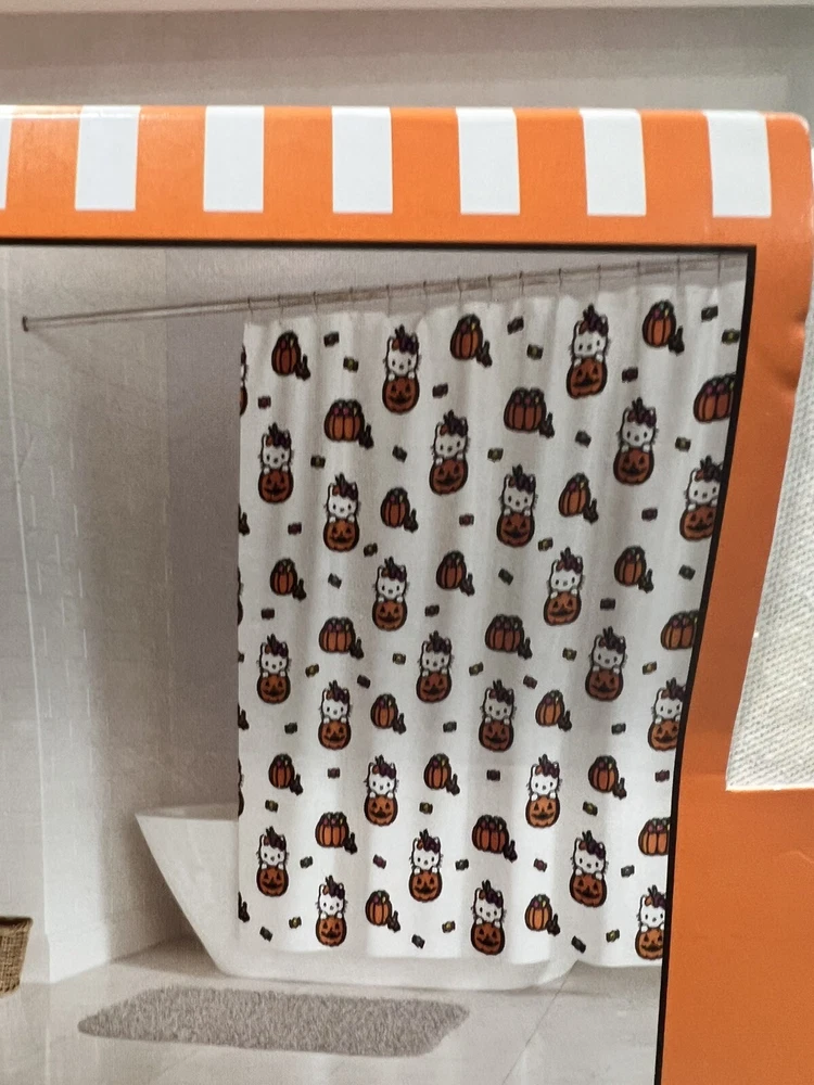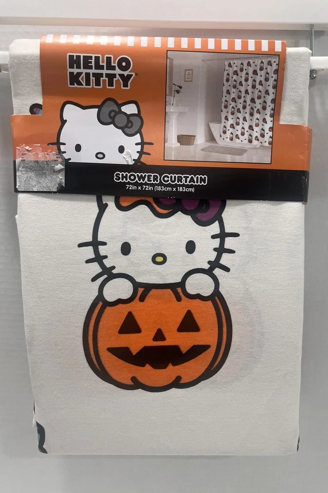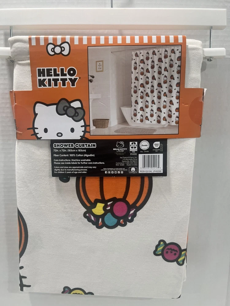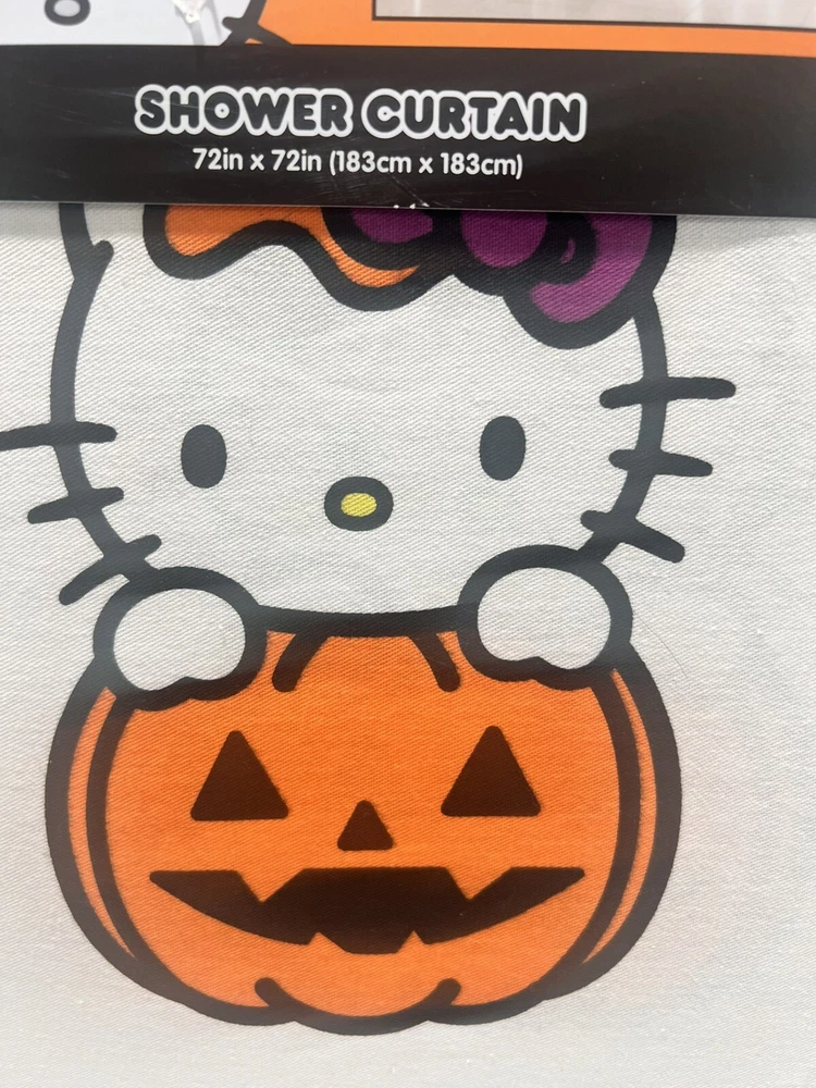 Get ready for Halloween with this adorable Hello Kitty shower curtain! Featuring a fun Halloween pumpkin and candy design, this cotton fabric curtain is machine washable and perfect for any bathroom. Whether you're taking a shower or giving a bath, this multicolor curtain will add a spooky touch to your bath time routine. Suitable for any shower, this curtain is a must-have for any Hello Kitty fan.