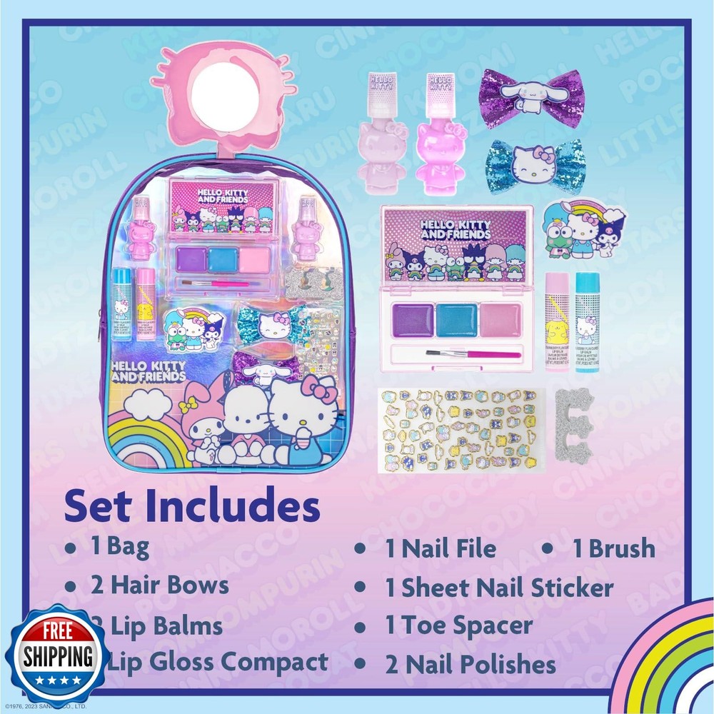 Hello Kitty and Friends- Townley Girl Makeup Filled Backpack Set with 12 Pieces, Including Lip Gloss, Nail Polish, Nail Stones and Other Accessories, Ages 3+ for Parties, Sleepovers and Makeovers Features SET INCLUDES: Assortment of 2 bubble gum scented nail polishes, 2 lip balms that are strawberry and blueberry flavored, 1 toe spacer, 2 glittery hair bows, 1 3-well, cotton candy flavored lip gloss compact, 1 sheet of nail stickers and 1 nail file all packed in a fun, reusable, Hello Kitty and Friends backpack. SAFE FOR CHILDREN 3 AND UP: Our non-toxic, water-based and bubble gum scented nail polish formula makes them safe for your young ones. Our lip glosses are non-toxic and water-based as well. They are non-mess as they wash out with water! POLISH REMOVER NOT NEEDED: Simply peel off dried polish to remove it from nails. No need to expose your child to harmful vapors and chemicals that are in standard nail polish removers. UNLEASH HER CREATIVITY This amazing makeover set contains everything she will need to create a dazzling beauty look. With multiple polish colors and nail stickers, lip glosses and more, she'll have so much fun glamming up. And the best part is she can take all of these beauty essentials with her on the go by storing them in her new backpack! MORE FUN FOR EVERYONE: This ultimate makeover set is the perfect activity that she can share with her friends at sleepovers, makeup parties, birthday parties and more! Shipping Free & Fast Shipping: We offer free shipping to most of the USA with a normal delivery time of 3-7 days. However, due to the current situation, additional delivery time (up to 3 weeks) may be required for some items. Alternative Carriers: We may use alternative carriers (e.g., USPS, FedEx, UPS) to ensure your package arrives safely and on time. Due to the use of multiple carriers, we are unable to provide a tracking number automatically. Handling Time: Orders are processed and shipped within 1-2 business days of receiving cleared payment. Shipping Restrictions: Shipping to Alaska, Hawaii, Puerto Rico, Guam, and other US territories may incur shipping charges or delivery restrictions. Please contact us before ordering, or your order can be refunded/cancelled. State Restrictions: Certain items may not be shipped to California due to state regulations. Contact for Tracking Updates: If you require tracking updates or have any concerns about the delivery of your order, please feel free to contact us, and we will be happy to assist you. Return Policy 30-Day Hassle-Free Returns: If you are not completely satisfied with your purchase, you can return the item for free within 30 days of receiving it for a full refund or exchange. Easy Return Process: Contact us, and we will provide you with a prepaid return shipping label and detailed instructions. No Restocking Fee: There are no restocking fees for returns. However, the buyer is responsible for return shipping costs if the return is not due to a seller"s error. Refund Processing: Refunds will be processed within 1 business day of receiving the returned item in its original condition. Feedback Your feedback is extremely important to us. We strive to provide the best products and customer service possible. If you are satisfied with your purchase, please take a moment to leave us a positive review. If you have any concerns or issues with your order, please contact us before leaving negative feedback. We are committed to resolving any problems and ensuring your satisfaction. Contact Us If you have any questions or concerns, please feel free to reach out to our customer support team. You can contact us through the eBay messaging system. We are available Monday to Friday, 9:00 am to 5:00 pm EST, and we will do our best to respond to your inquiry within 24 hours. Thank you for supporting our small family business!
