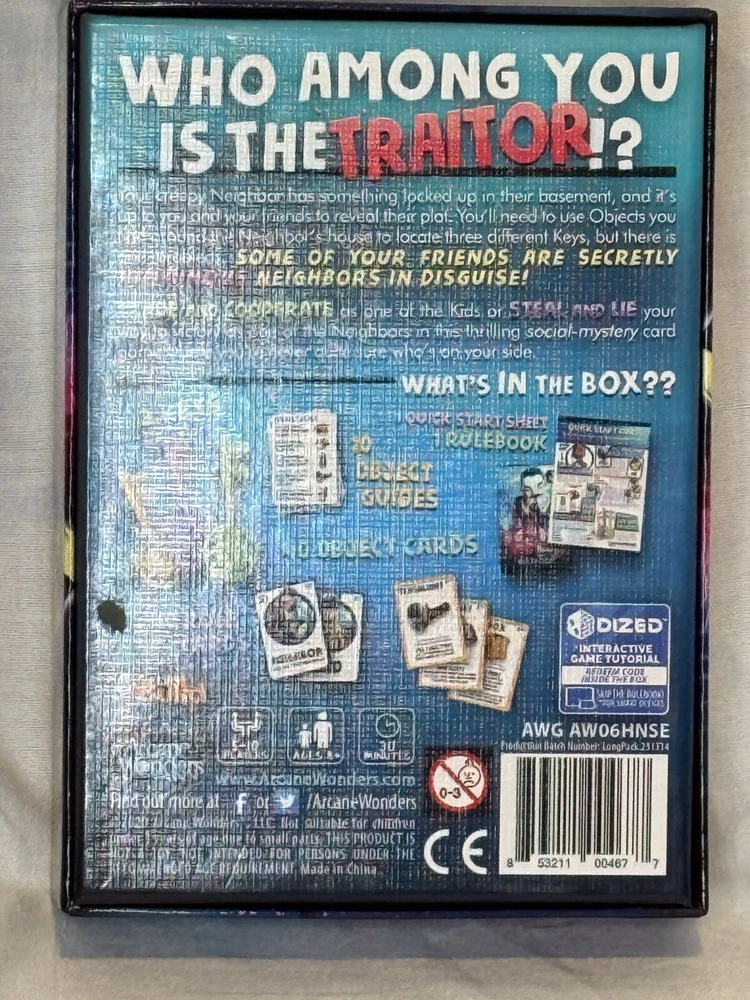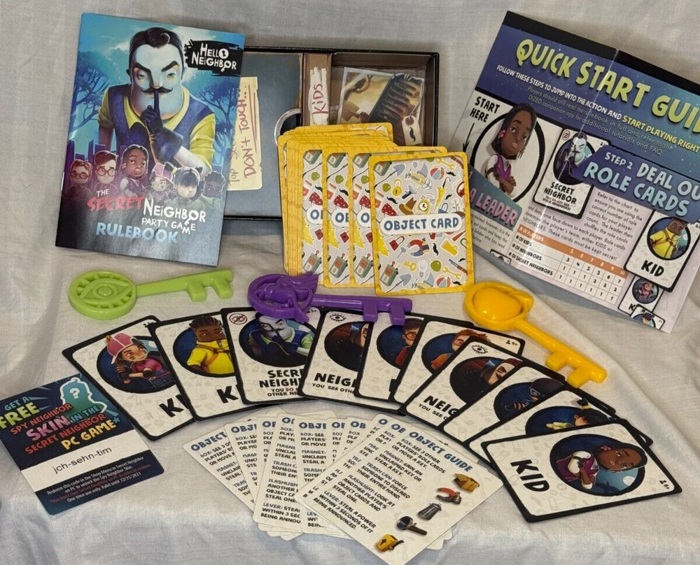 π Hello Neighbor: Secret Neighbor Party Game π Dive into a world of suspense and strategy with this thrilling social mystery card game! Designed for 5-10 players, this game challenges you to cooperate and outsmart hidden traitors in your group. Explore, strategize, and unveil secrets, but stay sharpβone of your friends might be the villainous Neighbor in disguise! π€« π Whatβs Inside the Box? 3 Keys π 10 Object Guides π 40 Object Cards π΄ 10 Role Cards π₯ 1 Quick Start Guide & Rulebook π‘ Game Features: π₯ 5-10 Players π 30-Minute Gameplay π§© Fun for Ages 8+ This open box set includes all components in great condition and is ready for hours of fun. Whether you're a fan of the Hello Neighbor universe or just love an exciting party game with a twist, this is the perfect choice for game night! π Ideal for family gatherings, parties, and casual play! ? Visit My Store for More Collectibles! ? Love this item? Check out my eBay store for even more amazing comics, action figures, and collectibles! Click here ? ANM Collectibles to explore my full collection. Don't miss out on great deals?new items added regularly! ?
