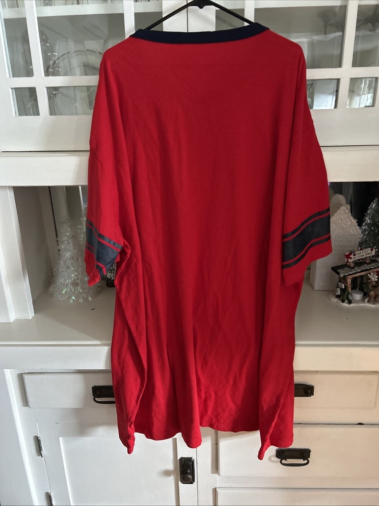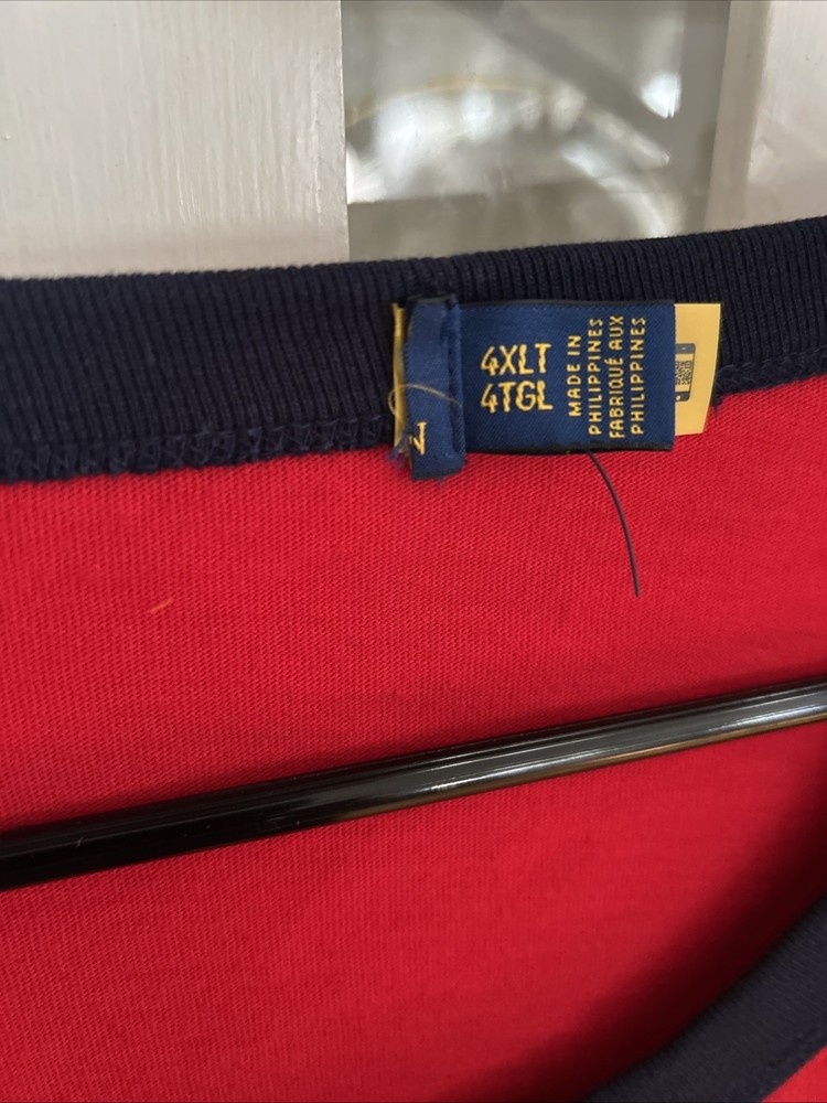 The product is a men's red and black Ralph Lauren T-shirt in size 4XLT. This classic fit polo shirt is made of cotton and features a crew neck and short sleeves. Perfect for sporty or casual looks, this T-shirt is designed for big and tall men who appreciate quality and style.