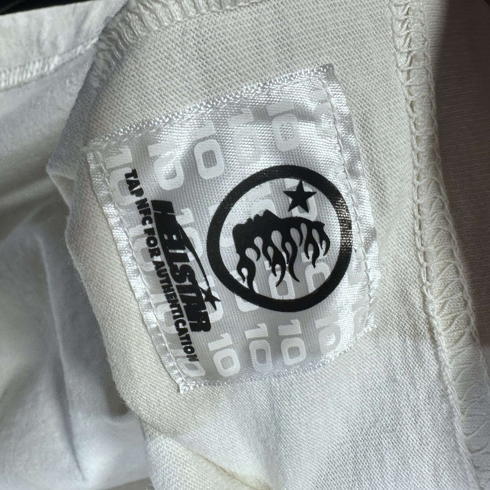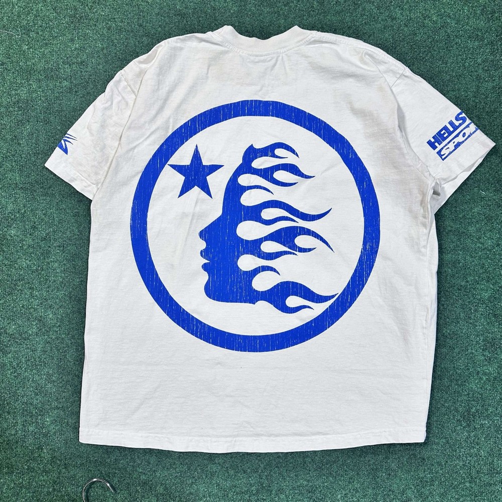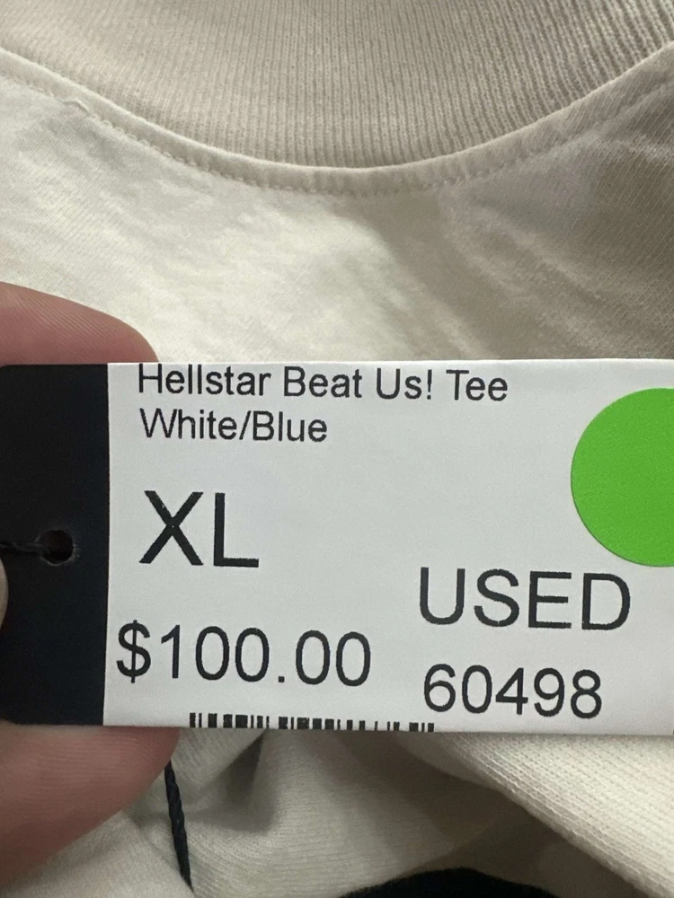 ALWAYS AUTHENTIC, SHIPS 1 BUSINESS DAY, VERIFIED SELLER Hellstar Beat Us! Tee White/Blue XL Used This Hellstar Beat Us! Tee features a bold design with ‘IF YOU DONT LIKE US BEAT US!’ printed on the front in blue. The back showcases a unique graphic with a star and flame motif. Made from quality materials, this white and blue tee is perfect for making a statement. Size XL, used condition, offering a comfortable fit for casual wear.