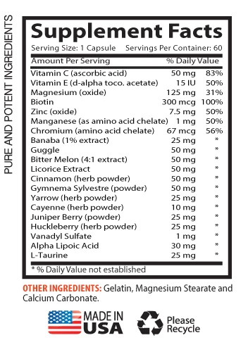 Blood Sugar Support 600mg Lower Glucose Levels Supports Pancreatic Function. Helps Control Cravings, Boost Energy Levels. Provides Blood Sugar Support. Help Maintain Healthy Metabolism. Prevents Inflammation, Stabilizes Mood. Weight Loss, Breaks Down Body Fat. Helps Control Sugar Cravings. Increased Energy & Mental Alertness. 2 Bottles, 120 Capsules Made In USA Our Formula Of Blood Sugar Support 600mg: Vitamin C (ascorbic acid), Vitamin E (d-alpha toco. acetate), Magnesium (oxide), Biotin, Zinc (oxide), Manganese (as amino acid chelate), Chromium (amino acid chelate), Banaba (1% extract), Guggl, Bitter Melon (4:1 extract), Licorice Extract, Cinnamon (herb powder), Gymnema Sylvestre (powder), Yarrow (herb powder), Cayenne (herb powder), Juniper Berry (powder), Huckleberry (herb powder), Vanadyl Sulfate, Alpha Lipoic Acid, L-Taurine. Controlling Blood Sugar to Regulate Body Weight: Those who struggle with obesity often suffer from dangerously elevated glucose (blood sugar) levels. Beta-glucans (derived from oats and barley) slow the absorption of carbohydrates—enabling one to control blood sugar levels and induce the satiety needed to achieve healthy weight management. Side benefits of controlling blood glucose include lowering harmful blood fats and C-reactive protein. When blood sugar levels are stabilized, metabolic syndrome and high blood sugur levels can be averted. Food cravings are directly related to unbalanced blood glucose levels. Stable blood glucose levels help to control food cravings and suppress appetite, causing you to eat less. Blood Sugar Support Help Stabilize Mood & Boost Memory: When you master your blood sugar, you'll feel full of energy, cravings will subside, your weight will be controlled, your mood will stabilize, your memory will be better and you will balance your hormones. Eating foods that release energy quickly can cause feelings of fatigue, hunger and irritation. Processed foods and those full of refined sugar cause a spike in your blood sugars they release their glucose in a sudden rush. Blood sugar spikes rapidly, but it quickly crashes back to earth! So if you're moody, irritable, hungry, have cravings, experience poor concentration or gain weight? You need to balance your blood sugar. Magnesium Help Maintain Proper Blood Sugar Lever: Magnesium in your body helps maintain proper blood sugar levels by regulating the action of insulin, a hormone that lowers your blood sugar. Insulin in your bloodstream binds to specialized proteins on the surface of your cells, activating these proteins and triggering the uptake of glucose from your bloodstream. Magnesium supplements can help prevent magnesium deficiency, helping to ensure that your cells contain enough magnesium.Experts have a couple of theories about magnesium. First, it is conceivable that magnesium is used by the body's enzymes to process glucose. Vitamin C Improve Cardiac Health: Vitamin C is a critical supplement in your program to improve cardiac health. Vitamin C also known with the scientific name of ascorbic acid, is a water-soluble vitamin with antioxidant properties.One of the most intensely studied areas of vitamin C benefits is in the area of cardiovascular health. Researchers are finding that vitamin C impacts several aspects of cardiac health, ranging from blood pressure to endothelial health. Vitamin C is seen as a key protective element against many aspects of cardiovascular problems. Banaba Extract Prevent Damage By Free Radicals: Banaba Extract (Corosolic Acid) significantly reduces blood glucose levels. Corosolic Acid has strong antioxidant properties that help to prevent damage by free radicals. Banaba leaf is a traditional Asian herbal medicine remedy. In recent times it has garnered international attention for its ability to help lower blood sugar without adverse side effects. Banaba Extract contains Corosolic Acid, a triterpinoid compound known to stimulate glucose transport across cell membranes. Thus, not only the bad cholesterol that can be eradicated with Bungur plants but also high blood pressure and high blood sugar levels. This result was mainly achieved thanks to the role of saponins and tannins that lead to the metabolism of glucose and fat in the body. It is best to guard the blood pressure while consuming Banaba herbal leaf for patients with decreased blood pressure condition because herbal Banaba leaf can also reduce blood flow in the human body. Banaba Leaf Helps Blood Sugar Health: Banaba leaf is a traditional Asian herbal medicine remedy for diabetes. In recent times it has garnered international attention for its ability to help lower blood sugar without adverse side effects. Modern science continues to build the case for banaba as an effective way to help manage blood sugar, including offsetting some of the problems like obesity and elevated cholesterol that often occur simultaneously as metabolism falters. Bitter melon contains several chemical ingredients, including the glycosidesmomordin and charantin. PolypeptideP, charantin and vicine are the specificcomponents thought to have blood glucose-lowering effects. Several short-term studies suggest that it may indeed help reduce blood sugar. Cinnamon Promote Healthy Glucose Metabolism: The cinnamon plant is native to parts of India, Indonesia, South America and the West Indies. Its brown bark is ground to produce the familiar spice, commonly called cinnamon, or sometimes cassia. Cinnamon is recommended by practitioners of traditional herbal medicine for gastrointestinal problems and to improve circulation. Oil derived from cinnamon bark also has medicinal properties and is traditionally used to fight health problems. Cinnamon may also boost the immune system and have other positive effects on your health. Cinnamon supplements may modestly improve blood sugar in people with whose blood sugar is not well controlled. In addition, one small study found that a branded cinnamon extract reduced fasting blood sugar by an a