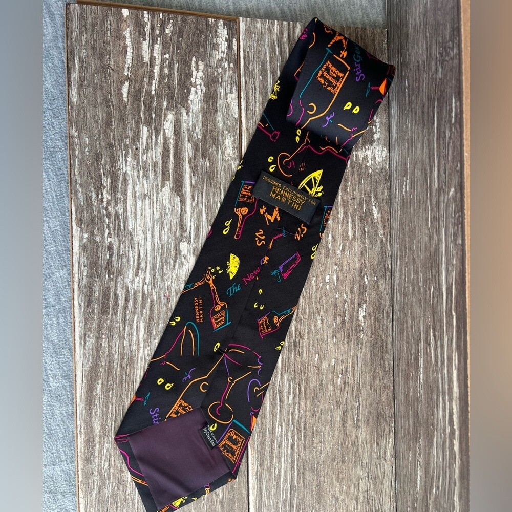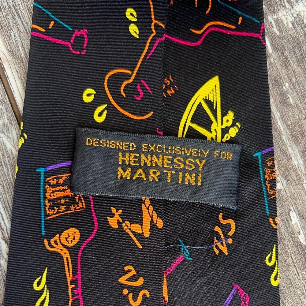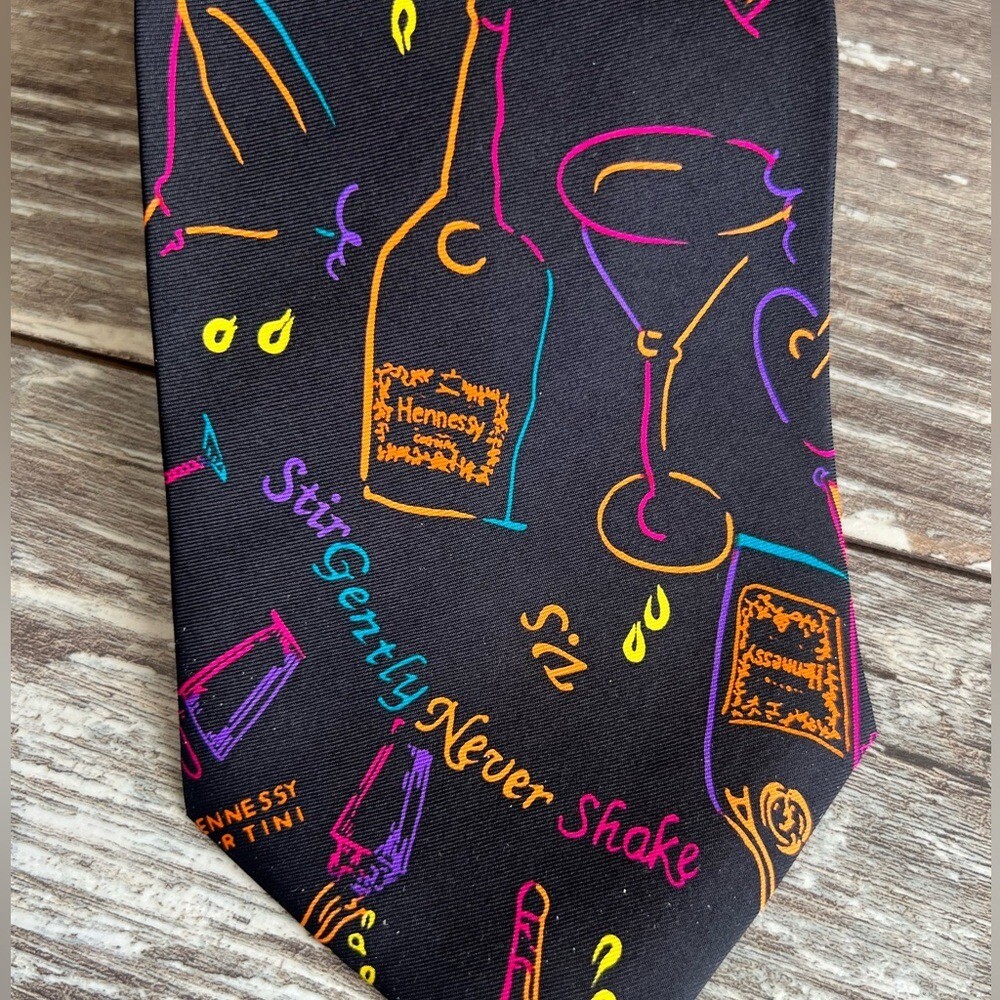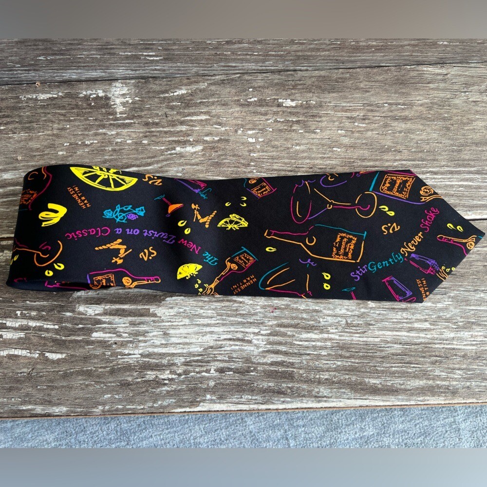 Hennessy Martini Colorful Cocktail Theme Necktie Bright Silk Formal Fun Black Vibrant and colorful Hennessey Martini necktie with cocktail and bottle designs. Perfect for adding a fun touch to any outfit. See the last two photos in the listing for details on the tie. Condition- Excellent- Preloved Color - black background with colorful words and pictures in orange, green, purple, pink, yellow Flat Lay -Measurements approximately: Blade-widest part of the tie-inches- 4 Overall length- inches- 58 Material Content- blend of: 100% silk My items are primarily thrifted and I do my very best to note any imperfections/callouts. Wash to wear - use measurements provided and match to clothes you currently own to determine best size match Ships Next Day Monday - Friday My items are stored in a pet/smoke free home Thanks for stopping in and looking! Lisa