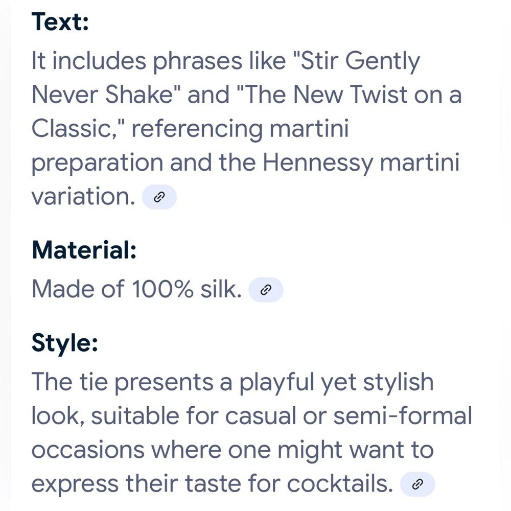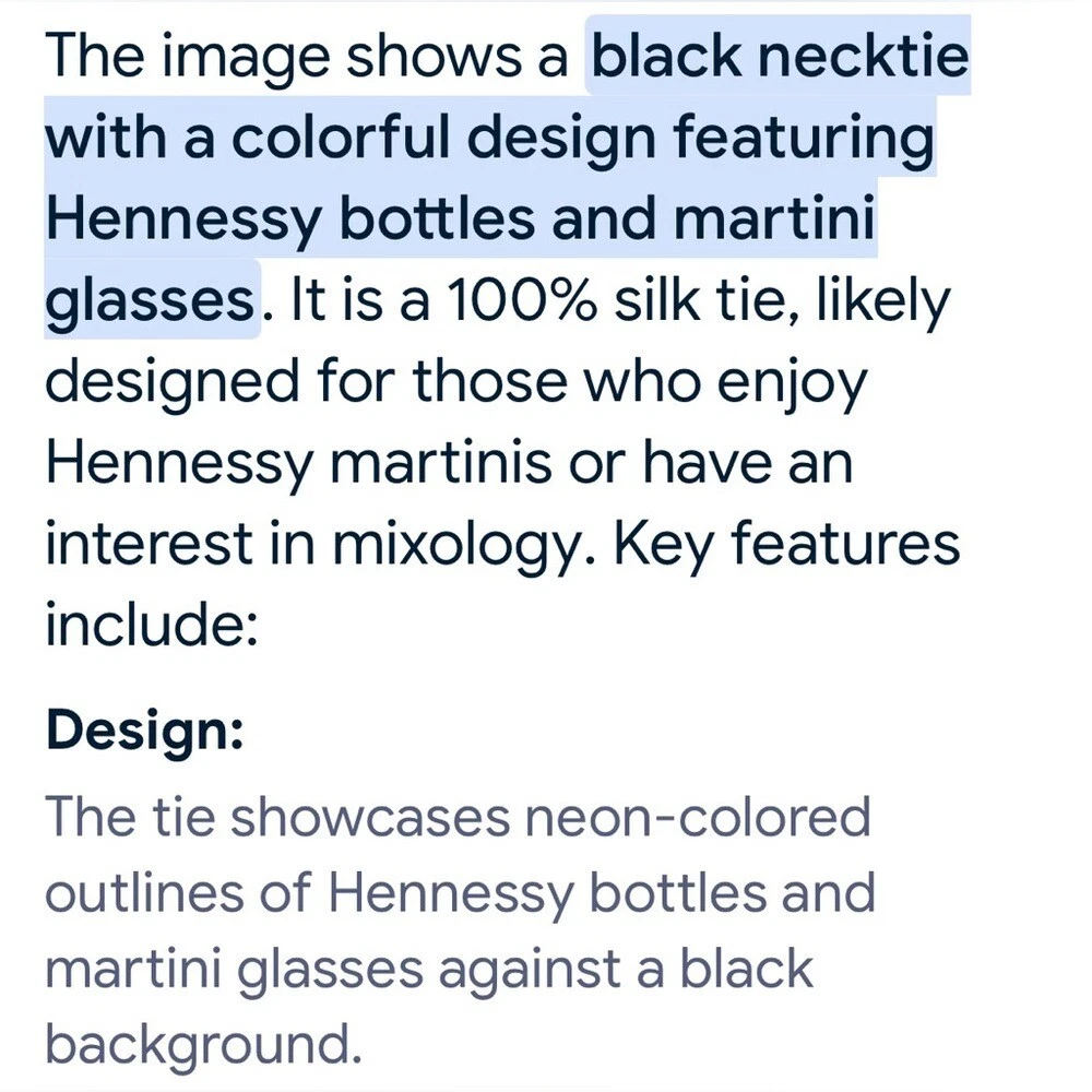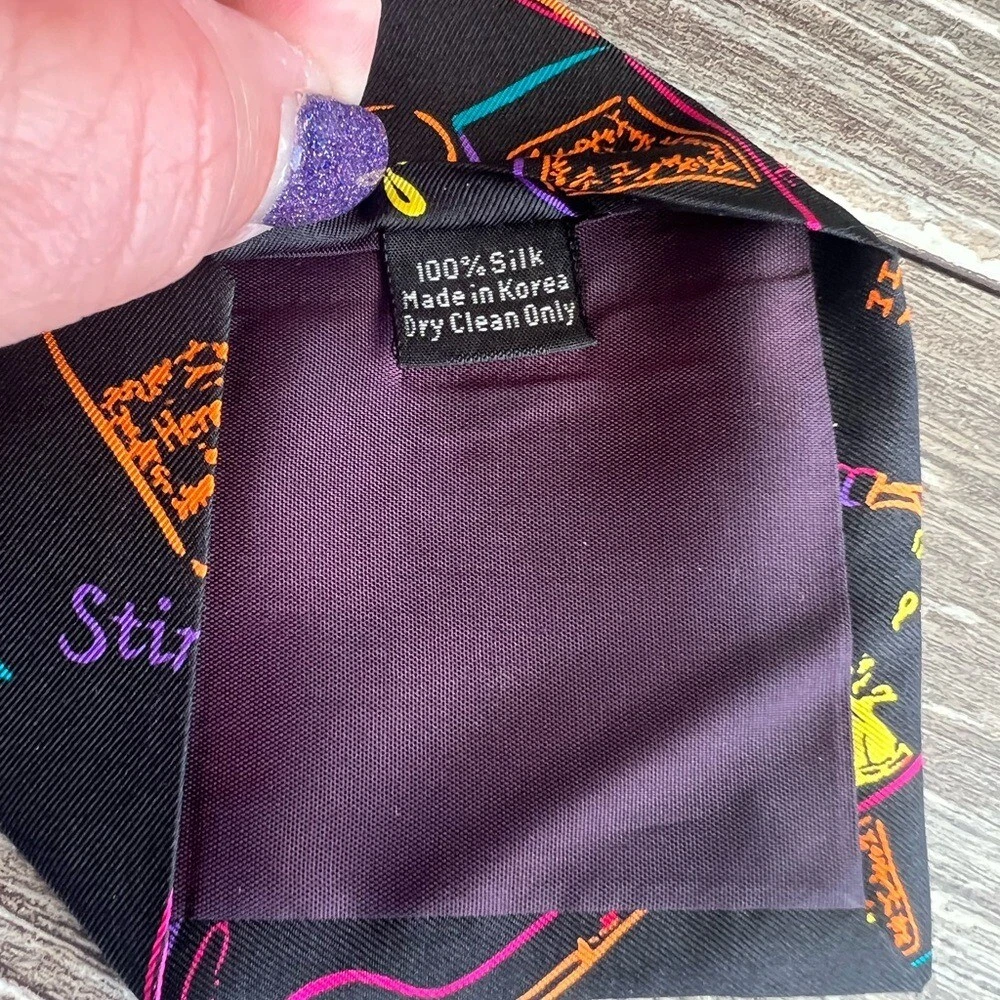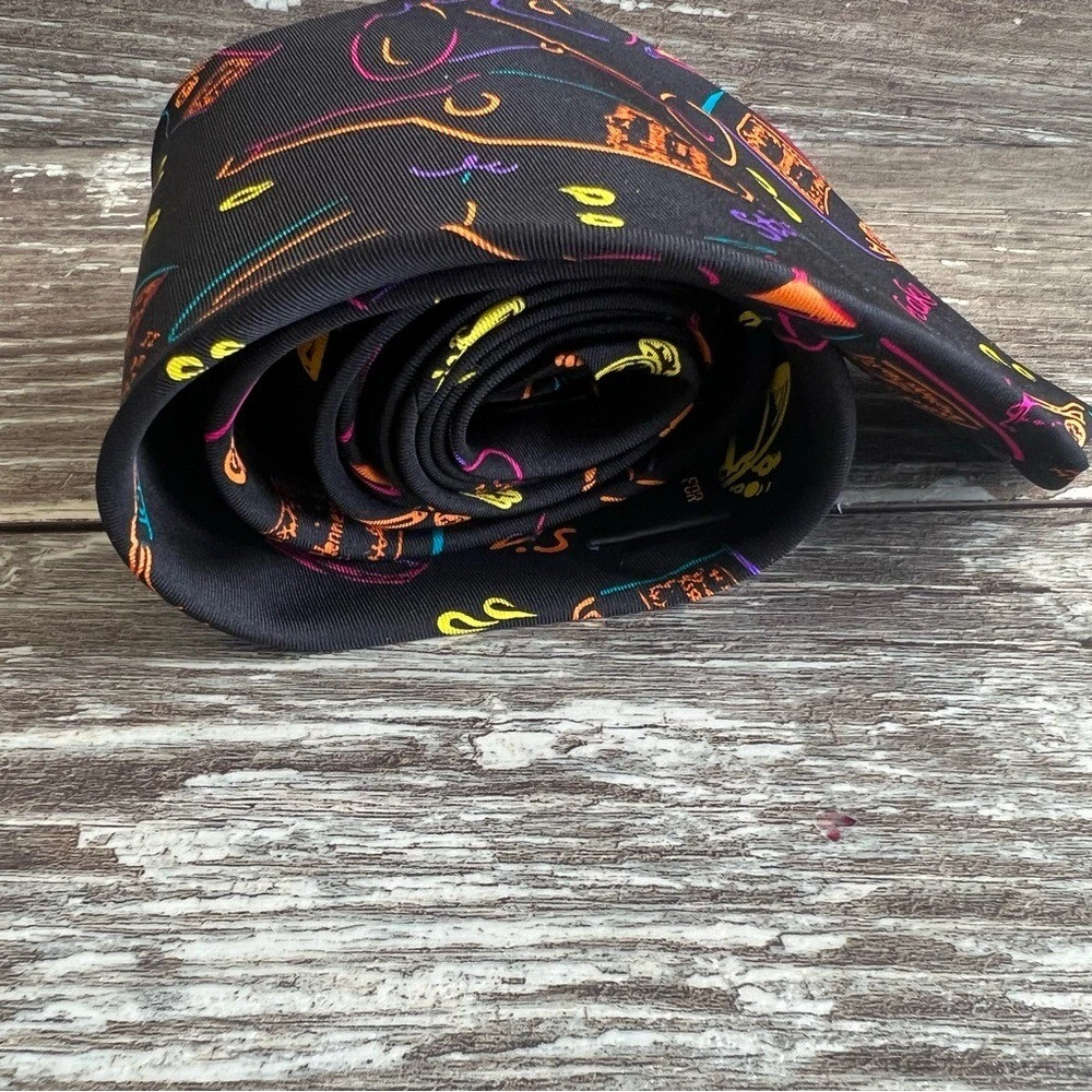 Hennessy Martini Colorful Cocktail Theme Necktie Bright Silk Formal Fun Black Vibrant and colorful Hennessey Martini necktie with cocktail and bottle designs. Perfect for adding a fun touch to any outfit. See the last two photos in the listing for details on the tie. Condition- Excellent- Preloved Color - black background with colorful words and pictures in orange, green, purple, pink, yellow Flat Lay -Measurements approximately: Blade-widest part of the tie-inches- 4 Overall length- inches- 58 Material Content- blend of: 100% silk My items are primarily thrifted and I do my very best to note any imperfections/callouts. Wash to wear - use measurements provided and match to clothes you currently own to determine best size match Ships Next Day Monday - Friday My items are stored in a pet/smoke free home Thanks for stopping in and looking! Lisa