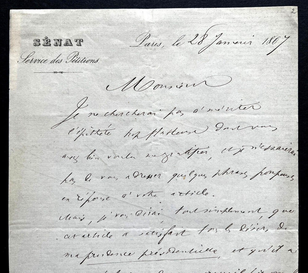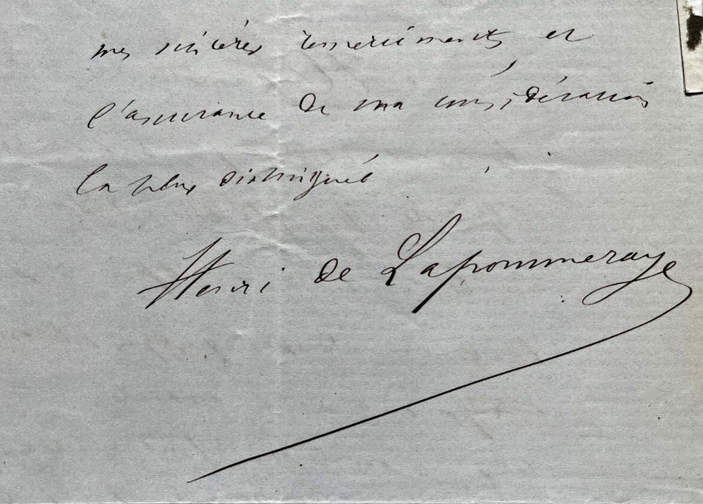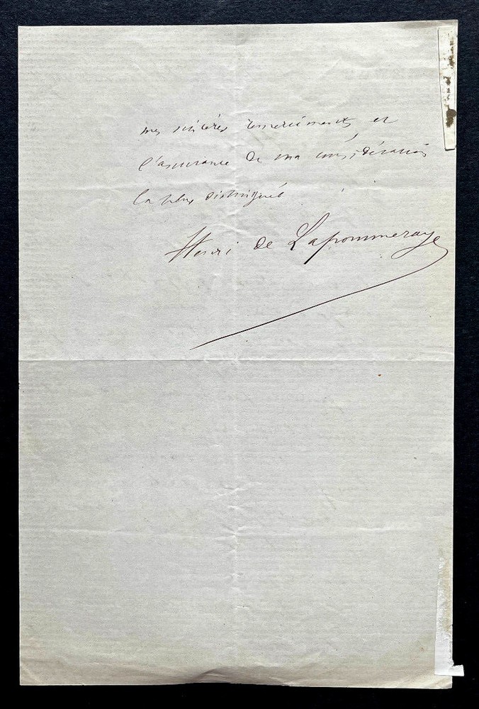 Lettre autographe signée de Henri de LAPOMMERAYE en date du 28 janvier 1867 sur papier à en-tête du service des pétitions du Sénat. État : Très bon état, présence d'onglets au verso . Voir photos pour plus de détails. Dimensions : 13,1 x 20,1. 2 pages. Henri de Lapommeraye, né Pierre Henri Victor Berdalle de Lapommeraye le 20 octobre 1839 à Rouen et mort le 25 décembre 1891 à Paris 6ᵉ est un critique de théâtre, homme politique, écrivain et dramaturge français. Wikipédia Envoi soigné dans un emballage rigide et étanche. Satisfait ou remboursé. Si vous n'êtes pas entièrement satisfait, je reprends la marchandise avec retour à ma charge pour l'Europe et à la charge de l'acheteur pour le reste du monde. N’hésitez pas à visiter ma boutique et affiner vos recherches en fonction des catégories qui vous intéressent. Ma boutique L'Art Délivré. Lettres autographes, vieux papiers, livres anciens, photographies, gravures, timbres… Nous expertisons et/ou rachetons dans toute la France vos lettres, collections de lettres et livres anciens. Merci de votre visite. Jérôme KAYSER. Lettre autographe signée de Henri de LAPOMMERAYE en date du 28 janvier 1867 sur papier à en-tête du service des pétitions du Sénat. Henri de Lapommeraye, né Pierre Henri Victor Berdalle de Lapommeraye le 20 octobre 1839 à Rouen et mort le 25 décembre 1891 à Paris 6ᵉ est un critique de théâtre, homme politique, écrivain et dramaturge français. Wikipédia Satisfait ou remboursé. Si vous n'êtes pas entièrement satisfait, je reprends la marchandise avec retour à ma charge pour l'Europe et à la charge de l'acheteur pour le reste du monde. N’hésitez pas à visiter ma boutique et affiner vos recherches en fonction des catégories qui vous intéressent. Ma boutique Lettres autographes, vieux papiers, livres anciens, photographies, gravures, timbres… Nous expertisons et/ou rachetons dans toute la Franc