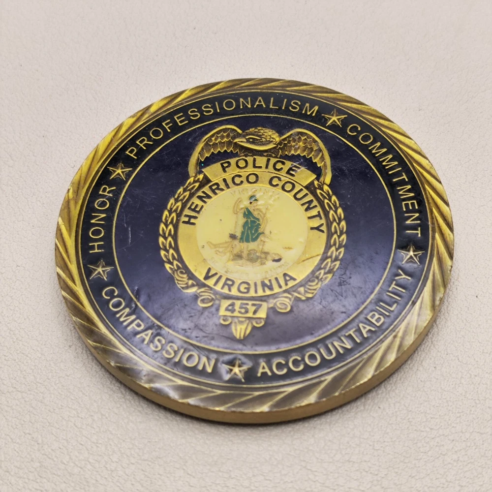 TITLE: Henrico County Virginia Police Department Challenge Coin #2 SIZE : Measures Approx 2 Used coins are inevitably flawed please see pictures PAYMENT : We support multiple payment methods and ship within 5 days of payment SHIPPING : We offer free shipping, and your purchase will be carefully packaged and sent to you with tracking information through eBay SERVICES : You can contact us at any time if you have any questions, We will get back to you as soon as possible to solve your problem If you are not satisfied with your purchase for any reason, Please contact us before leaving neutral or negative feedback and we will solve the problem properly for you