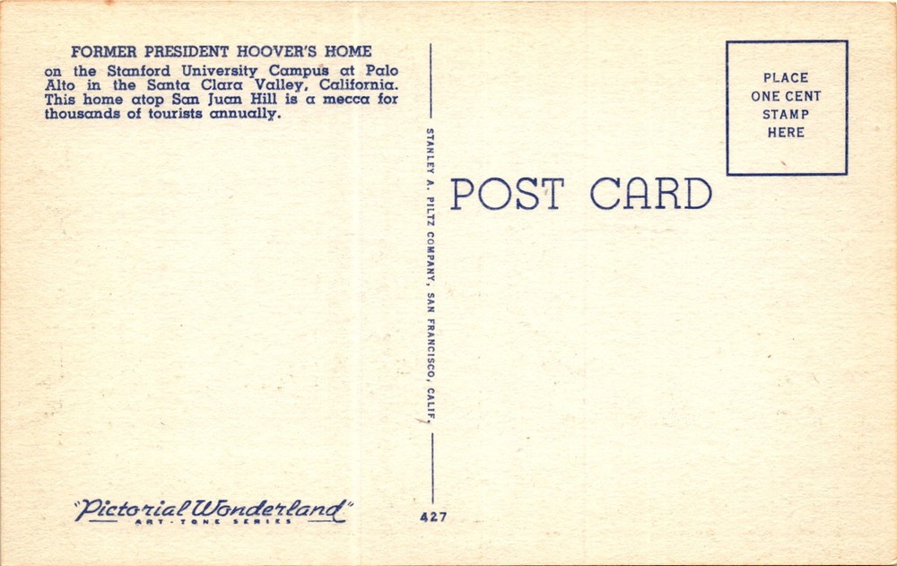 MAKE AN OFFER. THE MORE YOU BUY THE BETTER DEAL I WILL ACCEPT The postcard features the home of former President Herbert Hoover, located on the Stanford University campus in Palo Alto, California. The home is referred to as Stanley A. Piltz, and it sits atop San Juan Hill in the Santa Clara Valley. The postcard mentions that the home is a popular tourist destination, attracting thousands of visitors annually.