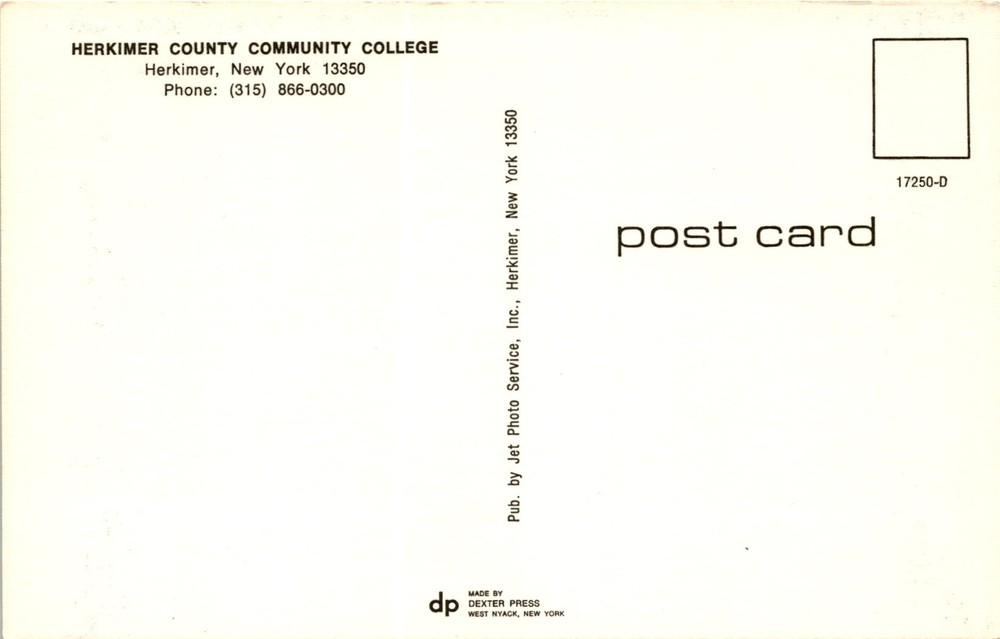 MAKE AN OFFER. THE MORE YOU BUY THE BETTER DEAL I WILL ACCEPT The postcard features an image of Herkimer County Community College in Herkimer, New York. The college was established in 1966 and is part of the State University of New York (SUNY) system. It offers a variety of associate degree programs as well as certificate programs in various fields of study.