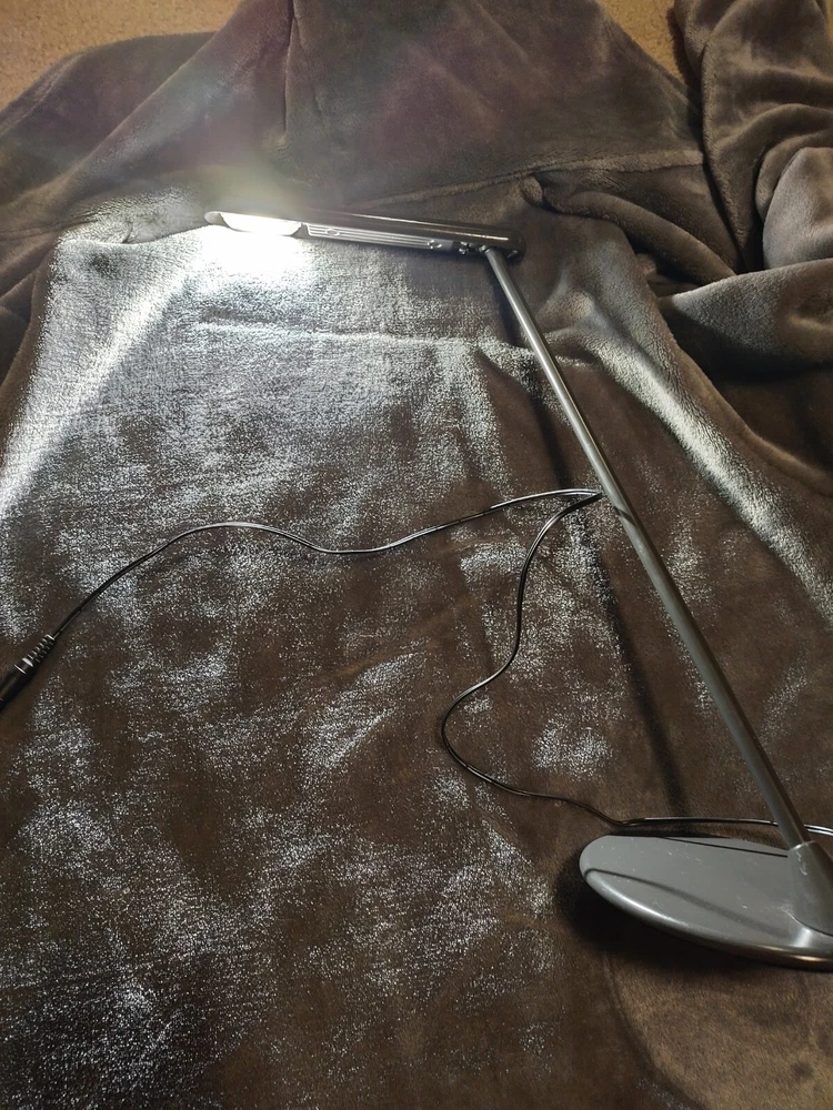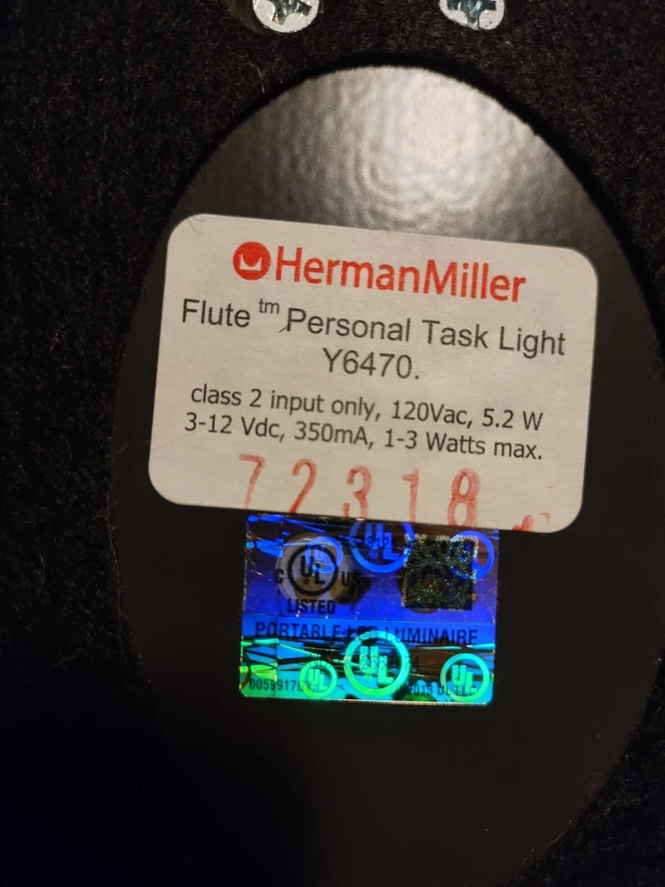 This is a Herman Miller Touch Light Y6470, a personal task desk light designed for computer desks. It is gray in color and has a flute-like shape. The light is authentic and was made in the United States. The light is 20 inches tall, 20 inches long, and 6 inches wide.