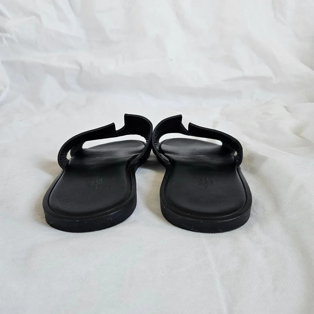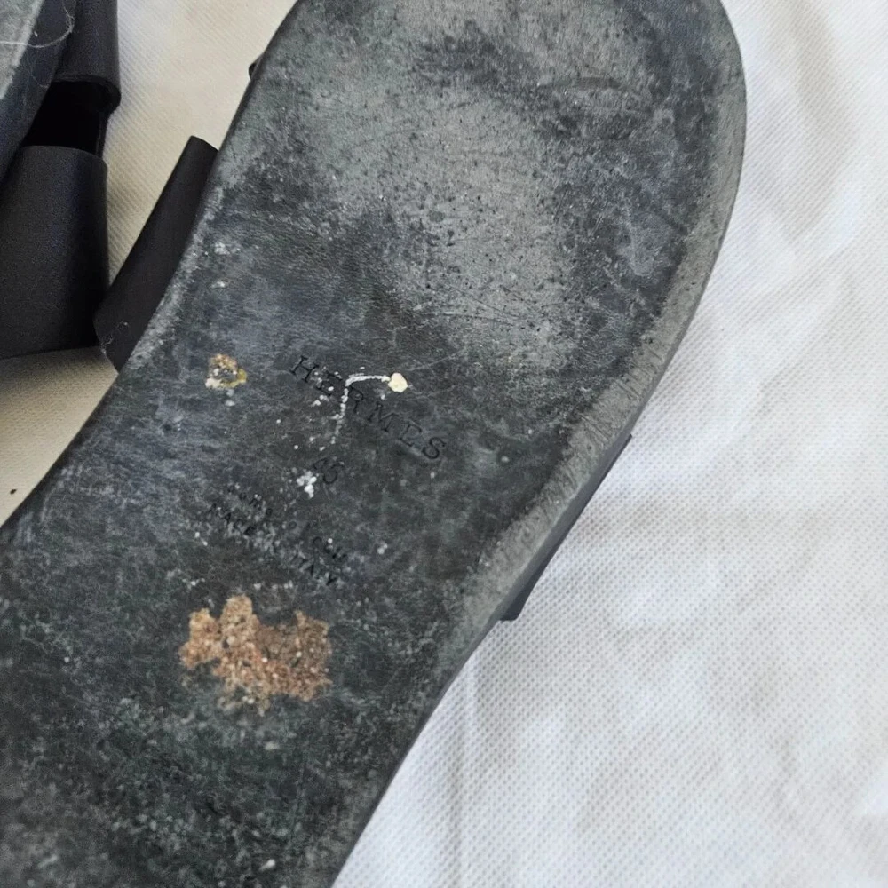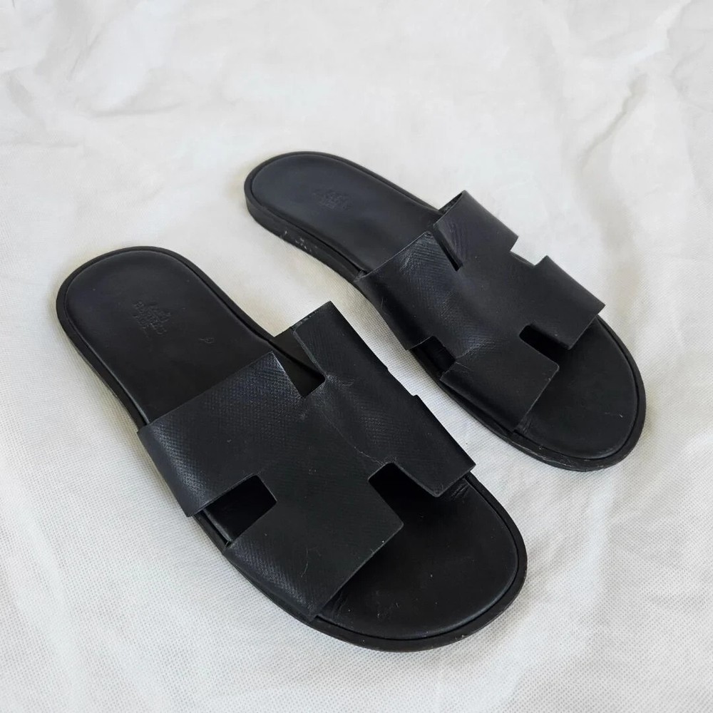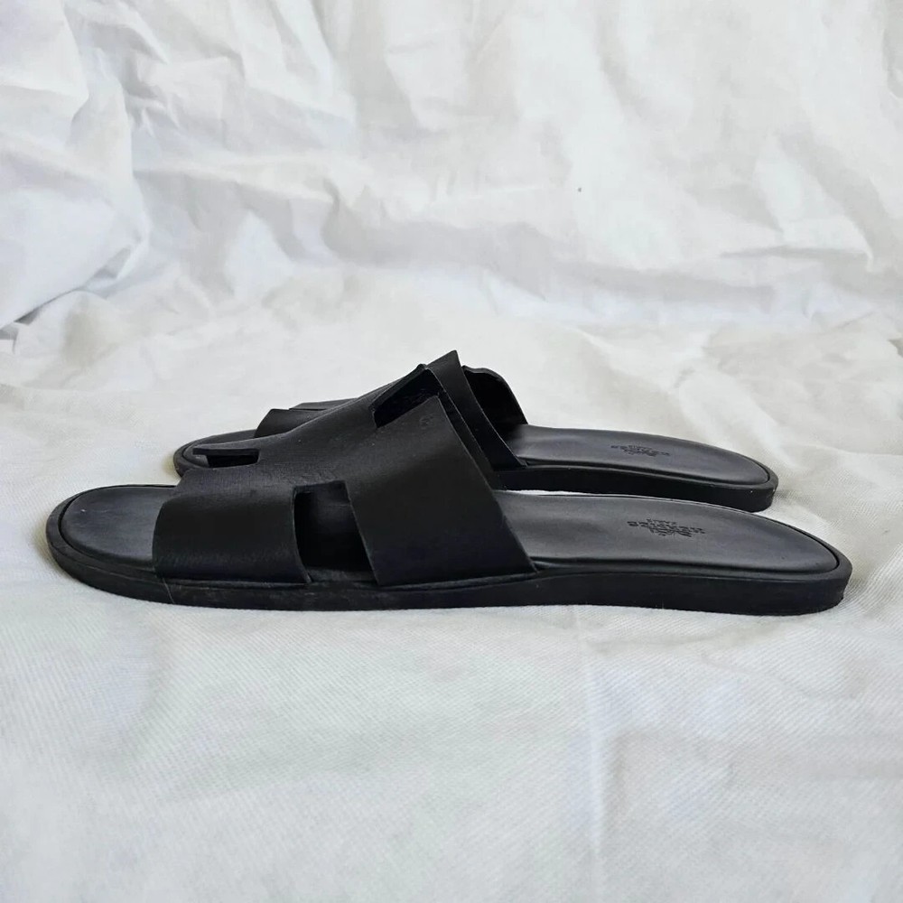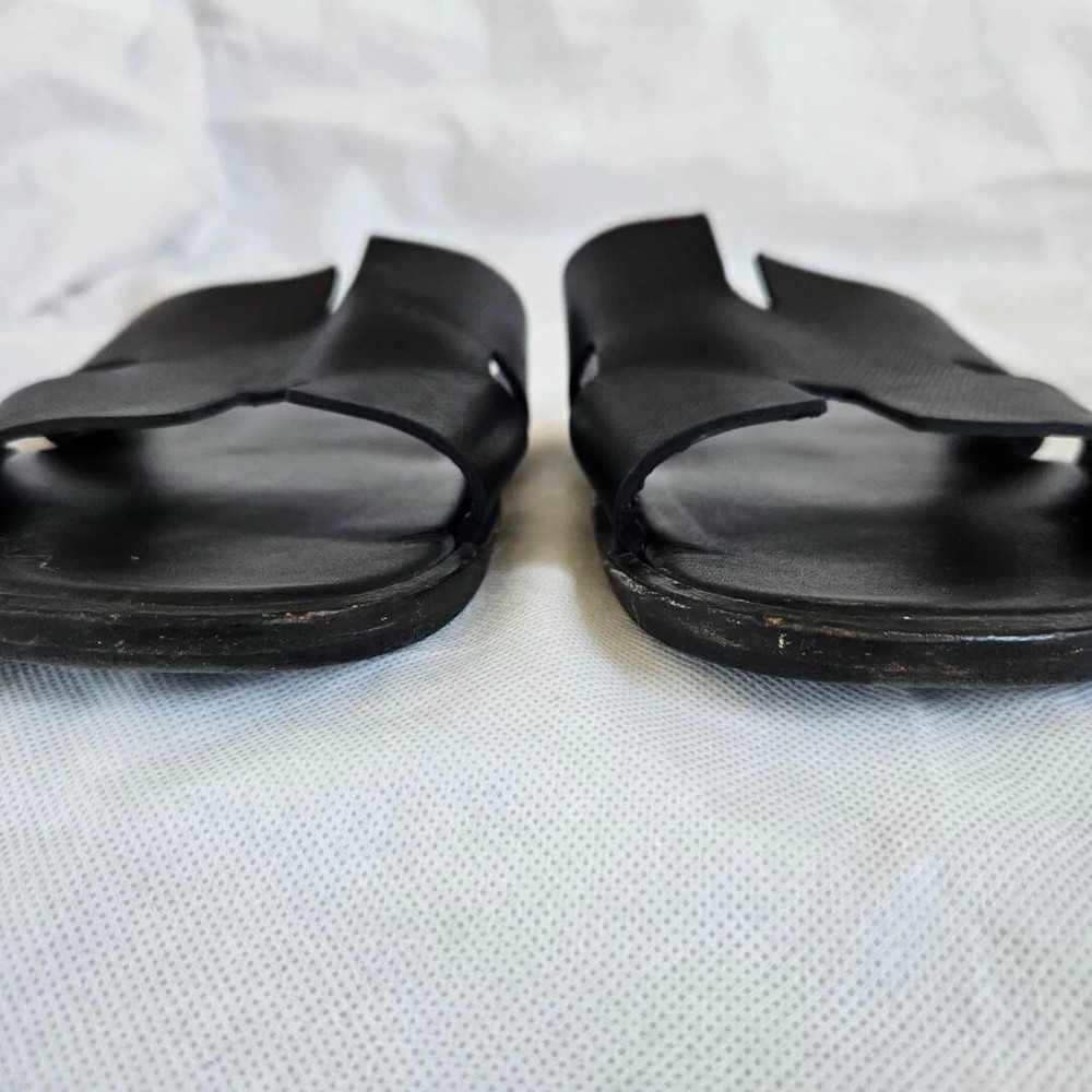 Hermes Black Leather Izmir Flat Sandal, 43 Attributes Material : Leather Color : Black Condition Desc. : Gently used; scuffed outsole Size : 43