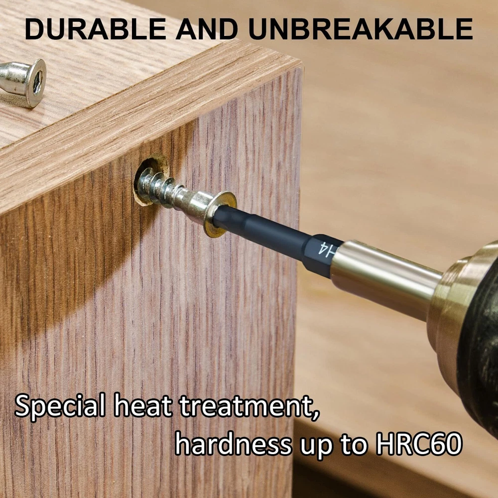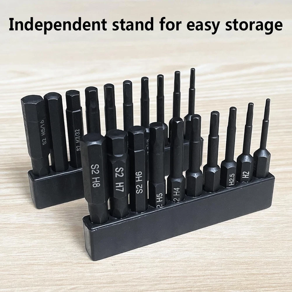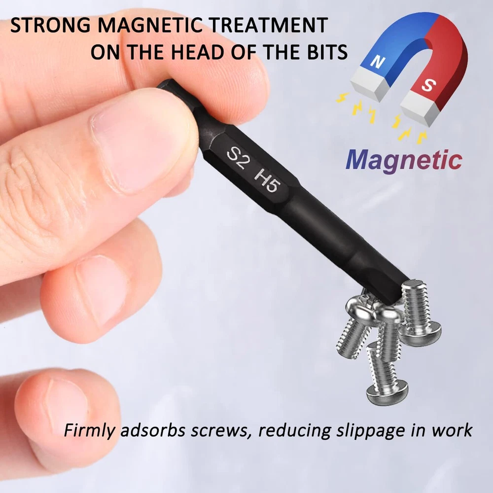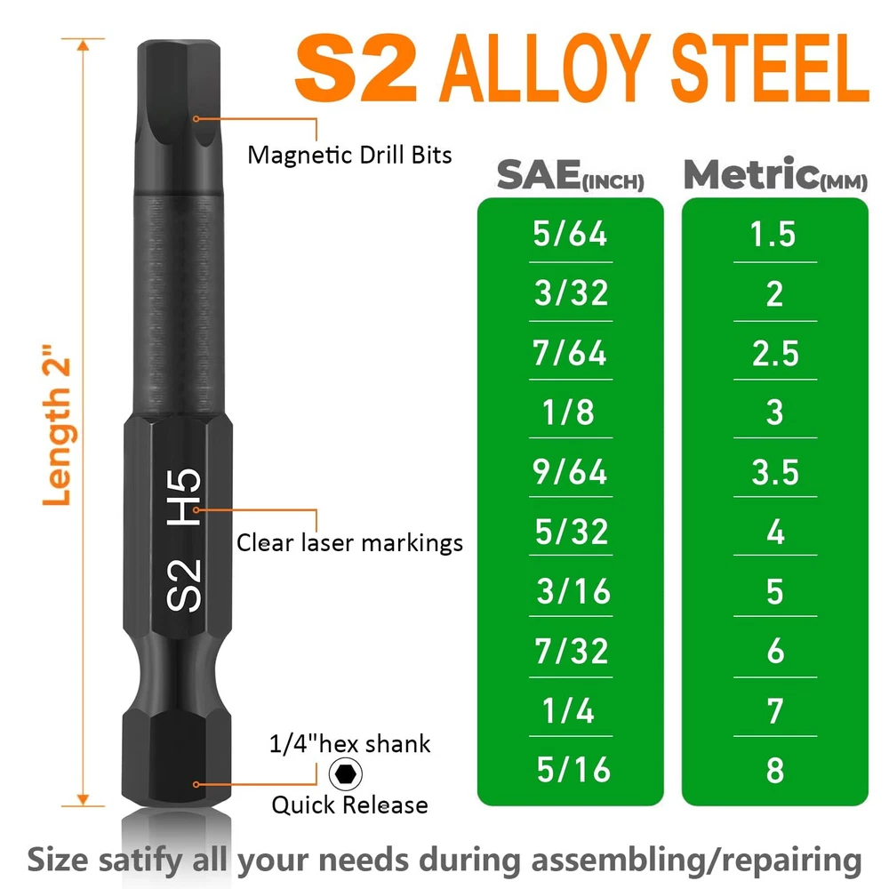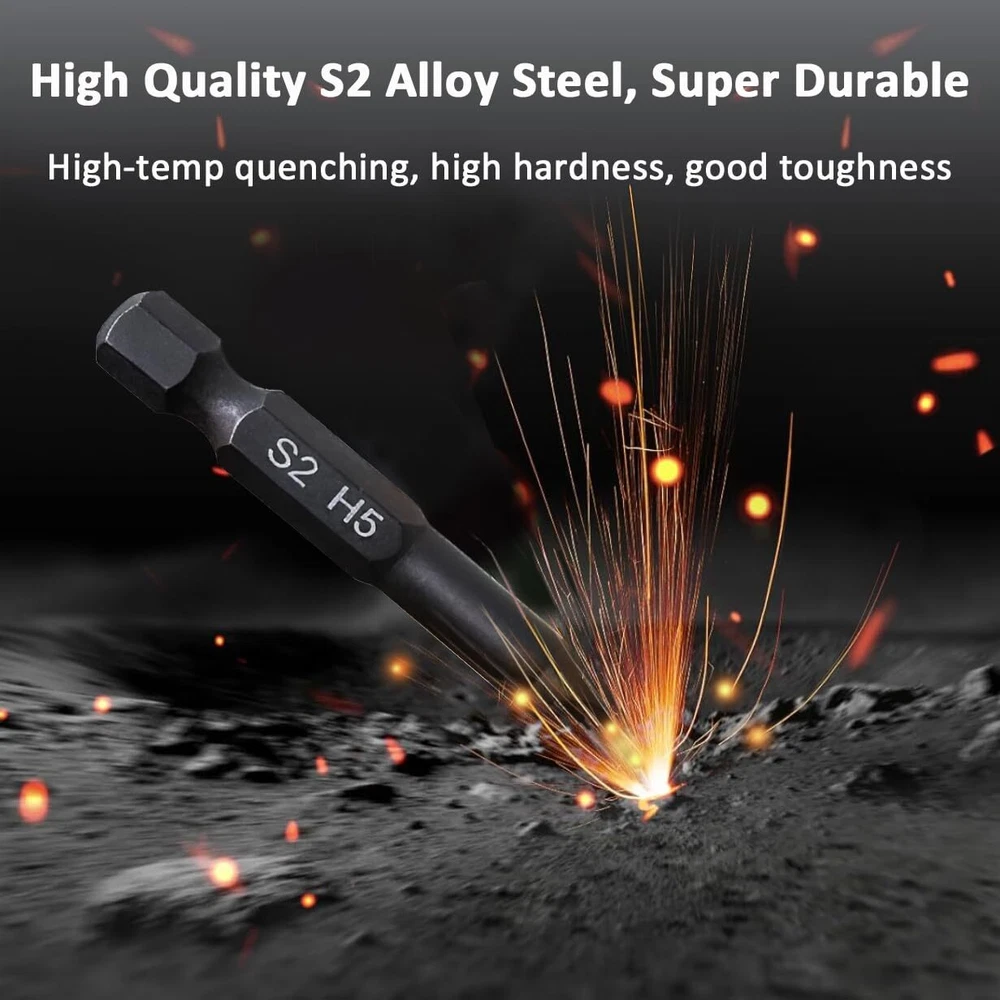 This hex bit set includes 10pc Metric: 1.5mm, 2mm, 2.5mm, 3mm, 3.5mm, 4mm, 5mm, 6mm, 7mm, 8mm and 10pc SAE: 5/64, 3/32, 7/64, 1/8, 9/64, 5/32, 3/16, 7/32, 1/4, 5/16 inches, and is 2 inches (50mm) long. Made from selected S2 alloy steel material with vacuum high-frequency quenching treatment, these Allen wrench bits for drill a hardness of 58-60HRC. This ensures long-lasting durability and precision, even under heavy use. The magnetic feature also makes it easier to handle and use the bits without worrying about them slipping out of place. Implementing Siemens CNC integrated processing for Bits results in integral molding, leading to increased precision and standardization in size. The high concentricity is ensured for better performance. This ensures excellent quality by using preferred materials. The black phosphate treatment of the allen key drill bit set provides additional protection against corrosion. Each bit is clearly marked with laser etching, making it easy to identify the size and type of bit you need. Hex bits are magnetic and can easily connect with screws. We guarantee the quality and durability of our products, the product comes with a 1 year warranty, and if any bits break during use, they will be replaced for free. Give it a try now!