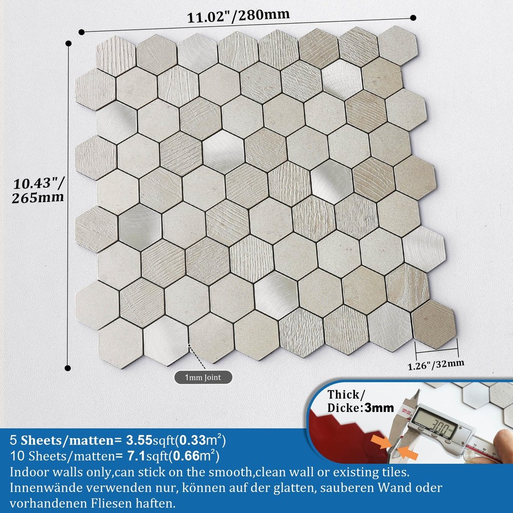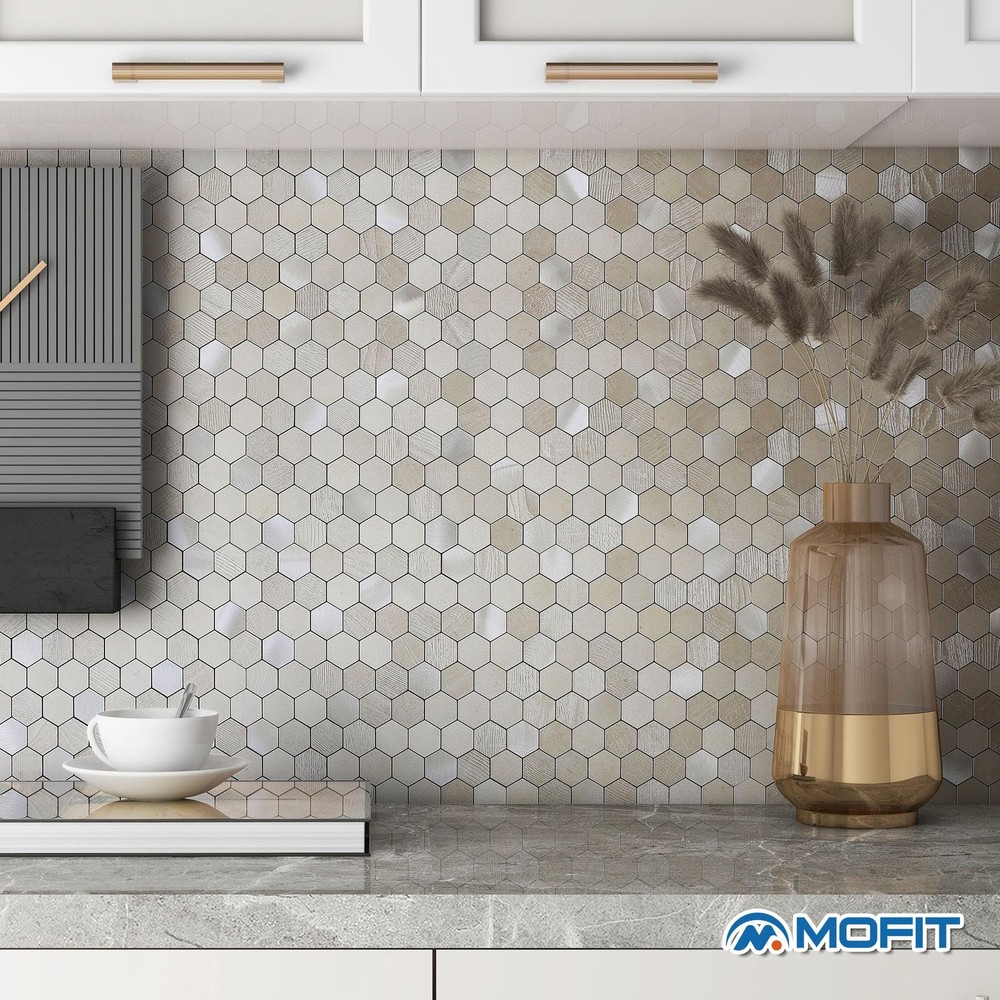 backsplash for kitchen wall honeycomb, honeycomb peel and stick backsplash, back splash stick on tiles for kitchen, self adhesive backsplash for kitchen, marble peel and stick backsplash Quality Hexagon Peel and Stick Backsplash:This peel and stick tile is great quality. It looks like a real stone tile and feels elegant in hand. The product is well made from aluminum composed material and mixed with brushed metal chips, matches your home appliances Thick and heavyweight than common ceramic tiles: Looks expensive tile job, beauiful texture and pattern. With mini gaps between chips, the sheets fits perfectly with each other. This wood-look tile is resistant to fading, water-proof, heat-resistant, great product material Strong Peel and Stick Backing:The stick on adhesive is very strong. Need to plan ahead for installation as it's peel and stick type. Once it sticks to the wall, not easy to readjust positions or take down. Applicable surfaces: flat painted wall, drywall, ceramic/glass/marble/tile, metal/plastic/acrylic surface, sealed/polished/painted wood Easy to apply:These are individual hexagon mosaic tiles making it easy to place them. Just peel and stick! No mess, No grout, Save cost and time! It is a quick resolution for your DIY project Easy to Cut:The stick-on backsplash tiles cut easily, scoring it with a box cutter and then bending/snapping it - once bent, cutting through the backing with heavy duty scissors worked great. A hand saw will make the cuts cleaner as these are made of a metal composed material