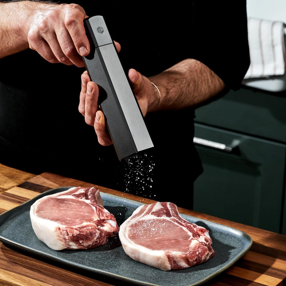 LIGHTNING-FAST PRODUCTION: The HexClad Salt Mill Grinder outperforms other top-rated salt mills, producing salt faster than ever before thanks to its unique burr grinder design that offers superior consistency and speed compared to traditional blade grinders. THE PERFECT GRIND: With ten adjustable grind settings, this heavy-duty salt mill gives you complete control over your grind size, whether you're looking for ultra-fine powder or coarse granules. Achieve the perfect grind every time for everything from dressings and stocks to seared meats, rubs, and salads. CONVENIENT AND MESS-FREE: Refilling your HexClad Salt Mill Grinder has never been easier thanks to its button-enabled quick-release cap. And with its no-mess bottom cap, your table and countertop will stay free of salt residue. UNBEATABLE QUALITY: The 1 lb solid milled aluminum body of this salt mill is built to last and preserve freshness, ensuring that you get the most out of your salt. Plus, the ceramic material in the grinder prevents corrosion, ensuring that your salt is always fresh and flavorful. SUPERIOR CONSISTENCY: The unique burr grinder design of the HexClad Salt Mill Grinder ensures that your salt is ground to the same consistency every time. Not recommended for use with moist salts such as Celtic Sea Salt. Product Description Explore the HexClad Catalog Add to Cart Add to Cart Add to Cart Customer Reviews 4.6 out of 5 stars 377 4.6 out of 5 stars 377 4.6 out of 5 stars 377 4.6 out of 5 stars 377 Price $105.00 $ 105 . 00 $105.00 $ 105 . 00 — $96.00 $ 96 . 00 Material Aluminum Aluminum Aluminum Aluminum Grinder Width 2.5 inches 2.5 inches 2.5 inches 1.6 inches Grinder Height 9.5 inches 9.5 inches 9.5 inches 4.5 inches Grinder Weight 1 lb 10.2 oz 1 lb 10.2 oz 1 lb 10.2 oz 1 lb 7 oz Great For... Freshly Ground Salt Freshly Ground Pepper Freshly Ground Salt and Pepper Freshly Ground Salt and Pepper