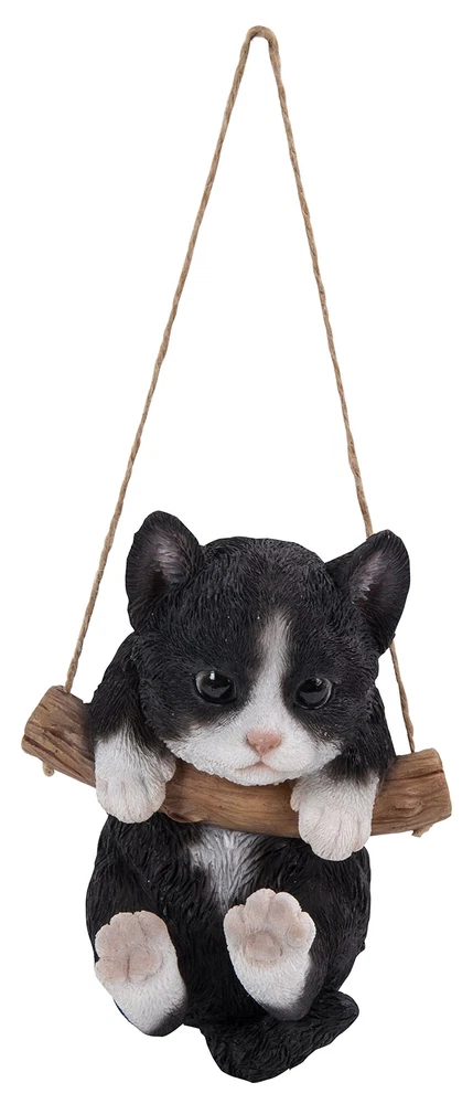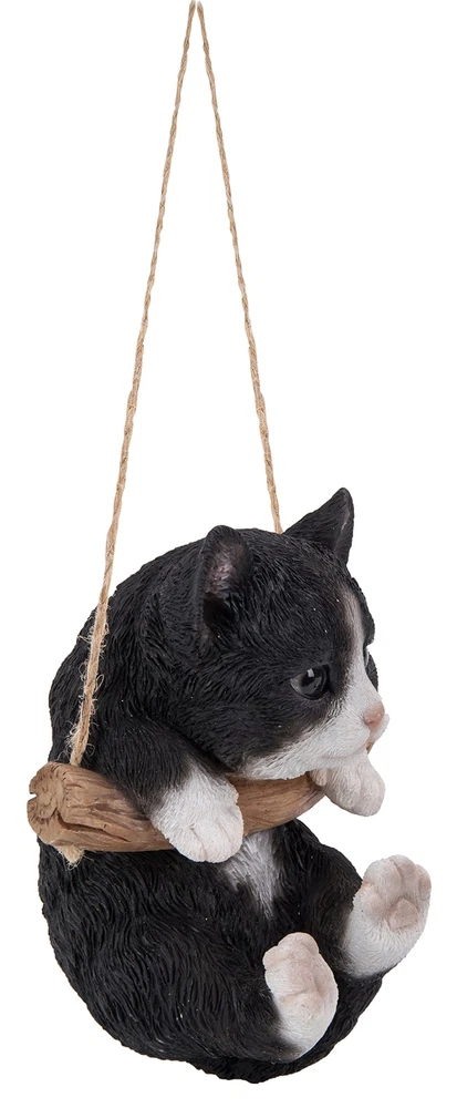 Detailed black/white kitten figurine hangs precariously. Stunning craftsmanship with realistic details & features. Add a fun & unique element of charm to your garden, deck, home, office, or any outdoor space with this adorable kitten. Made of polyresin Great for home and garden decor Good for indoor and outdoor use
