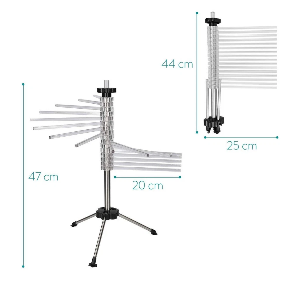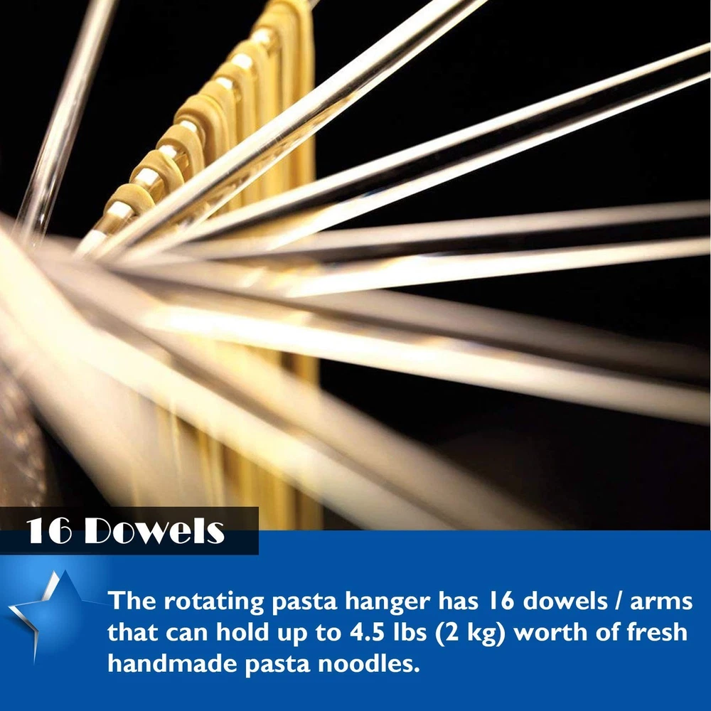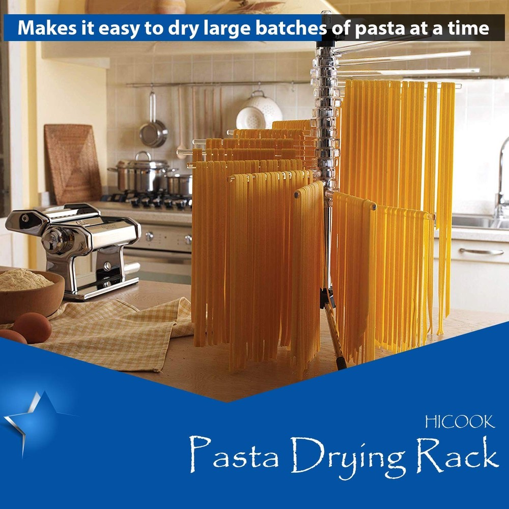 Hicook Pasta Drying Rack Collapsible Spaghetti Dryer Stand Noodles Drying Holder Hanging Rack Tall Spaghetti Noodle Dryer Stand Pasta-Tree Product Details Product Dimensions: 9.84 x 1.97 x 17.32 inches Item Weight: 1.92 pounds Manufacturer: Hiccok Item model number: KA511A0AB19 Date First Available: May 10, 2019 ALL TYPES OF PASTA: Dry all types of pasta including fettucine, spaghetti, vermicelli, linguini and more. The stand also makes it easier for cutting pasta. DRY MORE: The rotating pasta hanger has 16 rods that can hold up to 4.5 lbs (2 kg) worth of fresh handmade pasta noodles . BONUS PASTA WAND: Includes a specially designed pasta wand to lift pasta on and off arms, bonus wand stores inside the center tube when not in use. ANTI-SLIP: The plastic and stainless steel drying tree has three anti-slip rubber feet on the bottom so it will remain stable on any kitchen countertop. PASTA TREE: Dry freshly made pasta on the "pasta tree" drying rack, then fold it up for convenient storage when you're done. HICOOK Pasta Drying Rack Fresh homemade pasta is easier than ever when you use the pasta tools by HICOOK. Don't want to make fresh pasta over and over? This pasta drying rack allows you to dry pasta so that it is easier to store for later use. This pasta-drying rack has 16 adjustable rods for hanging freshly cut pasta strands to dry. Please notice that due to the plastic material and all of this product are assembled by workers, There may be scratch on the surface of the 16 rods. All of the products are original brand new products. Wipe clean with a damp cloth and dry, clean before first use. Pasta rack holds up to 4 1/2 lb. fresh pasta (about 8 servings) in a compact space. Fairly easily assemble and disassemble by the knob on the top.Quickly set up on table in less than 20 seconds. Fan design makes hanging and removing pasta strands easy. Folds flat for easy storage. Designed like a tree with branches spreading as higher. Make sure that all your longer types of pasta, such as spaghetti,fettuccine,lasagne sheets, will not stick together. Ensure that your pasta dries more quickly,and also convenient to store them. Simply wipe clean with a cloth, Do Not place it into dishwasher. Dimensions: 17.5 x 9.8 inches Package:1 pasta drying rack, 1 pasta wand Simply click the "Add to Cart" button at the top right of this page to place your order now! Preparing your own homemade pasta has its own excitement.With right ingredients and this very useful pasta drying rack, nothing is impossible.You will enjoy the authenticity,taste and freshness of homemade pasta.Ending in delicious pasta and a very happy you.