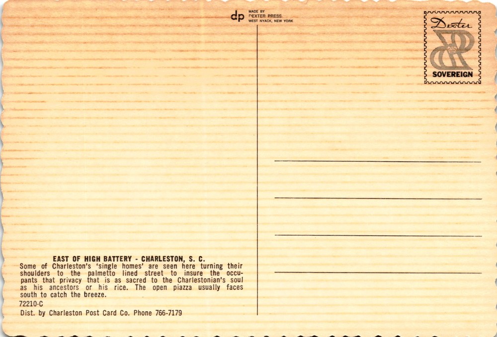 MAKE AN OFFER. THE MORE YOU BUY THE BETTER DEAL I WILL ACCEPT This postcard depicts a street east of High Battery in Charleston, South Carolina, showcasing some of the city's iconic single homes. These homes are known for their unique architectural style, featuring a side entrance and a long narrow layout to provide privacy to the occupants.