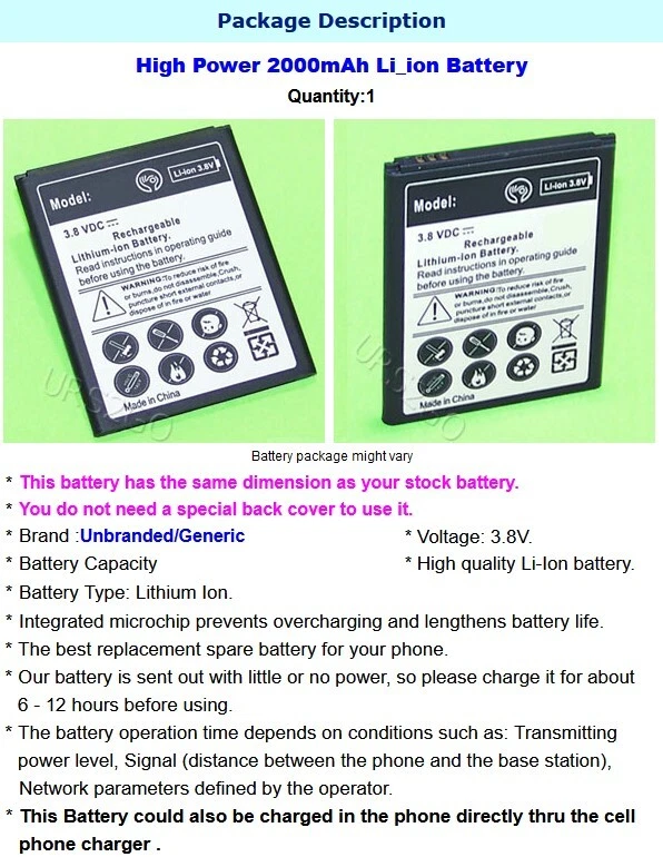 High Capacity Battery for Samsung Galaxy Ace Style S765C Straight Talk Cellphone High Capacity 2000mAh Battery for Samsung Galaxy Ace Style S765C * This package is specifically designed for Samsung Galaxy Ace Style Model S765C from Straight Talk/Net10 as we stated in our listing. * If you do not have Samsung Galaxy Ace Style S765C , this package is not for you Package Content: 1x 2000mAh Li_ion Battery Compatible with: Samsung Galaxy Ace Style S765C( Straight Talk/Net10) Package Description High Power 2000mAh Li_ion Battery Quantity:1 Battery package might vary * This battery has the same dimension as your stock battery. * You do not need a special back cover to use it. * Brand : Unbranded/Generic * Voltage: 3.8V. * Battery Capacity : 2000 mAh * High quality Li-Ion battery. * Battery Type: Lithium Ion. * Integrated microchip prevents overcharging and lengthens battery life. * The best replacement spare battery for your phone. * Our battery is sent out with little or no power, so please charge it for about 6 - 12 hours before using. * The battery operation time depends on conditions such as: Transmitting power level, Signal (distance between the phone and the base station), Network parameters defined by the operator. * This Battery could also be charged in the phone directly thru the cell phone charger . Payment Terms Payment Terms We are an US based seller * We only accept PayPal payments. * On this item we do no combine shipping or have any other discounts. * We only ship to Paypal confirmed address. Please make sure your shipping address is updated. Sellers are not responsible for wrong shipping address. Please contact us for International orders outside of US. * If you pay by Paypal's e-check, we will ship your order once your payment is cleared. * To avoid an unpaid item dispute, all payments must be received within 7 days from the end of auction.