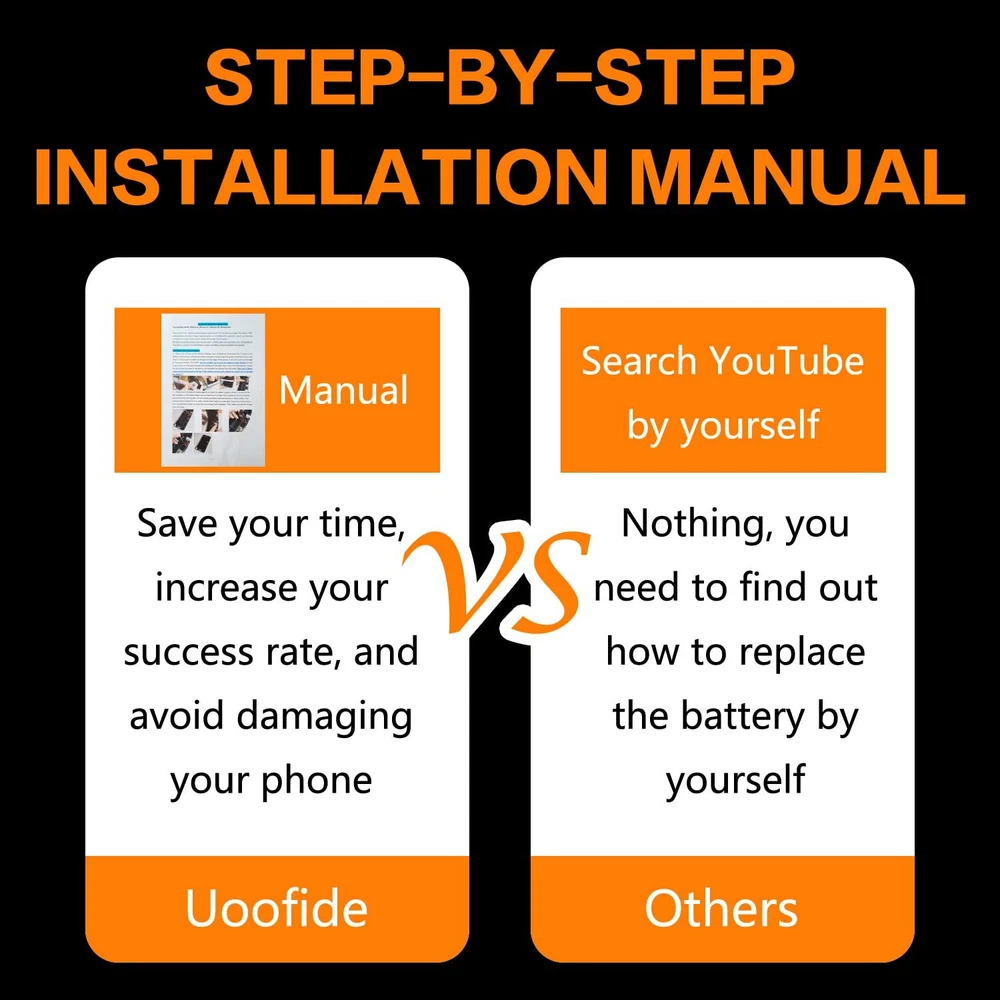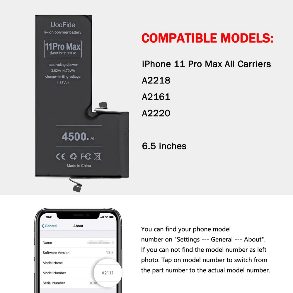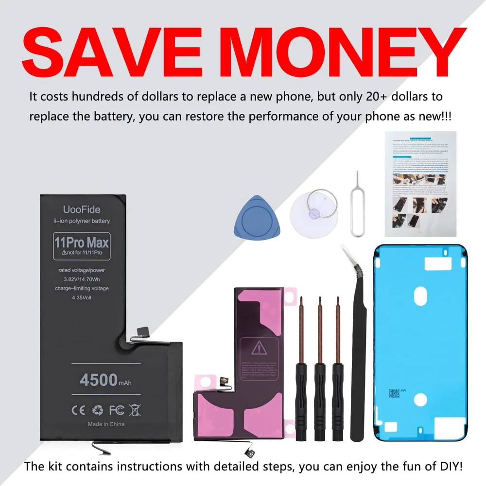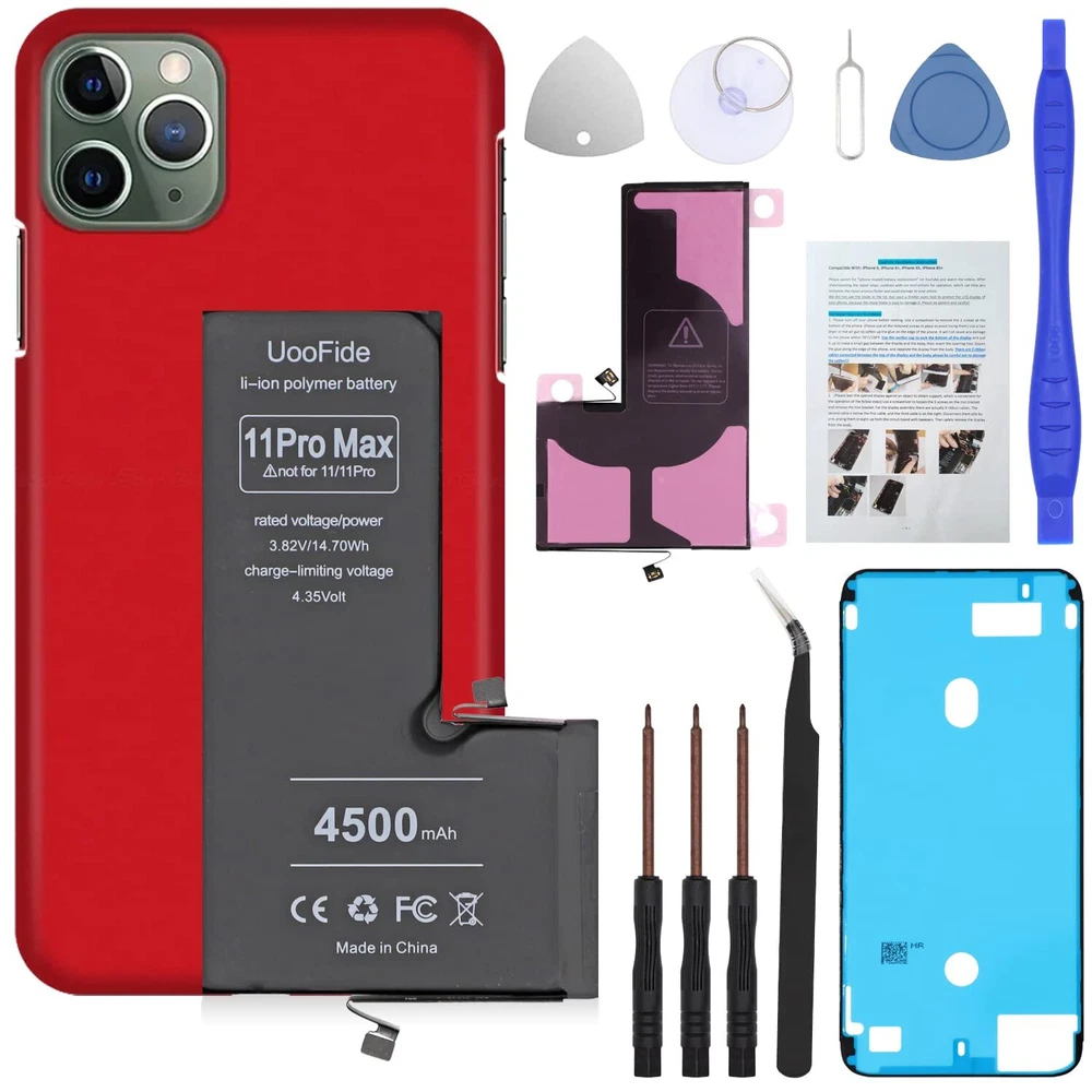 【Latest IC Chip Smart Power Housekeeper 】- Use the latest cost-effective smart IC chip on the market now which same as the original 11 Pro Max battery, combined with the latest science and technology at the same time, so that the battery has an exclusive smart power housekeeper which can intelligently control and distribute the power, maximize power conversion rate. Longer power life without bothering about running out of power and shut down some apps all the time. 【100% Size Fit Ultra High Capacity Battery】- With the top-rate premium high-tech integrated lithium polymer battery cell with CE, UL and ROHS certification, which can effectively to prevent from over-charging, over-heating protection and over-discharging. This 11 Pro Max battery replacement for features a much higher capacity——4500mAh more power life. Brand new 0 cycle, last over 1000 cycles. Real a safe and durable battery! ★Only compatible with 11 Pro Max all carriers. 【Your Time And Patience Are Very Valuable】- Does your often turn off because of no electricity, causing some trouble? Do you have to close some applications to save power? Do you want a better performance phone, but the cost of replacing a new phone is too high? If yes, then please choose our high capacity 11 Pro Max battery. It is the most affordable and quickest way to bring life back to your phone with our extend battery for 11 Pro Max. 【Contains Professional Installation Manual】- Are you worried about how to install it? Don't be afraid, we provided a professional and detailed installation manual to guide you through the installation step by step. We also have a 24-hour online engineer, ready to answer your questions. Let you install the whole process worry-free. It is very cost-effective to change one by yourself, so why not try to repair the phone yourself? You can also enjoy the fun of DIY and the joy of success!!! 【Risk-Free Shopping And Quality 】- We provide 12 MONTHS to our dear customers. If you have any questions about this upgraded 11 Pro Max replacement battery, please don't hesitate to contact team directly, we will try our best to serve you. We cares every customers and your shopping experience is very important to us. take care of all quality-related issues with a refund or replacement. No risk, order now!!!