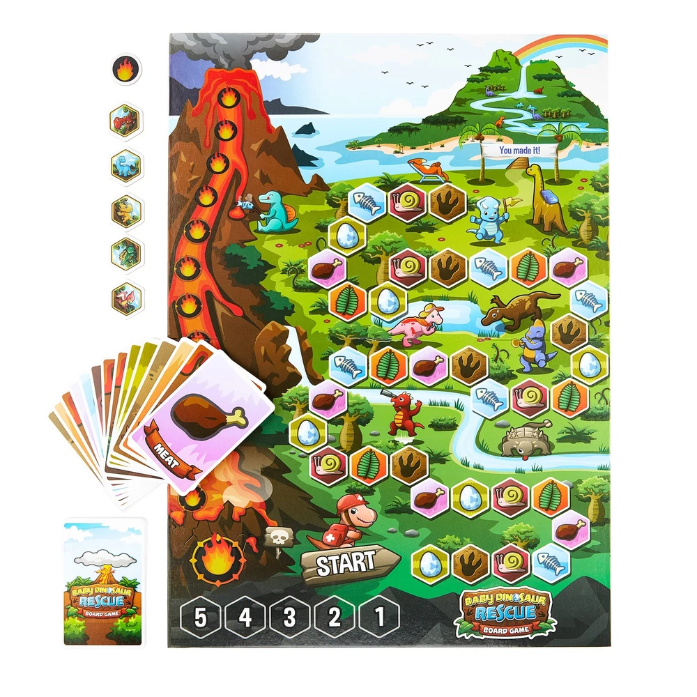 Jumping High Five Baby Dinosaur Rescue! Cooperative Dinosaur Board Game, Kids Ages 4+ Help Dinos Race to The Island, Easy to Learn and Great for Family Game Night Baby Dinosaur Rescue! A cooperative kid's matching board game where children ages 4-8 work together to get all the dinosaurs to the safety of the island before lava fills the valley. Players work together to help all of the dinosaurs make it to the island. Play an item card and hike across the valley to that space. Draw a lava card and the lava gets closer to filling the valley. Help all the dinosaurs get to the island before the lava token reaches the last space and everyone wins! Three levels of play allow this game to grow with your child. Game includes 1 game board, 5 dinosaur tokens, 1 lava token, 13 lava cards, 36 terrain cards and three versions of game play. Children will learn many new skills including: -Problem Solving - Following Directions - Speech Skills- Taking Turns - Social Development – Cooperation. THE DINOSAURS NEED YOUR HELP – Players must work together to help the dinosaurs reach dinosaur island before the lava reaches the valley. Using image-based cards, players will work together to move the dinosaurs across spaces with matching images to outrun the lava! NO READING REQUIRED – Simple instructions and image-based play makes this the perfect introduction to board games that also teaches essential skills like matching, communication, and teamwork. LEARN TOGETHER, WIN TOGETHER – Baby Dinosaur Rescue emphasizes play and collaboration instead of competition. Players share ideas and strategies together to overcome obstacles while they learn new skills through screen-free fun! PERFECT FOR FAMILY GAME NIGHT – The cute and vibrant details in Baby Dinosaur Rescue create an imaginative setting that both kids, parents, and teachers will love. SUPPORT A FAMILY-OWNED SMALL BUSINESS – We’re a small, dedicated team of teachers, artists, and game lovers who are passionate about creating fun and educational games that bring families together. By choosing Baby Dinosaur Rescue, you’re not only supporting a small business but also helping us continue our mission of creating meaningful, cooperative play experiences for kids and families. Shipping from the USA All of our products are shipped from the USA, ensuring quick delivery to your destination. Payment We offer the following payment methods: PayPal, credit card, bank transfer, and eBay's secure payment system. Free Shipping & Free Returns Shipping within the USA is FREE. Additionally, any return is absolutely free for you. Risk-Free Purchase You have the option to return an item within 30 days without any justification. We cover the return shipping costs! Fast Shipping We ship immediately upon receipt of payment. Generally, the package is delivered within 2-3 days in the USA. If it takes longer, we will contact you. Quality and Costs Made in Europe, USA, China No customs fees or additional charges Total satisfaction guarantee Invoice with declared VAT available upon request in .pdf format Feedback Your feedback is very important to us. After you pay for your purchase, you will automatically receive positive feedback from us.