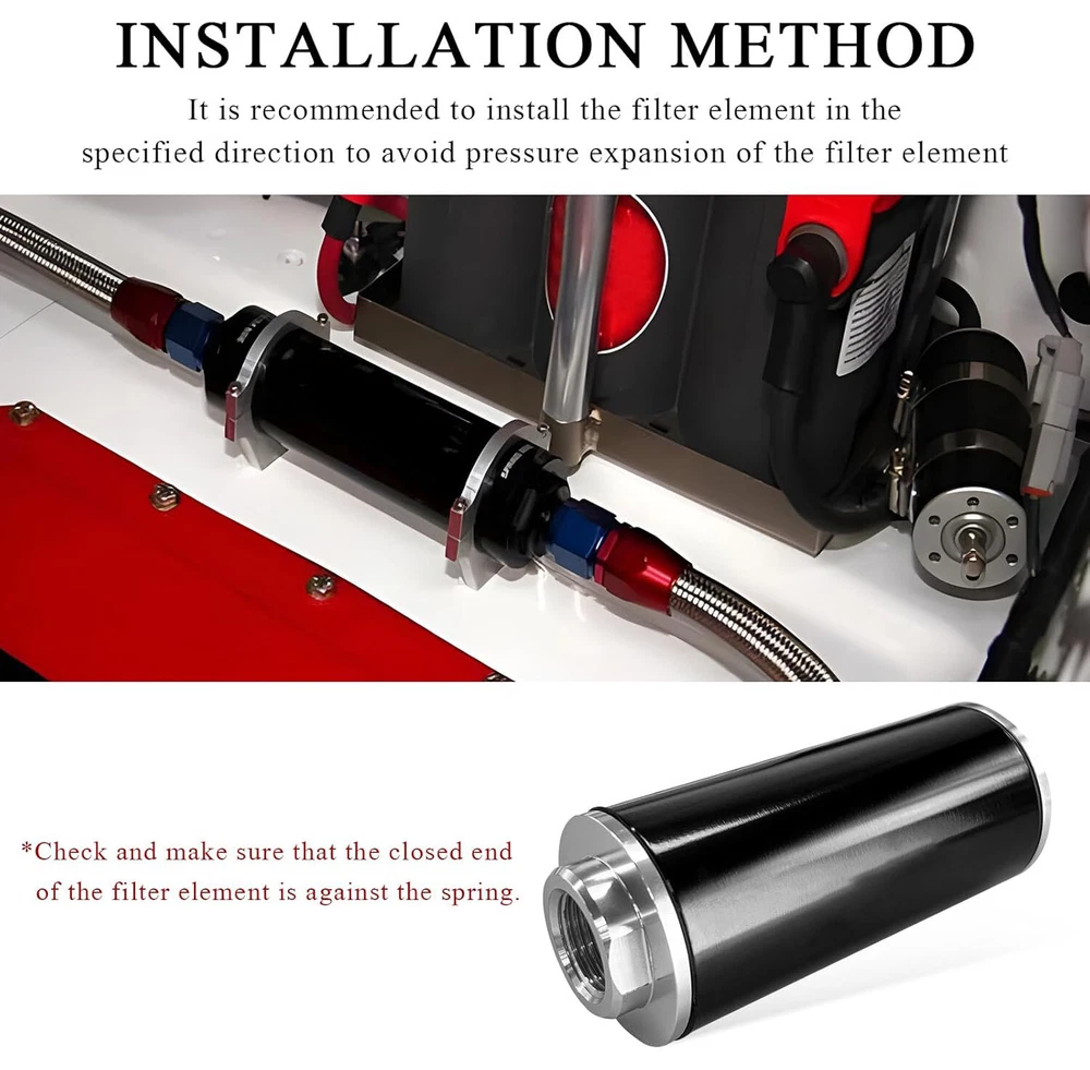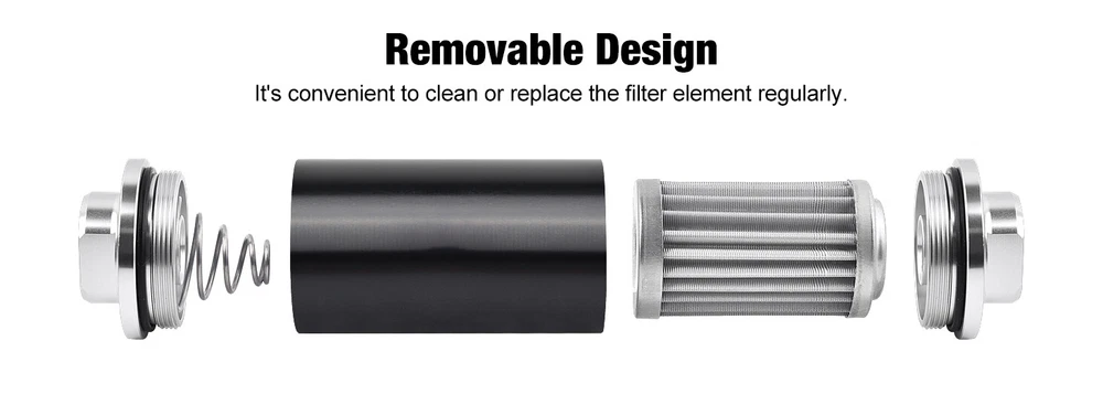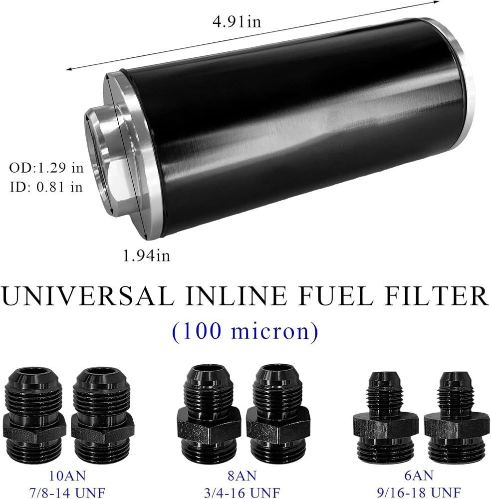 High Flow Inline Fuel Filter 100 Micron Cleanable 6AN 8AN 10AN Adapter Universal Item Description [Application] Universal fuel filter, includes an6, an8, an10 adapters for different size applications. [Material] Aluminum alloy fuel filter can and stainless steel filter element. [O-ring] The o-ring provides a tight seal for fittings and end caps. [Function] Can be used for filtering gasoline, diesel, E85, etc. Captures contaminant particles of 100 micron and above to protect the fuel system of the vehicle. [Feature] Removable design, easy to clean or replace filter element at regular time. Specifications Condition:100% Brand New Warranty: 90 Day Free Return:30 Day 100 Micron Fuel Filter 50mm Universal for AN6 AN8 AN10 fuel lines Material: Aluminium Alloy Body and Stainless Steel Filter Screen Color:Black Fitment For Honda, Subaru, Toyota, Hyundai, Mazda, Suzuki, Mitsubishi and other hydraulic transmitters. Package Included As pictures show FAQ: I purchased by mistake, how do I cancel the order? Please contact us ASAP. If the item has not been shipped out we can cancel the order for you. If the item was shipped out you can refuse the package and wait for the item to return to us. I received your item but it does not fit or is defective Please contact us so we can assist you on the matter. Buy with confidence Our quality is based on meeting the requirements of the manufacturer and improvement them in design problems manufacture. NOTE: (1)It would be highly appreciated if you might contact us first once you have any problems concerning the items. And you can expect all the issues would be resolved ASAP! (2)Please let us know before you send us the neutral/negative feedback that wont help to finish the issues. And I will definitely try my best to provide the best solutions which would meet our satisfactory! (3)According to the distance of the receipt address items would be sent from CA or NJ