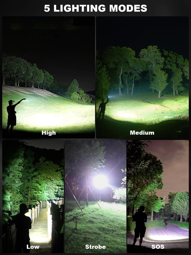 【Super Bright & Comfortable Experience】GOHOMAN super bright flashlight can achieve a maximum output of 900000 lumens, with constant brightness and no flicker, providing a comfortable visual experience. The LED flashlight has USB fast charging, IPX6 waterproof, and anti-drop function. simple use method, and is easy to carry. 【USB Rechargeable & Energy Conservation】LED flashlight high lumen rechargeable with a large capacity of 5000mAh Βattery (included) uses USB for fast charging, which is very energy efficient and environmentally friendly. Flashlights usually take 3-4 hours to charge and can be used for 8-12 hours, with each power state representing 25%. 【5 Lighting Modes & Adjustable Focus】Our high-lumen rechargeable flashlight comes in 5 modes (high/medium/low/flash/SOS), press the 3S button to turn off all modes. The brightest flashlight ever made has adjustable focus, and we have adjusted the grid lines to a maximum range of 3280 feet for clearer remote viewing. 【High-Quality Materials & IPX6 Waterproof】2 Pack flashlights are made of high-quality aviation aluminum and can withstand a drop of 10 feet. The surface has undergone hard oxidation and wear-resistant treatment, making it easy to dissipate heat and waterproof. It is very suitable for home, fishing, patrolling, work, power outages, hiking, camping, or as a gift for family. 【A pleasant experience】GOHOMAN ultra bright flashlight will bring you a comfortable experience. We always value quality, integrity, and dedication. If you receive a defective flash light, please contact us.
