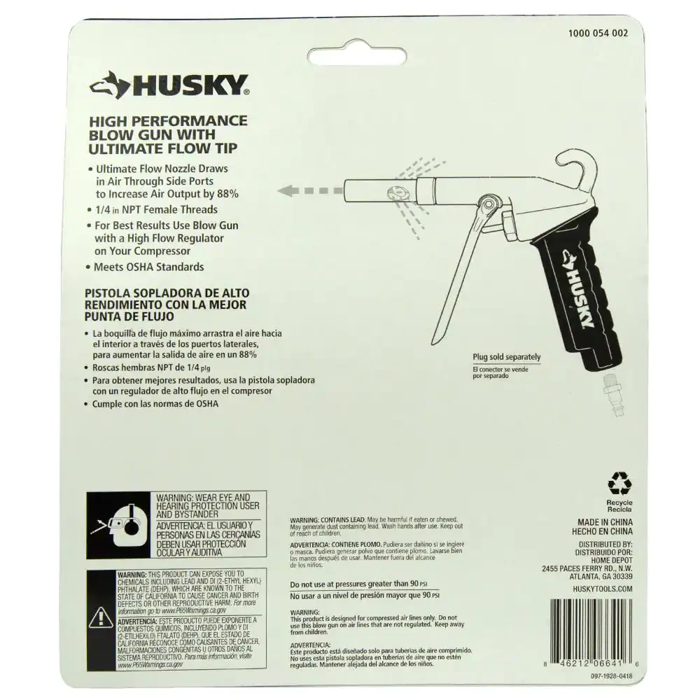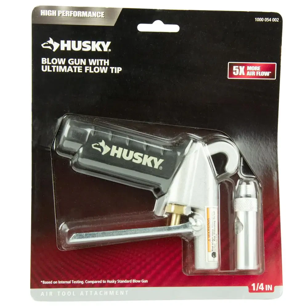 High Performance Blow Gun with Ultimate Flow Tip Aircompressor Tool Delivers 88% more air flow than standard blow guns Flow tip draws in air via side ports to increase air delivery Ideal for large workshop areas, outdoor furniture and more Get the ultimate air flow with this Husky High Performance Blow Gun. This reliable tool delivers 92 SCFM and 88% more air flow than standard blow guns. The ultimate flow tip draws in air through the side ports, increasing air delivery and providing more than enough power to clean large workshop areas, outdoor furniture, large machinery, lawn mower decks and heavy equipment. It comes with a large storage hook for easy access and meets OSHA standards. Fits any air hose with 1/4 in. NPT threads Pistol grip style blow gun is designed with a durable cast aluminum body and comfort grip to reduce fatigue For best results, use this blow gun with a high flow regulator on your compressor Product is designed for 90 psi compressed air lines only, do not use this blow gun on air lines that are not regulated Accessory Type Blow Gun Air Tool Type Accessory Compressor/Air Tool Features Vented Nozzle Included No additional components or accessories are included Product Weight (lb) 0.32 lb Reconditioned No Returnable 90-Day Tools Product Type Air Tool Vented nozzle Yes Product Depth (in) 0.75 in Product Height (in) 5.25 in Product Width (in) 4 in 4.0 inches x 0.75 inches x 5.25 inches. Weight: 0.32 lb