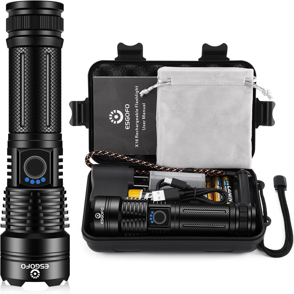 High Power Rechargeable Flashlight LED High Lumens, Super Bright 900000 Lumens Handheld Flash Light, Powerful Emergency Linternas, Waterproof, Long Lasting, for Hiking Camping Gift [SUPER BRIGHT HIGH BRIGHTNESS 900000 LUMENS] The high lumens flashlight is made of upgraded super bright LED chip, the brightness can be up to 900000 lumens. It will can light an object up to 500 meters away, there is no any problem to light a 120 square meters room. This high powered flashlight is perfect for hiking, camping, fishing, dark walk, emergencies or other outdoor activities, a compact handheld flashlight for home backup [USB C RECHARGEABLE & LONG-LIFE & POWER INDICATOR] This high power flashlight can provide 8-12 hours of powerful, non-diminishing brightness. Built-in a USB C charging interface, suitable for power bank, socket, laptop or any other USB devices, convenient for indoor and outdoor charging. The LED display shows the exact battery level (25%, 50%, 75%, 100%). You will know how long it will last and charge it in time [DURABLE & WATERPROOF& COMPACT] The powerful flashlight is made of aluminum alloy, with the metal body, it is durable, shockproof, waterproof, can work in raining day, snow day, storm day or other bad weather. As a compact handheld size,it is easy to carry and store. it is ideal for home backup,night reading or sudden is also perfect for hiking, camping, dark walk, emergencies or other outdoor activities [ADJUSTABLE & 5 MODES] : Push/pull the head to adjust the beams depending your need, the flood light is for near distance,spot light is for far distance up within 300 meters. Deep Press the tails switch to turn on/off .When it is on,press gently to change modes:high/middle/low/Strobe/SOS,SOS mode is great for emergency aid,The high mode will last 6 hours,the weak mode will last up to 12 hours [EXCELLENT CUSTOMER SERVICE] We are providing high quality products and the best customer service as our aims. We have tested each item before shipping and confirm each one is working properly. And we are 24 hours online, please feel free to contact me in the first time if there is anything wrong with the product. Wish you happy every day