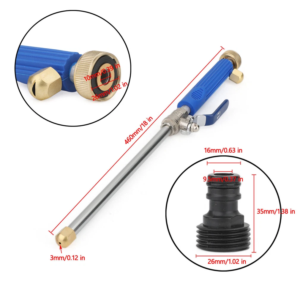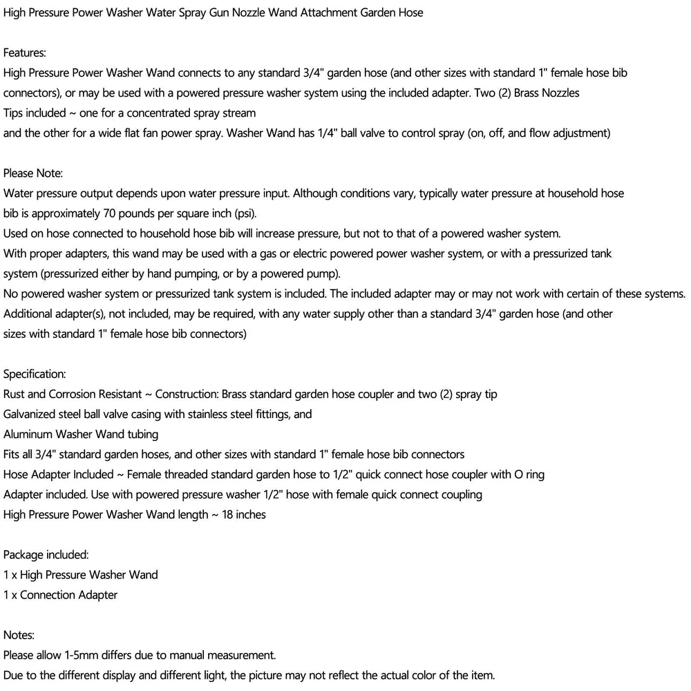 High Pressure Power Washer Water Spray Gun Nozzle Wand Attachment Garden Hose Features: High Pressure Power Washer Wand connects to any standard 3/4" garden hose (and other sizes with standard 1" female hose bib connectors), or may be used with a powered pressure washer system using the included adapter. Two (2) Brass Nozzles Tips included ~ one for a concentrated spray stream and the other for a wide flat fan power spray. Washer Wand has 1/4" ball valve to control spray (on, off, and flow adjustment) Please Note: Water pressure output depends upon water pressure input. Although conditions vary, typically water pressure at household hose bib is approximately 70 pounds per square inch (psi). Used on hose connected to household hose bib will increase pressure, but not to that of a powered washer system. With proper adapters, this wand may be used with a gas or electric powered power washer system, or with a pressurized tank system (pressurized either by hand pumping, or by a powered pump). No powered washer system or pressurized tank system is included. The included adapter may or may not work with certain of these systems. Additional adapter(s), not included, may be required, with any water supply other than a standard 3/4" garden hose (and other sizes with standard 1" female hose bib connectors) Specification: Rust and Corrosion Resistant ~ Construction: Brass standard garden hose coupler and two (2) spray tip Galvanized steel ball valve casing with stainless steel fittings, and Aluminum Washer Wand tubing Fits all 3/4" standard garden hoses, and other sizes with standard 1" female hose bib connectors Hose Adapter Included ~ Female threaded standard garden hose to 1/2" quick connect hose coupler with O ring Adapter included. Use with powered pressure washer 1/2" hose with female quick connect coupling High Pressure Power Washer Wand length ~ 18 inches Package included: 1 x High Pressure Washer Wand 1 x Connection Adapter Notes: Please allow 1-5mm differs due to manual measurement. Due to the different display and different light, the picture may not reflect the actual color of the item. -About US Founded in 2012, VIPJQ have professional development and sales, and are involved in various products, providing customers with various high-quality products. Since its establishment, VIPJQ has always adhered to the service concept of "customer first" and the management concept of "pursuit of quality", and is committed to providing customers with high-quality original designs. We commit to provide you the best innovative, quality products & professional services with competitive prices. We value every customer, and we look forward to providing solutions for your business needs to help your business achieve its goals, please contact us immediately! We are all about you! We are a Japanese seller,but with large warehouse in USA. We are profesional on Auto Parts,Car Parts,Motorcycle Parts,3C,other hot sale items and so on. We aim to provide to customers high quality product and best service. -About Shipment&Returns The item usually will be dispatched within 3 days after you ordered.All are free shipping. And it usually takes 3-5 working days to delivery depends on buyers' address or other majeure on the way. If you are not satisfied with the items and want to return the item,we hope you could message us first,we will give you the return details, we think we could give you the best service to save your time and money.Thank you. -About Feedback&Customer Service If you are enjoy your shopping here,not only enjoy the items but also the service,we are appreciate you could give us a 5-star feedback. If you are not satisfied with the item,before you give us the negative feedback,we hope we could give you the best solution through our commutication. We think we could do it if you give us the chance.Thank you.