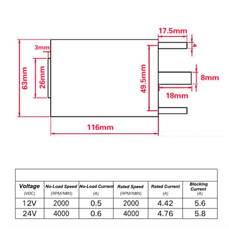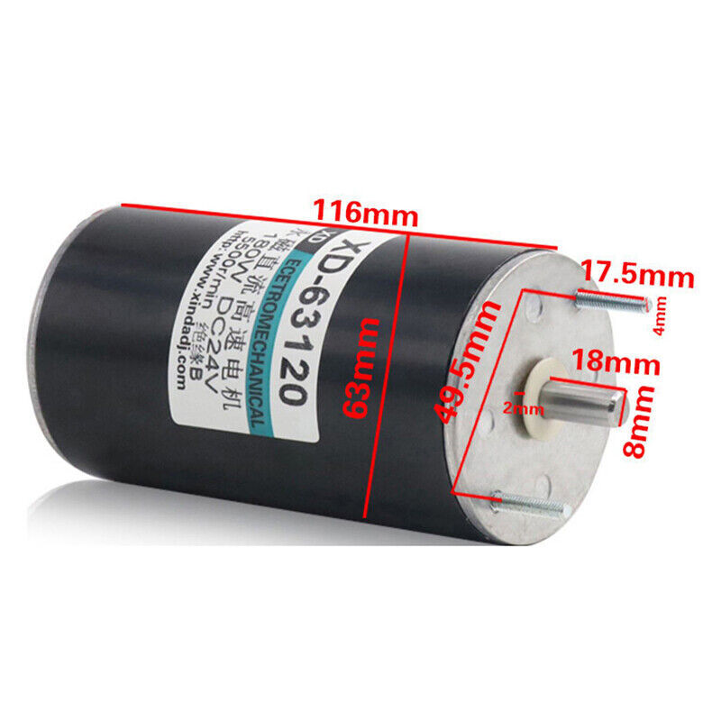 180W High Speed Motor DC 12V 24V Permanent Magnet Reversible Motors 2000/4000RPM ●Product Properties : Motor Model : 63120 Power Supply : DC 12V 24V Speed : 2000RPM , 4000RPM Shaft Diameter : 8mm Shaft Length : 18mm Motor size : 116 x 63mm Motor Power : 180W Current : 0.5A , 0.6A ●Product Features : Pure copper motor, high temperature resistance, high conductivity, strong power and long life. Double ball bearings with hard mechanical characteristics, stability, good control, convenient no-rotation loss and high efficiency. High strength magnet, magnetic stability, high magnetic energy, high performance, high temperature resistance and other characteristics. ●Use : Cutting machine, bag cutter, lawn mower, electric drill, wire winder, cotton candy machine.