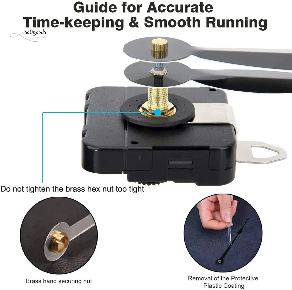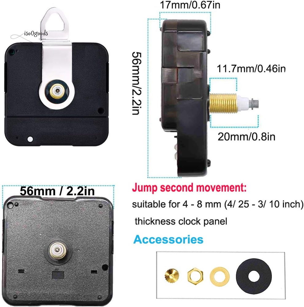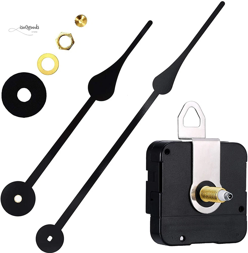 High Torque Clock Movement Kit with Metal Hook Reliable & Durable: Drive long clock hands (10 mm to 450 mm) with ease using this high torque clock movement. The 230 mm (9.1 inch) long hand fits dials up to 56 cm (22 inches) in diameter. Perfect for repairing, replacing, or creating your own clock, the simple style seamlessly blends with any clock panel's colors, patterns, and shapes. Precise Time-Keeping: This motor ensures accurate time with a total shaft length of 20 mm (4/5 inch) and thread length of 11.7 mm (9/20 inches), fitting clock panels 4 - 8 mm (4/25 - 3/10 inch) thick. The high precision clock mechanism, featuring a jump second movement, offers dependable accuracy and is powered by a AA battery. Versatile Compatibility: Ideal for cross-stitch, three-dimensional embroidery, craft clocks, frameless draw clocks, and DIY quartz wall clock replacement movement parts. The kit includes detailed instructions for easy installation. Complete Package: 1 x Quartz clock movement 1 x Minute hand (230 mm/9.1 inches) 1 x Hour hand (175 mm/6.9 inches) 1 x Plastic washer 1 x Brass washer 1 x Brass nut 1 x Metal hook 1 x User manual Additional Features: Simple Style Movement: Matches diverse clock panel designs without standing out. Wide Application: Perfect for various types of clocks. Material: Made from durable plastic and aluminum. Second Hand Motion: Jump Accuracy: Within ±30 seconds deviation each month (normal temperature). Power: Requires 1.5V AA battery (not included). Do not use alkaline or rechargeable batteries to prevent movement damage. Kindly Note: Remove protective plastic coating from hour and minute hands carefully. Avoid bending hands with too much pressure. Do not over-tighten the brass hex nut. Press firmly to secure all clock hands in place. Ensure all hands are aligned and check sizes before purchasing. Upgrade your clock with this high torque movement kit. Order now for a reliable, easy-to-install solution!