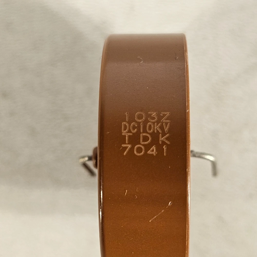 103Z DC10kV TDK 10kV Capacitor 7041. Condition is Used. See photos for capacitance reading and dimensional measurements. Measures approximately 39mm in diameter, and is about 12.3mm thick. Capacitance shows around 8 nanoFarads.