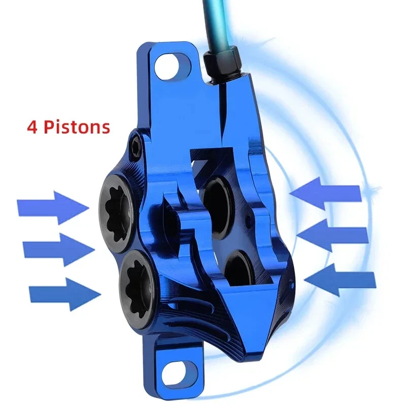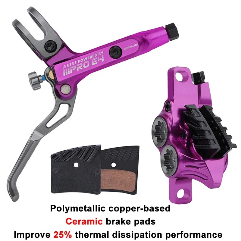 Model: E4 Color: black, red, silver, blue, green, purple Material: magnesium aluminum alloy Length: Front brake 800mm; Rear brake 1550mm Brake Pistons: 4 Pistons Brake Fluid Type: Mineral Brake Fluid Weight: about 230g for the front brake; about 245g for the rear brake; about 28g for the screw. Brake For: mountain bikes, DH,AM,folding bikes, electric bikes, etc. The brakes are the left front brake and the right rear brake Left hand controls the front brake, right hand controls the rear brake. Right rear brake suitable for internal wiring!!! 4 Piston brake Smooth and even braking Cooling brake pads The multi-metal copper-based ceramic heat sink improves the heat dissipation performance by 25%. ①Cylinder block ②M6 oil filling screw ③CNC anti-skid vent brake lever ④Built-in bearing ⑤ Travel adjustment screw ⑥22.2mm detachable clamp ring The rear brake adopts the cable routing inside the frame, and the brake lever/caliper has a split structure. German TUV safety certification, the measured braking force can reach 641N.