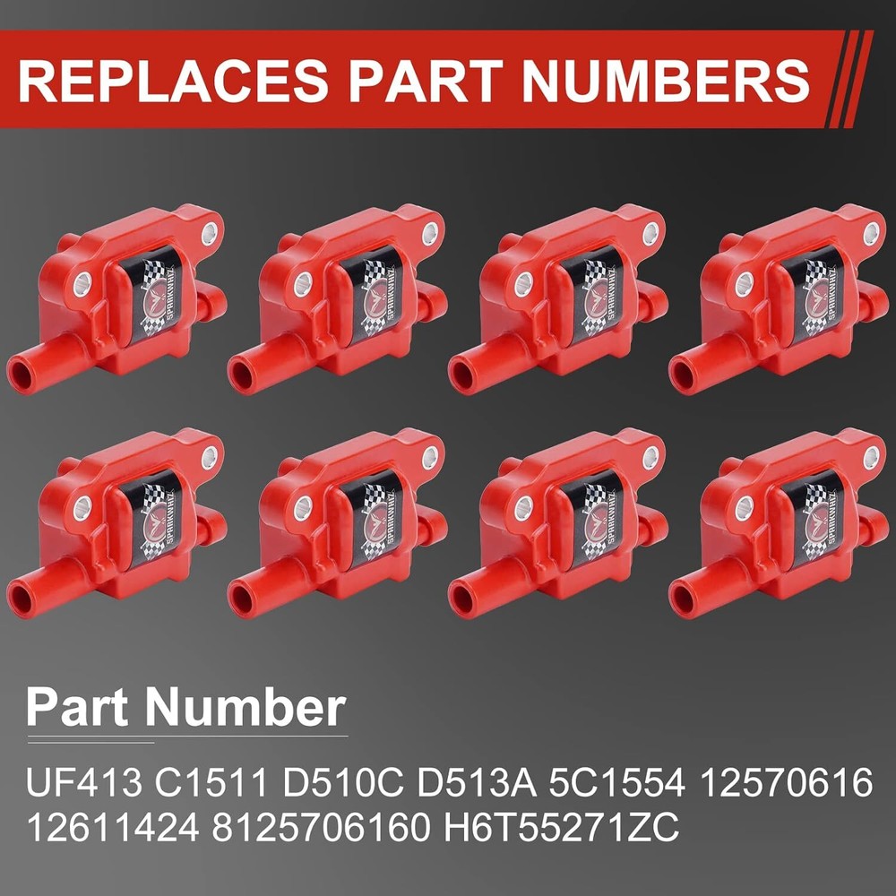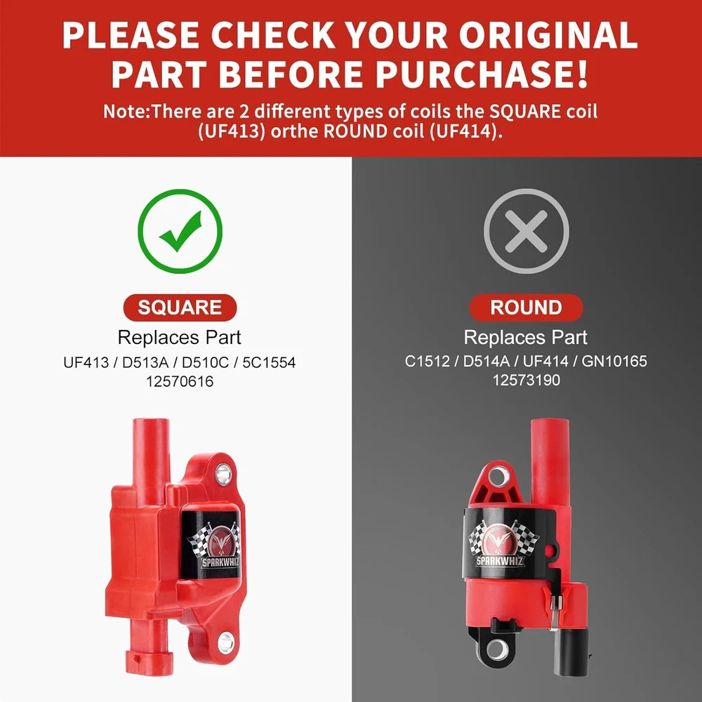 About this item Auto_bestchoice 8 Pack Square Ignition Coil & Spark Plug Wire For Chevy GMC 4.8L 5.3L 6.0L V8 About this item NOTE: There are 2 different type of coils the round body coil UF414/D514A and the Square body coil UF413/D510C , which may cause misunderstandings on your part, causing you to make the wrong choice unintentionally.Please use the year/make/model drop down bar and interchangeable part numbers to confirm compatibility. Or just check your original coils to make sure whether you need the round or square style coil. Have any questions, please contact us by email. We will reply within 12 hours. UF413 IGNITION COILS & SPARK PLUG WIRES SET are an excellent upgrade for vehicles of all performance levels. These direct plug-and-play coils provide greater discharge energy over factory ignition coils for a stronger and more consistent spark. OEM PART NUMBER: C1511,UF413,D510C,D513A,5C1554,IC533,12570616, 12611424, 8125706160, 331192, 6737002. Compatible with certain model and year vehicle of Cadillac, Hummer, Chevrolet, GMC.Please check description or fitment bar before purchasing. INSTALLATION: We recommend always spraying some silicone spray on the coil during assembly. Otherwise, the rubber may crack during disassembly.In addition, it is advisable to use the original tool. 100% SATISFACTION GUARANTEE: We offer a one-year or 24, 000 mile warranty.If the coil ever fails on your or vehicle within the warranty period, please contact us for a replacement! Item Specifics Brand Unbranded Manufacturer Part Number 12570616, UF413, E893, D510C, UF-413, 12611424, 8125706160 Connector 4 Pins Connector Gender Female Terminal Gender Male Terminal Type Blade Voltage 12V Color Red OE/OEM Part Number C1511, D513A, D510, C511, IC533, 52-1819, 5C1554 Coil Shape Square Style Spark Plug Wire Part Number 12192195, 9748GG, 748GG, 12622553, 88862397, 12192192, 748UU Type Ignition Coil Items Included 8 Ignition Coil & 8 Spark Plug Wire Payment We accept Payoneer/Paypal/Google Pay/Visa/Master Card/Amex/Discover for Payment. Shipping All package will be shipped within 1-3 business day. Returns 1.Attention: Please contact us first before starting a return request 2. Select a reason: please choose"It's the wrong size or doesn't fit " Contact Us we are very glad to help you anytime. we will reply you within 24 hour. Auto_bestchoice DESCRIPTION PAYMENT SHIPPING RETURN POLICY CONTACT US 8 Pack Square Ignition Coil & Spark Plug Wire For Chevy GMC 4.8L 5.3L 6.0L V8 About this item NOTE: There are 2 different type of coils the round body coil UF414/D514A and the Square body coil UF413/D510C , which may cause misunderstandings on your part, causing you to make the wrong choice unintentionally.Please use the year/make/model drop down bar and interchangeable part numbers to confirm compatibility. Or just check your original coils to make sure whether you need the round or square style coil. Have any questions, please contact us by email. We will reply within 12 hours. UF413 IGNITION COILS & SPARK PLUG WIRES SET are an excellent upgrade for vehicles of all performance levels. These direct plug-and-play coils provide greater discharge energy over factory ignition coils for a stronger and more consistent spark. OEM PART NUMBER: C1511,UF413,D510C,D513A,5C1554,IC533,12570616, 12611424, 8125706160, 331192, 6737002. Compatible with certain model and year vehicle of Cadillac, Hummer, Chevrolet, GMC.Please check description or fitment bar before purchasing. INSTALLATION: We recommend always spraying some silicone spray on the coil during assembly. Otherwise, the rubber may crack during disassembly.In addition, it is advisable to use the original tool. 100% SATISFACTION GUARANTEE: We offer a one-year or 24, 000 mile warranty.If the coil ever fails on your or vehicle within the warranty period, please contact us for a replacement! Item Specifics Brand : Unbranded Manufacturer Part Number : 12570616, UF413, E893, D510C, UF-413, 12611424, 8125706160 Connector : 4 Pins Connector Gender : Female Terminal Gender : Male Terminal Type : Blade Voltage : 12V Color : Red OE/OEM Part Number : C1511, D513A, D510, C511, IC533, 52-1819, 5C1554 Coil Shape : Square Style Spark Plug Wire Part Number : 12192195, 9748GG, 748GG, 12622553, 88862397, 12192192, 748UU Type : Ignition Coil Items Included : 8 Ignition Coil & 8 Spark Plug Wire Payment Shipping Returns Contact Us We accept Payoneer/Paypal/Google Pay/Visa/Master Card/Amex/Discover for Payment. All package will be shipped within 1-3 business day. 1.Attention: Please contact us first before starting a return request 2. Select a reason: please choose"It's the wrong size or doesn't fit " we are very glad to help you anytime. we will reply you within 24 hour. All rights reserved. [Datacaciques code start,code,don't modify it][Datacaciques code end]