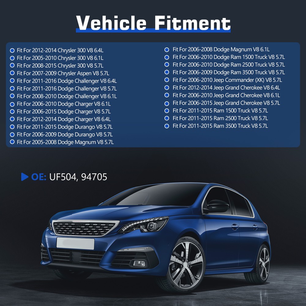 SAFE & SECURE SHOPPING 100% SATISFACTION GUARANTEED FAST SHIPPING Store Categories Store Categories Other Engine Motor Mount Water Pump Ignition coil Power Steering Pump Turbo Starter AC Condenser Headlights Brake Caliper Intercooler Charger Wiring Harness Wire Radiator Alternator Splash Guards Mud Flaps oxygen sensor Throttle Body Timing Chain Drive Shaft Motor Mount Camshaft Kit Control Arms Power Steering Gear Box Window Regulator Power Steering Rack Lift Kits A/C Compressor Side Mirror Compressor Clutches Wheel Bearing Air Suspension Strut Sun Visors You may also like 4PCS Engine Motor & Trans Mount Auto Set For 2007-2017 Nissan Altima 2.5L CVT 61.99 USD 88.56 USD Free shipping 30% off Engine Auto CVT 4pc Motor Mount Set A42027 For Toyota Corolla 2014-2019 1.8L 54.84 USD 78.34 USD Free shipping 30% off New Water Pump For 2012-2019 Explorer Edge Flex Taurus MKS MKX MKT 3.5L 3.7L USA 30.68 USD 43.83 USD Free shipping 30% off 8X Ignition Coil & Spark Plug +Wires Set For Chevy GMC 4.8L 5.3L 6.0L 8.1L UF271 77.45 USD 110.64 USD Free shipping 30% off 4x Motor Trans Mount For Nissan Sentra 2007-2012 L4 2.0L A4348 A4345 A4318 A4346 55.43 USD 79.19 USD Free shipping 30% off 4pcs ignition coils+ 4pcs Iridium Spark Plugs for 2006-2013 Mazda 3 UF540+90083 49.49 USD 70.7 USD Free shipping 30% off 3* Engine Motor Auto Trans Mounts Set For 2016-2018 Chevrolet Malibu 1.5L A5926 73.49 USD 104.99 USD Free shipping 30% off Water Pump For 97-11 Ford Explorer Sport Trac Mustang Mazda Mercury 4.0L V6 12V 41.45 USD 59.21 USD Free shipping 30% off 4 Ignition Coil UF333 & Spark Plug For 2.4L Toyota Camry Corolla RAV4 Lexus 35.49 USD Free shipping Power Steering Pump w/ Pulley for 2003-2007 Honda Accord V6 3.0L Acura MDX Pilot 59.73 USD 85.33 USD Free shipping 30% off 6 Ignition Coil and Spark Plugs Pack for BMW 128i 325i 328i OEM UF592 0221504470 46.79 USD 67.77 USD Free shipping 31% off Engine Motor Mount Kit 4PCS Set For 2007 2008-2011 Toyota Camry LE Sedan 2.4L US 69.57 USD 198.78 USD Free shipping 65% off 8Pack Ignition Coils Spark Plugs Fits 2011-2015 Ram 1500 2500 3500 Truck V8 5.7L Product Description US Warehouse,Fast Delivery! Warranty: limited 5 years warranty - free one time replacement. - Ship within 24 hours - Support 30 days return policy - Reply within 24 hours Contact Us: If you have the following issues, please contact us to get your problems solved: 1. Item Not Received 2. Item Not As Description 3. I Need to Return My Item 4. Pre-sale Inquiry 5. Others 8pcs Ignition Coils + 16pcs Iridium Spark Plugs For Chrysler Specification Condition: Brand New Connector: 3 Pins Package include: 8pcs Ignition Coils + 16pcs Iridium Spark Plugs Interchange Part Number: 5C1569, E1004, 52-1828, 68060346AA, IC584, UF504, UF-504, C1526 56029129AB, 56029129AA, 56029129AF, 68060346AA, 52-1828, GN10352, E1004 Fitment: 2012-2014 Chrysler 300 V8 6.4L 2005-2010 Chrysler 300 V8 6.1L 2008-2015 Chrysler 300 V8 5.7L 2007-2009 Chrysler Aspen V8 5.7L 2011-2016 Dodge Challenger V8 6.4L 2011-2016 Dodge Challenger V8 5.7L 2008-2010 Dodge Challenger V8 6.1L 2006-2010 Dodge Charger V8 6.1L 2006-2015 Dodge Charger V8 5.7L 2012-2014 Dodge Charger V8 6.4L 2011-2015 Dodge Durango V8 5.7L 2006-2009 Dodge Durango V8 5.7L 2005-2008 Dodge Magnum V8 5.7L 2006-2008 Dodge Magnum V8 6.1L 2006-2010 Dodge Ram 1500 Truck V8 5.7L 2006-2010 Dodge Ram 2500 Truck V8 5.7L 2006-2009 Dodge Ram 3500 Truck V8 5.7L 2006-2010 Jeep Commander (XK) V8 5.7L 2012-2014 Jeep Grand Cherokee V8 6.4L 2006-2010 Jeep Grand Cherokee V8 6.1L 2006-2015 Jeep Grand Cherokee V8 5.7L 2011-2015 Ram 1500 Truck V8 5.7L 2011-2015 Ram 2500 Truck V8 5.7L 2011-2015 Ram 3500 Truck V8 5.7L How to Change Ignition Coils and Spark Plugs? This product recommends professional installation. 1. Disconnect the old ignition coil and spark plugs 2. Disconnect your battery’s negative terminal 3. Locate the ignition coil and spark plugs to be replaced. 4. Release the clip on the plug running into the side of coil. 5. Use a wrench to unscrew the bolts holding the original coil in place 6. Extract original ignition coil and spark plugs from the engine bay 7. Swapping in the new ignition coil and spark plugs 8. Prior to installation, compare the new coil to the old one 9. Orient the new coil in the same direction 10. Insert the bolts to hold the coil in place 11. Activate the New ignition coil and spark plugs 12. Connect the plug into the side coil 13. Plug in ignition cables according to the order written on them. 14. Reconnect the battery 15. Start the vehicle to test the new ignition coil and spark plugs Note: 1. In preparation for the replacement, the vehicle should be turned off and cooled for a certain period of time before starting the replacement. 2. Pay attention to the cleanliness of the entire operation, must wipe the ignition coil around the dust and oil, if into the combustion chamber, will have serious adverse effects, try to wear gloves to operate. About Us Payment Shipping Returns Contact Us About Us One-stop auto parts service, your satisfaction is our pursuit. We insist on providing every customer with excellent quality and performance parts to meet all your auto parts needs as much as possible. The combination of quality and professionalism brings new life to your car! Payment We accept all payment methods supported by eBay, including major credit cards, PayPal, and Google Pay. You can choose the payment method that is most convenient for you during checkout. Please pay attention that import duties, taxes and charges are not included in the item price or shipping charges. Shipping We will ship within 24 hours of receiving payment. Our products are stored in multiple overseas warehouses with international shipping options, and usually ship your items via USPS, UPS, FEDEX, DHL etc. US Shipping: New Jersey, Hebron, Perth amboy, Edison(1-3 delivery) . NOTE: The suggested delivery arrival dates on the site are an estimated arrival time and not guaranteed. Returns For all returns